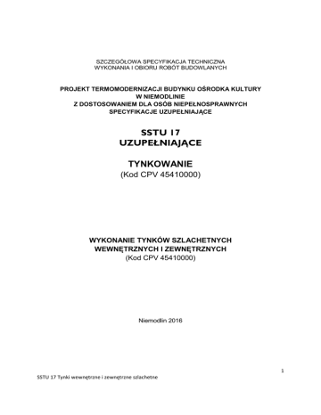 SZCZEGÓŁOWA SPECYFIKACJA TECHNICZNA WYKONANIA I OBIORU ROBÓT BUDOWLANYCH PROJEKT TERMOMODERNIZACJI BUDYNKU OŚRODKA KULTURY W NIEMODLINIE Z DOSTOSOWANIEM DLA OSÓB NIEPEŁNOSPRAWNYCH SPECYFIKACJE UZUPEŁNIAJĄCE SSTU 17 UZUPEŁNIAJĄCE TYNKOWANIE (Kod CPV 45410000) WYKONANIE TYNKÓW SZLACHETNYCH WEWNĘTRZNYCH I ZEWNĘTRZNYCH (Kod CPV 45410000) Niemodlin 2016 1 SSTU 17 Tynki wewnętrzne i zewnętrzne szlachetne SPIS TREŚCI 1. CZĘŚĆ OGÓLNA ............................................................................... 3 2. WYMAGANIA DOTYCZĄCE WŁAŚCIWOŚCI MATERIAŁÓW ........... 6 3. WYMAGANIA DOTYCZĄCE SPRZĘTU, MASZYN I NARZĘDZI ....... 9 4. WYMAGANIA DOTYCZĄCE TRANSPORTU ................................... 10 5. WYMAGANIA DOTYCZĄCE WYKONANIA ROBÓT ........................ 10 6. KONTROLA JAKOŚCI ROBÓT ........................................................ 15 7. WYMAGANIA DOTYCZĄCE PRZEDMIARU I OBMIARU ROBÓT .. 17 8. SPOSÓB ODBIORU ROBÓT ........................................................... 18 9. PODSTAWA ROZLICZENIA ROBÓT ............................................... 20 10. DOKUMENTY ODNIESIENIA ......................................................... 21 Najważniejsze oznaczenia i skróty: ST – Specyfikacja Techniczna SST – Szczegółowa Specyfikacja Techniczna ITB – Instytut Techniki Budowlanej PZJ – Program Zabezpieczenia Jakości 2 SSTU 17 Tynki wewnętrzne i zewnętrzne szlachetne 1. CZĘŚĆ OGÓLNA 1.1. Nazwa nadana zamówieniu przez zamawiającego Termomodernizacja budynku Ośrodka Kultury w Niemodlinie z dostosowaniem dla osób niepełnosprawnych - I etap wymiana zewnętrznej stolarki okiennej i drzwiowej. 1.2. Przedmiot ST Przedmiotem niniejszej szczegółowej specyfikacji technicznej (SST) są wymagania dotyczące wykonania i odbioru tynków szlachetnych wewnętrznych i zewnętrznych. 1.3. Zakres stosowania ST Szczegółowa specyfikacja techniczna dotyczy tynków wewnętrznych i zewnętrznych wykonywanych w ramach zadania z p. 1.1. Nie dotyczy tynków zewnętrznych wykonywanych w ramach systemu ocipleniowego ETICS. Odstępstwa od wymagań podanych w niniejszej specyfikacji mogą mieć miejsce tylko w przypadkach prostych robót o niewielkim znaczeniu, dla których istnieje pewność, że podstawowe wymagania będą spełnione przy zastosowaniu metod wykonania wynikających z doświadczenia oraz uznanych reguł i zasad sztuki budowlanej. 1.4. Przedmiot i zakres robót objętych ST Specyfikacja dotyczy wszystkich czynności mających na celu wykonanie wewnętrznych i zewnętrznych tynków szlachetnych na podkładach z tynków zwykłych. Przedmiotem opracowania jest określenie wymagań odnośnie właściwości materiałów, wymagań w zakresie sposobów oceny podkładów, wymagań dotyczących wykonania tynków szlachetnych oraz ich odbiorów. Specyfikacja nie obejmuje wymagań dotyczących wykonania podkładów z tynków zwykłych, tynków zwykłych, pocienionych z fabrycznie przygotowanych mieszanek tynkarskich, specjalnych (np. akustycznych, przeciwpożarowych), renowacyjnych, stiuków, sgrafitto i suchych tynków. Wymagania dla podkładów z tynków zwykłych określono w specyfikacji technicznej Tynkowanie. Kod CPV 45410000. Wykonanie tynków zwykłych wewnętrznych i zewnętrznych. Kod CPV 45411000. 1.5. Określenia podstawowe, definicje Określenia podane w niniejszej Specyfikacji są zgodne z odpowiednimi normami oraz określeniami podanymi w ST „Wymagania ogólne” Kod CPV 45000000-7, pkt 1.4. Podłoże – powierzchnia elementu konstrukcyjnego lub podkład, na który nakłada się wyprawę. Podkład – warstwa ochronna lub wyrównująca nałożona na powierzchnię elementu budowlanego. Masa tynkarska – masa otrzymywana przez zarobienie wodą lub specjalną substancją suchej mieszanki tynkarskiej. 3 SSTU 17 Tynki wewnętrzne i zewnętrzne szlachetne Sucha mieszanka tynkarska – mieszanka spoiw mineralnych, wypełniaczy, domieszek lub dodatków modyfikujących, ewentualnie pigmentów, przygotowana fabrycznie lub na placu budowy. Pigment – naturalna lub sztuczna substancja barwna lub barwiąca, która nadaje kolor masie tynkarskiej. Tynk szlachetny – powłoka z zaprawy szlachetnej mająca określoną barwę i fakturę, nanoszona ręcznie lub mechanicznie na podkład z tynku zwykłego, ściśle z nim związana i stanowiąca ostateczne wykończenie plastyczne powierzchni, na której została wykonana. Ze względu na technikę wykonania powłoki z zaprawy szlachetnej i sposób obrobienia jej powierzchni (fakturę) rozróżnia się następujące rodzaje i odmiany tynków szlachetnych: a) o fakturze wynikającej z techniki nanoszenia zaprawy – nakrapiane, b) obrabiane w trakcie wiązania zaprawy – zmywane, cyklinowane i gładzone, c) obrabiane po stwardnieniu zaprawy – kamieniarskie, wśród których w zależności od użytych narzędzi rozróżnia się odmiany: nakuwane, młotkowane, szlifowane. Ze względu na wielkości ziarn kruszywa użytego do zaprawy szlachetnej rozróżnia się następujące struktury tynku szlachetnego: a) bardzo drobnoziarnista – uzyskana przy użyciu kruszywa o uziarnieniu do 1,25 mm (tynki gładzone i kamieniarskie), b) drobnoziarnista – uzyskana przy użyciu kruszywa frakcji 1,25÷2,5 mm (tynki gładzone, kamieniarskie, cyklinowane i zmywane), c) średnioziarnista – uzyskana przy użyciu kruszywa frakcji 2,5÷5 mm lub grupy frakcji 1,25÷5 mm (tynki kamieniarskie, cyklinowane i zmywane), d) gruboziarnista – uzyskana przy użyciu kruszywa frakcji 5÷10 mm lub grupy frakcji 2,5÷10 mm (tynki kamieniarskie, cyklinowane i zmywane), W tynkach nakrapianych nie rozróżnia się struktury. Okres przydatności mieszanki – okres w którym sucha mieszanka tynkarska przechowywana w opakowaniu fabrycznym spełnia wymagania odpowiednio do rodzaju mieszanki. 1.6. Ogólne wymagania dotyczące robót Wykonawca robót jest odpowiedzialny za jakość ich wykonania oraz za zgodność z dokumentacj