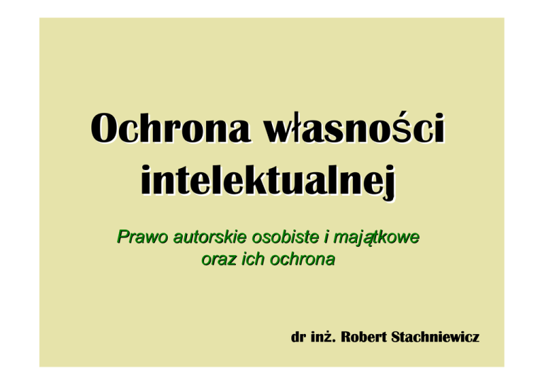 Ochrona własności intelektualnej Prawo autorskie osobiste i majątkowe oraz ich ochrona dr inż. in . Robert Stachniewicz AUTORSKIE PRAWA OSOBISTE (definicja, zastosowanie i ochrona) Autorskie prawa osobiste to zespół uprawnień, jakie przysługują twórcy utworu. Autorskie prawa osobiste chronią „intelektualny” związek twórcy z jego dziełem. Powstają one z chwilą ustalenia utworu (przeniesienia zamysłu twórczego na jakąkolwiek formę, z którą może zapoznać się grupa osób) W prawie polskim pojęcie autorskich praw osobistych reguluje art. 16 "Ustawy o prawie autorskim i prawach pokrewnych" (Dz. U. z 2000 r. Nr 80, poz. 904). Prawo osobiste jest rodzajem szczególnej więzi niezbywalnej i nie podlegającej zrzeczeniu się, łączącej twórcę z jego utworem (podobnie jak np. ojcostwo). Autorskie prawo osobiste nigdy nie wygasa i jest, z natury rzeczy, niezbywalne, nie można się go zrzec ani przenieść na inną osobę. W prawie więź ta wyraża się poprzez niezbywalne prawo do: - autorstwa utworu, (→ np. ojcostwo), - oznaczenia utworu swoim nazwiskiem lub pseudonimem albo do udostępniania go anonimowo, (→ może też producent lub wydawca), - nienaruszalności treści i formy utworu oraz jego rzetelnego wykorzystania, (→ zakazuje wprowadzanie zmian, zniekształceń, przeinaczeń, dodatków oraz wykorzystanie w miejscach i sytuacjach naruszających przesłanie i naruszemie „dobrego imienia” utworu), - decydowania o pierwszym udostępnieniu utworu publiczności, (→ na skutek zmian faktów i wydarzeń lub niedoskonałości dzieła autor może zmienić termin pierwszego udostępnienia), - nadzoru nad sposobem korzystania z utworu. (→ np. projekty architektoniczne czy architektoniczno-urbanistyczne które są realizowane przez inne osoby niż autor), Inne prawa szczegółowe przysługujące autorowi utworu: - sprzeciw przeciwko zniszczeniu dzieła plastycznego, - dostępu do utworu znajdującego się u nabywcy, - wycofania przez twórcę dzieła z obiegu, - odstąpienia od umowy lub jej wypowiedzenie, - przeprowadzenia nadzoru autorskiego przed rozpowszechnieniem utworu. Ochrona autorskich praw osobistych Autorskie prawa osobiste wg. KC podobne do dóbr osobistych → zdrowie, wolność, nazwisko, tajemnica korespondencji, itp. Wniesienie powództwa do sądu o naruszenie p.a. przysługuje: • autorowi (za życia), • zstępnym (rodzinie, ew. stowarzyszeniom i organizacjom zarządzających p.a. Przepisy o ochronie osobistych praw autorskich są zawarte w: - Kodeksie cywilnym, - Ustawie o prawie autorskim i prawach pokrewnych (Dz.U. 1994 Nr 24 poz.83 z późniejszymi zmianami). - Ustawie o zwalczaniu nieuczciwej konkurencji (Dz.U. nr 47 poz. 211). Zgodnie z przepisem art. 24 kodeksu cywilnego ten, czyje dobro osobiste zostaje zagrożone cudzym działaniem, może żądać: - zaniechania tego działania (chyba, że nie jest ono bezprawne i nie stwierdzono niebezpieczeństwa naruszenia dóbr osobistych autora), - usunięcia jego skutków (w szczególności ażeby złożyła oświadczenie odpowiedniej treści i w odpowiedniej formie np. sprostowanie, przeprosiny, ogłoszenia wyroku w mediach, dokonania zmian w dziele lub we wszystkich jego egzemplarzach, itp.), - zadośćuczynienia pieniężnego lub zapłaty – z orzeczenia sądu odpowiedniej sumy pieniężnej dla autora lub na wskazany cel społeczny z doznaną krzywdę (niezależnie od innych środków potrzebnych do usunięcia skutków naruszenia). Zgodnie z przepisem Ustawy o zwalczaniu nieuczciwej konkurencji przewiduje dwa reżimy z tytułu dopuszczenia się czynu nieuczciwej konkurencji: cywilnoprawny, skupiający się na szeroko rozumianym odszkodowaniu i interesach majątkowych poszkodowanego oraz reżim karny, zmierzający do ukarania sprawcy naruszenia. W zakresie roszczeń cywilnych, w razie dokonania czynu nieuczciwej konkurencji, przedsiębiorca, którego interes został zagrożony lub naruszony, może żądać: - zaniechania niedozwolonych działań, - usunięcia skutków niedozwolonych działań, - złożenia jednokrotnego lub wielokrotnego oświadczenia odpowiedniej treści i w odpowiedniej formie, - naprawienia wyrządzonej szkody, na zasadach ogólnych, - wydania bezpodstawnie uzyskanych korzyści, na zasadach ogólnych, - zasądzenia odpowiedniej sumy pieniężnej na określony cel społeczny związany ze wspieraniem kultury polskiej lub ochroną dziedzictwa narodowego - jeżeli czyn nieuczciwej konkurencji był zawiniony. Zgodnie z przepisem art. 78 Ustawy o prawie autorskim i prawach pokrewnych ten, czyje dobro osobiste zostaje zagrożone cudzym działaniem, może żądać: Uprawniony, którego autorskie prawa osobiste zostały naruszone, może żądać od osoby, która naruszyła te prawa: - zaniechania naruszania, - usunięcia skutków naruszenia, - zadośćuczynienia pieniężnego. (w/w czynności jak w KC). AUTORSKIE PRAWA MAJĄTKOWE (definicja, zastosowanie i ochrona) Autorskie prawa majątkowe (ang. Copyright → ) zespół uprawnień, jakie przysługują twórcy utworu, ze szczególnym uwzględnieniem kwestii ekonomicznych tych uprawnień (albo w określonych przypadkach wydawcy lub producenta). W prawie polskim pojęcie autorskich praw majątkowych reguluje art. 17 (i dalsze) "Ustawy o prawie autorskim i prawach pokrewnych" to monopol praw majątkowych na rzecz autora utworu. Do praw tych zalicza się: wyłączne prawo do korzystania z utworu, dowolnego rozporządzania nim na wszystkich polach eksploatacji, wynagrodzenia za korzystanie z utworu. Wyłączne prawo do korzystania z utworu – prawo do korzystania z korzyści ekonomicznych i zawodowych wynikających z wyniku intelektualnego chronionego prawem. (powstaje: pośrednio – decyzja urzędu patentowego na podstawie norm prawnych; bezpośrednio – na podstawie ustaw, konwencji oraz porozumień międzynarodowych) Pole eksploatacji utworu – to działalność, w której przysługuje twórcy wyłączne prawo do korzysta