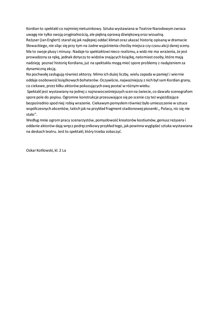 Kordian to spektakl co najmniej nietuzinkowy. Sztuka wystawiana w Teatrze Narodowym zwraca uwagę nie tylko swoją oryginalnością, ale piękną oprawą dźwiękową oraz wizualną. Reżyser (Jan Englert) starał się jak najlepiej oddać klimat oraz ukazać historię opisaną w dramacie Słowackiego, nie siląc się przy tym na żadne wyjaśnienia choćby miejsca czy czasu akcji danej sceny. Ma to swoje plusy i minusy. Nadaje to spektaklowi nieco realizmu, a widz nie ma wrażenia, że jest prowadzony za rękę, jednak dotyczy to widzów znających książkę, natomiast osoby, które mają nadzieję poznać historię Kordiana, już na spektaklu mogą mieć spore problemy z nadążeniem za dynamiczną akcją. Na pochwałę zasługują również aktorzy. Mimo ich dużej liczby, wielu zapada w pamięć i wiernie oddaje osobowość książkowych bohaterów. Oczywiście, najważniejszy z nich był sam Kordian grany, co ciekawe, przez kilku aktorów pokazujących ową postać w różnym wieku. Spektakl jest wystawiany na jednej z najnowocześniejszych scen na świecie, co dawało scenografom spore pole do popisu. Ogromne konstrukcje przesuwające się po scenie czy też wyjeżdżające bezpośrednio spod niej robią wrażenie. Ciekawym pomysłem również było umieszczenie w sztuce współczesnych akcentów, takich jak na przykład fragment stadionowej piosenki „ Polacy, nic się nie stało”. Według mnie ogrom pracy scenarzystów, pomysłowość kreatorów kostiumów, geniusz reżysera i oddanie aktorów dają wręcz podręcznikowy przykład tego, jak powinna wyglądać sztuka wystawiana na deskach teatru. Jest to spektakl, który trzeba zobaczyć. Oskar Kotłowski, kl. 2 La