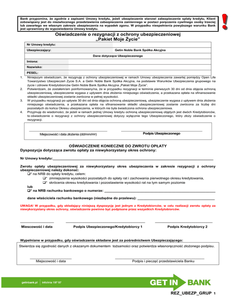 Bank przypomina, że zgodnie z zapisami Umowy kredytu, jeżeli ubezpieczenie stanowi zabezpieczenie spłaty kredytu, Klient zobowiązany jest do niezwłocznego przedstawienia zabezpieczenia zamiennego w postaci poręczenia cywilnego osoby trzeciej lub zawartego we własnym zakresie ubezpieczenia na wypadek zgonu. W przypadku niespełnienia powyższego warunku Bank jest uprawniony do wypowiedzenia Umowy kredytu. Oświadczenie o rezygnacji z ochrony ubezpieczeniowej „Pakiet Moje Życie” Nr Umowy kredytu: Ubezpieczający: Getin Noble Bank Spółka Akcyjna Dane dotyczące Ubezpieczonego Imiona: Nazwisko: PESEL: 1. 2. 3. 4. Niniejszym oświadczam, że rezygnuję z ochrony ubezpieczeniowej w ramach Umowy ubezpieczenia zawartej pomiędzy Open Life Towarzystwo Ubezpieczeń Zycie S.A. a Getin Noble Bank Spółka Akcyjna, na podstawie Warunków Ubezpieczenia grupowego na życie i zdrowie Kredytobiorców Getin Noble Bank Spółka Akcyjna „Pakiet Moje Życie”. Potwierdzam, że zostałem/am poinformowany/na, że w przypadku rezygnacji w terminie pierwszych 30 dni od dnia objęcia ochroną ubezpieczeniową, ubezpieczenie wygasa z upływem dnia złożenia niniejszego oświadczenia, a przekazana opłata na sfinansowanie składki ubezpieczeniowej zostanie zwrócona w pełnej wysokości. W przypadku rezygnacji po upływie 30 dni od dnia objęcia ochroną ubezpieczeniową, ubezpieczenie wygasa z upływem dnia złożenia niniejszego oświadczenia, a przekazana opłata na sfinansowanie składki ubezpieczeniowej zostanie zwrócona za liczbę dni pozostałych do końca Okresu ubezpieczenia, w których nie była świadczona ochrona ubezpieczeniowa. Przyjmuję do wiadomości, że jeżeli w ramach jednej Umowy kredytu ochroną ubezpieczeniową objętych jest dwóch Kredytobiorców, to oświadczenie o rezygnacji z ochrony ubezpieczeniowej dotyczy wyłącznie tego Ubezpieczonego, który złoży oświadczenie o rezygnacji. Podpis Ubezpieczonego Miejscowość i data złożenia (dd/mm/rrrr) OŚWIADCZENIE KONIECZNE DO ZWROTU OPŁATY Dyspozycja dotycząca zwrotu opłaty za niewykorzystany okres ochrony: Nr Umowy kredytu:_________________________________________________________________________________ Zwrotu opłaty ubezpieczeniowej za niewykorzystany okres ubezpieczenia w zakresie rezygnacji z ochrony ubezpieczeniowej należy dokonać: * na NRB do spłaty kredytu, celem: * zmniejszenia wysokości pozostałych do spłaty rat i zachowania pierwotnego okresu kredytowania, * skrócenia okresu kredytowania i pozostawienie wysokości rat na tym samym poziomie lub * na NRB rachunku bankowego o numerze: ________________________________________________________ dane właściciela rachunku bankowego (niezbędne do przelewu): _______________________________________ UWAGA! W przypadku, gdy składający niniejszą dyspozycję jest jednym z Kredytobiorców, w celu realizacji zwrotu opłaty za niewykorzystany okres ochrony, oświadczenie powinno być podpisane przez wszystkich Kredytobiorców. _________________ ________________________________________ Miescowość i data Podpis Ubezpieczonego/Kredytobiorcy 1 _____________________________ Podpis Kredytobiorcy 2 Wypełniane w przypadku, gdy oświadczenie składane jest za pośrednictwem Ubezpieczającego: Stwierdza się zgodność danych z okazanym dokumentem tożsamości oraz potwierdza własnoręczność złożonego podpisu. _____________________ Miejscowość i data _____________________________________________ Podpis i pieczęć przedstawiciela Banku REZ_UBEZP_GRUP 1