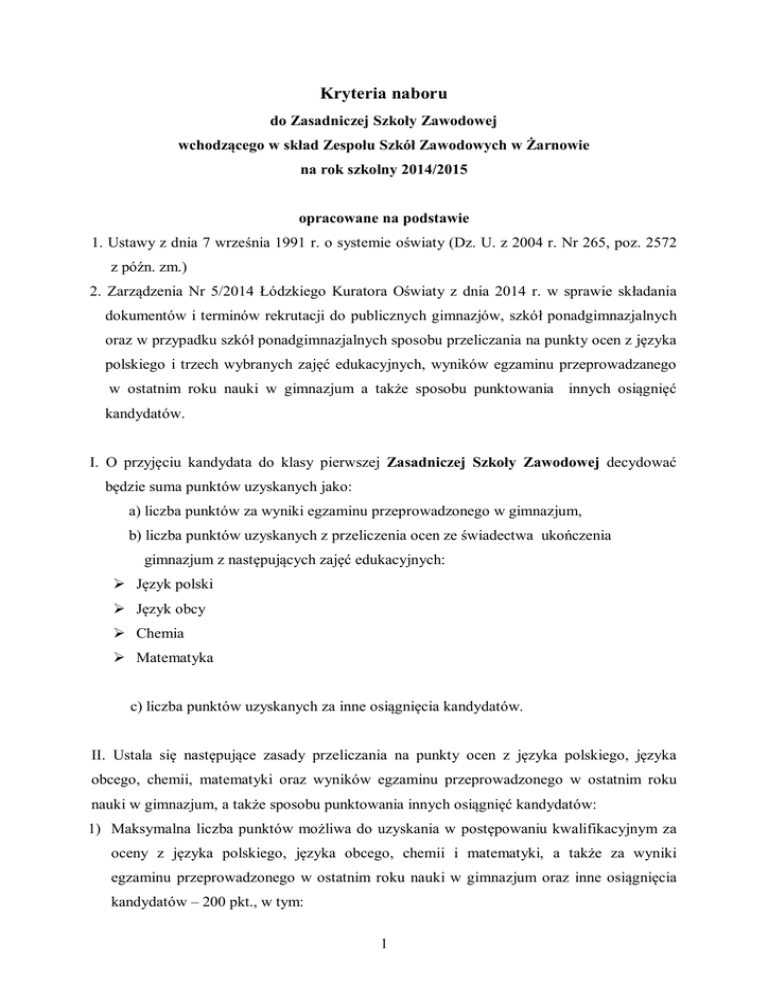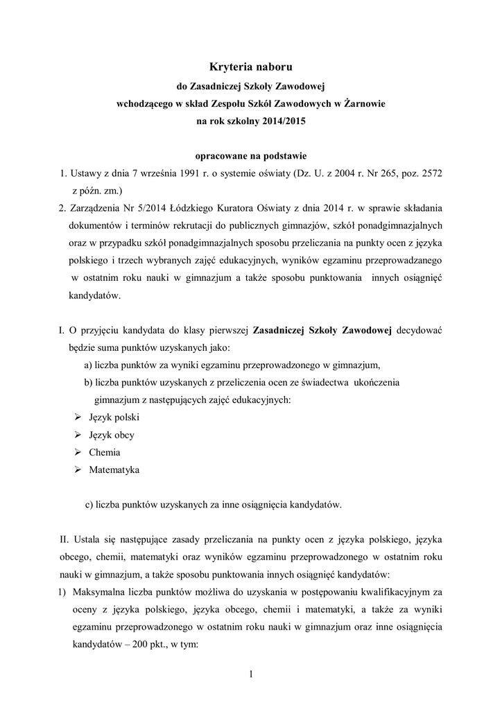 Kryteria naboru - Zespół Szkół Zawodowych w Żarnowie