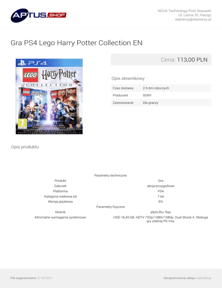 NOVA Technology Piotr Nowacki Ul. Leśna 20, Raciąż [email protected] Gra PS4 Lego Harry Potter Collection EN Cena: 113,00 PLN Opis słownikowy Czas dostawy 2-5 dni roboczych Producent SONY Zastosowanie Dla graczy Opis produktu Parametry techniczne Produkt Gra Gatunek akcja/przygodowe Platforma PS4 Kategoria wiekowa od 7 lat Wersja językowa EN Parametry fizyczne Nośnik płyta Blu- Ray Minimalne wymagania systemowe HDD 16,43 GB. HDTV 720p/1080i/1080p. Dual Shock 4. Obsługa gry zdalnej PS Vita. Plik wygenerowano: 01-03-2017 Powered by TCPDF (www.tcpdf.org) Oprogramowanie sklepu: AptusShop
