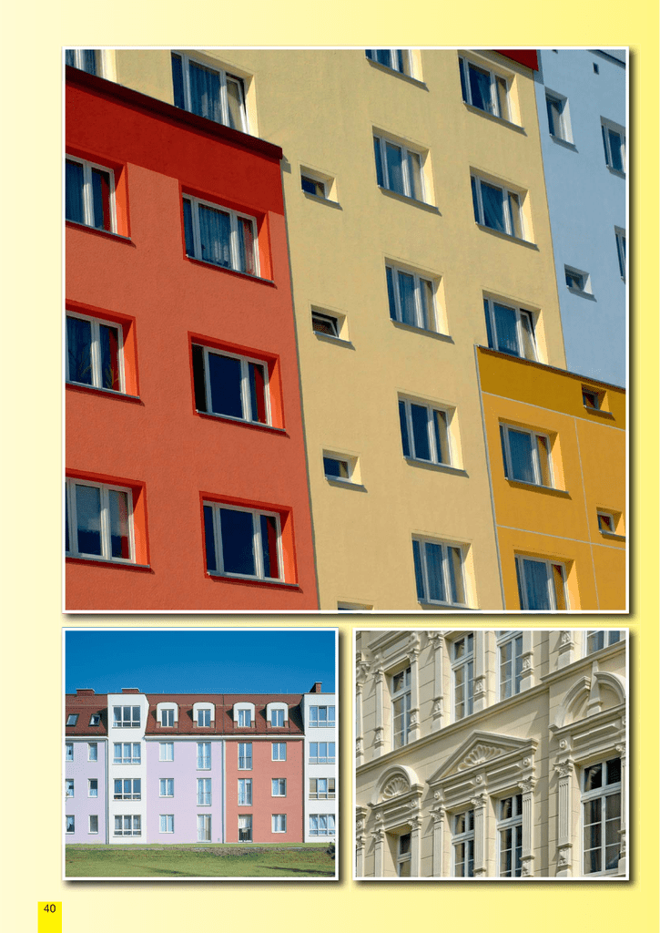 40 Farby Farby fasadowe silikatowe 42 Farby fasadowe siloksanowe 42 Farby fasadowe silikonowe 42 Farby fasadowe akrylowe 43 Farby wewnętrzne mineralne 43 Farby wewnętrzne akrylowe 44 Środki czyszczące / impregnaty 44 41 Farby Farby fasadowe silikatowe LK 300 Farba silikatowa fasadowa Silikatowa, dyfuzyjna, matowa farba elewacyjna na bazie szkła wodnego potasowego. Zalecana do malowania fasad remontowanych obiektów zabytkowych oraz elewacji w systemach ociepleń Lobatherm. Ze względu na wysoką paroprzepuszczalność zalecana do malowania tynków renowacyjnych Tubag oraz quick-mix. Odporna na agresję mikrobiologiczną, wysokokryjąca. Kolory zgodne z paletą kolorystyczną quick-mix – Kolekcja A. Zużycie ok. 0,2 l/m2 na 1 warstwę. Numer produktu Opakowania w l Ilość na palecie – Grupa dostawy biały 86108 15 24 – C kolor 86845+ nr kol. A 15 24 – A Produkt LK 300 AT-15-4310/2012 AT-15-4309/2012 AT-15-6730/2008 Farby fasadowe siloksanowe LX 300 Farba siloksanowa fasadowa Siloksanowa, dyfuzyjna farba elewacyjna, wysokokryjąca, hydrofobowa, bezskurczowa. Mało podatna na zabrudzenia, zapewniająca długotrwałą ochronę fasady. Zalecana do systemów ociepleń QUICK-MIX LOBATHERM. Stosowana na zewnątrz jako powłoka malarska i egalizacyjna. Kolory zgodne z paletą kolorystyczną quick-mix – Kolekcja A i B. Zużycie ok. 0,2 l/m2 na 1 warstwę. LX 300 biały 86540 kolory z kolekcji A/B 86840+ nr kol. A/B AT-15-4310/2012 AT-15-4309/2012 AT-15-6730/2008 15 24 – A 15 24 – A Farby fasadowe silikonowe LX 350 Farba silikonowa fasadowa AT-15-4310/2012 AT-15-4309/2012 Silikonowa wysokokryjąca farba elewacyjna, z bardzo dobrą odpornością na zabrudzenia. Zalecana do malowania fasad remontowanych obiektów zabytkowych oraz elewacji w systemach ociepleń QUICK-MIX LOBATHERM. Otwarta na dyfuzję pary wodnej, hydrofobowa, bezskurczowa, wypełniająca rysy do 0,2 mm. Kolory zgodne z paletą kolorystyczną quick-mix – Kolekcja A i B. Zużycie ok. 0,2 l/m2 na 1 warstwę. LX 350 42 biały 85254 kolory z kolekcji A/B 85252+ nr kol. A/B 15 24 – C 15 24 – C Farby Farby fasadowe akrylowe LA 300 Farba akrylowa fasadowa Akrylowa farba elewacyjna, wysokokryjąca, jedwabisto-matowa. Odporna na warunki atmosferyczne, wytrzymała mechanicznie, bezskurczowa. Umożliwia uzyskanie bardzo intensywnych kolorów. Kolory zgodne z paletą kolorystyczną quick-mix – Kolekcja A i B. Zużycie ok. 0,2 l/m2 na 1 warstwę. Produkt LA 300 Numer produktu biały 86528 kolory z kolekcji A/B 86828+ nr kol. A/B Opakowania w l Ilość na palecie – Grupa dostawy 15 24 – C 15 24 – C Farby wewnętrzne mineralne LI 400 Farba krzemianowa wewnętrzna Krzemianowa farba wewnętrzna, wspomagająca regulację mikroklimatu w pomieszczeniu, hypoalergiczna. Do stosowania na podłoża mineralne, zalecana na tynki wapienne i cementowo-wapienne np. quick-mix MKK, MK leicht, MKE i inne. Szczególnie zalecana na tynki renowacyjne wewnątrz obiektów zabytkowych. Bezrozpuszczalnikowa, bezemisyjna, niezawierająca środków konserwujących. Wysokodyfuzyjna dla pary wodnej i CO2. Stosowana do wnętrz. Kolory zgodnie z paletą kolorystyczną quick-mix – Kolekcja A. Zużycie: ok 0,2 l/m2 na 1 warstwę. LI 400 Klasa ścieralności: II biały 87955 15 24 – C kolory z kolekcji A 87954+ nr kol. A 15 24 – C – C P 450 BIO Farba wapienna wewnętrzna Czysto wapienna farba wewnętrzna, hypoalergiczna, wysokodyfuzyjna. Odporna na zmywanie, nie zawiera rozpuszczalników i substancji konserwujących. Zalecana na tynki mineralne: wapienne, wapienno-gipsowe, gipsowe, cementowe i cementowo-wapienne. Szczególnie zalecana na tynki renowacyjne wewnątrz obiektów zabytkowych. Stosowana do wnętrz. Kolor: śnieżno-biały. Zużycie: ok 0,2 kg/m2 na 1 warstwę. P 450 biały 96739 10 kg 96 43 Farby Farby wewnętrzne akrylowe LI 194 Farba wewnętrzna Niezawierająca rozpuszczalników, dyspersyjna farba wewnętrzna o dobrych właściwościach kryjących. Matowa, do wnętrz. Kolor: biały. Zużycie: ok. 0,15-0,2 l/m2 w zależności od rodzaju podłoża przy jednokrotnym malowaniu. Produkt LI 194 biały Numer produktu Opakowania w l Ilość na palecie – Grupa dostawy 86512 15 24 – C LI 206 Farba wewnętrzna śnieżnobiała Niezawierająca rozpuszczalników, dyspersyjna farba wewnętrzna o najwyższym stopniu krycia. Matowa, do wnętrz. Kolor śnieżnobiały lub barwiony w masie zgodnie z paletą kolorystyczną quick-mix – Kolekcja A i B. Zużycie: ok. 0,15-0,2 l/m2 w zależności od rodzaju podłoża przy jednokrotnym malowaniu. LI 206 biały 86516 kolory z kolekcji A/B 87953+ nr kol. A/B 15 24 – C 15 24 – C Środki czyszczące / impregnaty LOBA-Ex Środek do usuwania alg i grzybów Płynny środek czyszczący do usuwania grzybów i alg z porażonych murów, kamieni naturalnych, fasad i innych powierzchni zewnętrznych. Gotowy do użycia. Zużycie: ok. 0,1-0,2 l/m2 w zależności od rodzaju podłoża. LOBA-Ex 86547 5l – – C LOBAXIN-S Środek do zabezpieczania murów Środek do zabezpieczania powierzchni przed powstawaniem i rozwojem grzybów, pleśni i glonów. Nie zawiera ciężkich metali i fenoli. Gotowy do użytku. Stosowany na zewnątrz. Zużycie: ok. 0,5 l/m2 w zależności od rodzaju podłoża. LOBAXIN-S 44 86548 10 l – – C Farby Paleta kolorów w postaci wydrukowanej Z kolorami w naszym otoczeniu spotykamy się codziennie na każdym kroku. Kolory kształtują wygląd obiektów i nasze „spojrzenie” na otaczający nas świat. Asortyment firmy quick-mix jest „kolorowy”, tak jak szeroka jest paleta kolorystyczna barwionych w masie tynków strukturalnych. Dotyczy to również farb quick-mix: mineralnych, silikatowych, siloksanowych, silikonowych i akrylowych. Kolekcja A Składa się z odcieni stosowanych głównie dla tynków i farb mineralnych oraz silikatowych. Jednocześnie w ofercie są dostępne inne tynki i farby organiczne w tych samych kolorach. Kolekcja B Znajdują się tu odcienie, w których konc