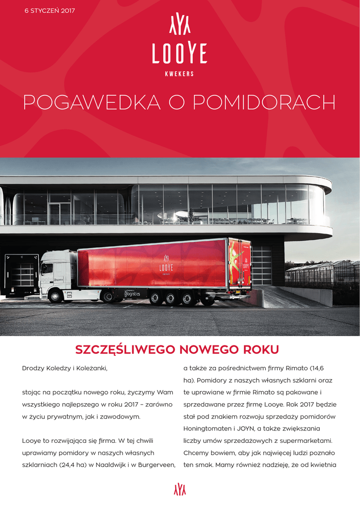 6 STYCZEŃ 2017 POGAWEDKA O POMIDORACH SZCZĘŚLIWEGO NOWEGO ROKU Drodzy Koledzy i Koleżanki, a także za pośrednictwem firmy Rimato (14,6 ha). Pomidory z naszych własnych szklarni oraz stojąc na początku nowego roku, życzymy Wam te uprawiane w firmie Rimato są pakowane i wszystkiego najlepszego w roku 2017 – zarówno sprzedawane przez firmę Looye. Rok 2017 będzie w życiu prywatnym, jak i zawodowym. stał pod znakiem rozwoju sprzedaży pomidorów Honingtomaten i JOYN, a także zwiększania Looye to rozwijająca się firma. W tej chwili liczby umów sprzedażowych z supermarketami. uprawiamy pomidory w naszych własnych Chcemy bowiem, aby jak najwięcej ludzi poznało szklarniach (24,4 ha) w Naaldwijk i w Burgerveen, ten smak. Mamy również nadzieję, że od kwietnia 2017 roku rozpoczniemy sprzedaż naszego Wspólnie postaramy się, aby był to piękny rok! własnego keczupu Honingtomaten w sklepach warzywnych w Holandii i Belgii. Wewnątrz firmy będziemy koncentrować się na ulepszaniu jakości naszych pomidorów, zmniejszaniu marnotrawstwa, ale także poświęcaniu większej uwagi naszej kontroli jakości. GRILLOWANE WARZYWA Z DRESSINGIEM POMIDOROWYM W celu pomocy w realizacji Waszych (ewentualnych) dobrych zamiarów chcemy podzielić się z Wami smacznym i zdrowym przypisem (numerem dwa na targach Allerhande): grillowane warzywa z pieca z dressingiem pomidorowym. SKŁADNIKI: • 12 marchwi • 2 pudełka pomidorków Subliem (4 gałązki) • 1 czerwona cebula • 1 żółta papryka • 1 cukinia • 3 g świeżego rozmarynu • 1 szalotka • 1 ząbek czosnku • 1/3 czerwonej papryki • 4 łyżka oliwy z oliwek extra virgin SPOSÓB PRZYGOTOWANIA: Rozgrzej piekarnik do 200°. Pokrój marchew i rozłóż ją razem z pomidorkami Subliem na gałązce na blasze do pieczenia. Pokrop 2 łyżkami oliwy z oliwek i piecz przez 20 minut. W międzyczasie pokrój cebulę w krążki, a paprykę i cukinię pokrój w kostkę. Wyciągnij pomidorki z pieca. Włóż cebulę, paprykę i cukinię do marchwi na blasze do pieczenia. Pokrop 1 łyżką oliwy z oliwek i piecz przez 15 minut. Przy użyciu robota kuchennego zmiksuj połowę pomidorów, szalotkę, czosnek, rozmaryn, czerwoną paprykę i 1 łyżkę oliwy z oliwek na sos. Pozostałe pomidorki połóż włóż na ostatnie 3 minuty na blachę do pieca. Podaj warzywa z dressingiem pomidorowym. KILKA SŁÓW O SOBIE… Chantal Stolze Nowy rok przyniósł nam kilku nowych kolegów. Będziemy kolejno poznawać ich w najbliższych wydaniach „Pogawędki o Pomidorach”. Jako pierwsza przedstawi się Wam Chantal Stolze, która wchodzi w skład zespołu pakowni. Witamy w naszej firmie! Czym dokładnie będziesz się zajmować w Looye? Cześć, dziękuję! W firmie Looye będę pracować na stanowisku planisty. Przejmę obowiązki Mervyna, dzięki czemu będzie on mógł skupić się bardziej na innych rzeczach. Mój dzień będzie częściowo składał się z kontrolowania zapasów i dostosowywania do ich poziomu zamówień z następnego dnia, a następnie przetwarzania tych wszystkich informacji w postaci harmonogramu pracy dla pracowników pakowni. Oprócz tego przejmę zadania działu pakowania. Jakie? Tego jeszcze nie wiem. Opowiedz trochę więcej o sobie. Kim jest Chantal? Mam 25 lat i od urodzenia mieszkam w De Lier. Od nieco mniej niż roku mieszkam wspólnie z chłopakiem Denniem van Holsteinem w de Trompet. Przez ostatnie 3,5 roku pracowałam jako koordynator zamówień w VTM – firmie, która obecnie dostarcza telefony stacjonarne i komórkowe firmie Looye. Oprócz pracy chętnie zajmuje się sportem; prowadzę zajęcia spinningu, a także lubię kolarstwo, kitesurfing i jazdę na snowboardzie. Dużo szczęścia sprawia mi również dobra książka, dobry film i smaczne jedzenie! Jakie są twoje pierwsze wrażenia z pracy w Looye? Pod względem społeczny i koleżeńskim: podczas rundki zapoznawczej każdy poświęcił mi czas na krótką rozmowę i od razu dało się odczuć, że wszyscy traktują się tutaj dobrze i z szacunkiem. Jakość jest najważniejsza. Widać to po produktach, ale również po sposobie, w jaki odbywa się wdrożenie do pracy. Uwagę poświęca się wielu rzeczom, co ostatecznie będzie korzystne dla jakości. Jak do tej pory pierwsze wrażenie jest w każdym razie bardzo pozytywne! Jak wyglądałby twój wymarzony weekend? Świeci słońce i wieje wiatr! Rano po pysznym śniadanku jadę na plażę, aby uprawiać kitesurfing z grupką znajomych. Potem jeszcze przyjemne opalanie się na słońcu, a wieczorem wszyscy przyjaciele i rodzina są zaproszeni na drinka i pyszne jedzenie. A potem… imprezowanie do późnych godzin nocnych, gra w karty i... byłabym wtedy szczęśliwa! CO TO W ZASADZIE JEST LIKOPEN? Tekst: Niels Roodenrijs & Tina Tsaparas i owoców, które zawierają likopen, może mieć pozytywny wpływ na zdrowie. Organizm ludzki W tym blogu wiele pisano już o korzyściach nie jest w stanie samodzielnie wytwarzać tej sub- zdrowotnych związanych z regularnym jedzeni- stancji, ale pozyskuje ją z pożywienia roślinnego. em pomidorów. W przypadku objaśniania tych Likopen działa w organizmie jako antyoksydant. korzyści wciąż pojawia się jednak jedno mag- Oznacza to, że tworzy on połączenia z substanc- iczne słówko – likopen. Czym jest ta cudowna jami, które są szkodliwe dla ludzkich komórek w substancja i jak dokładnie działa? organizmie. Uszkodzenie tych komórek odgrywa rolę w przypadku powstawania nowotworów. Likopen zalicza się do substancji fitoodżywczych: Oprócz tego badania wykazały, że likopen grupy substancji roślinnych, które odpowiadają odgrywa rolę podczas obniżania zagrożenia za realizację określonych procesów lub pełnią chorób serca i naczyń wieńcowych. pewną funkcję w organizmie. Likopen sprawia również, że pomidory mają czerwony kolor. Zaleca się przyjmowanie likopenu w form- Likopen powstaje bowiem podczas procesu ie świeżych prod