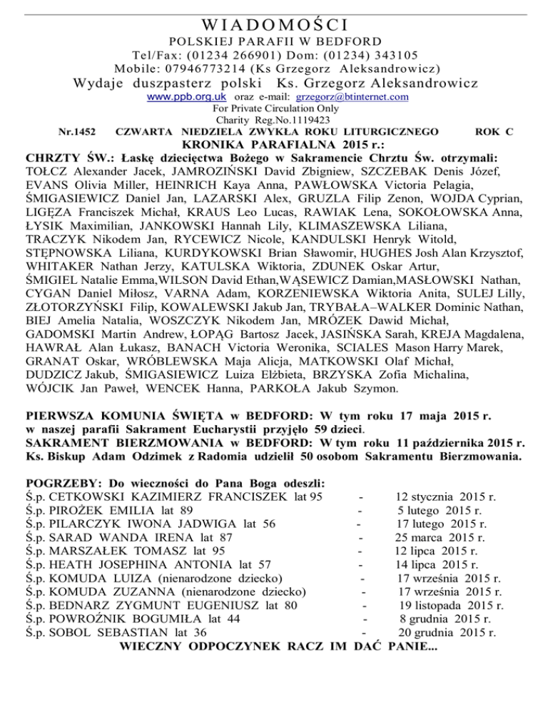 WIADOMOŚCI POLSKIEJ PARAFII W BEDFORD Tel/Fax: (01234 266901) Dom: (01234) 343105 Mobile: 07946773214 (Ks Grzegorz Aleksandrowicz) Wydaje duszpasterz polski Nr.1452 Ks. Grzegorz Aleksandrowicz www.ppb.org.uk oraz e-mail: [email protected] For Private Circulation Only Charity Reg.No.1119423 CZWARTA NIEDZIELA ZWYKŁA ROKU LITURGICZNEGO ROK C KRONIKA PARAFIALNA 2015 r.: CHRZTY ŚW.: Łaskę dziecięctwa Bożego w Sakramencie Chrztu Św. otrzymali: TOŁCZ Alexander Jacek, JAMROZIŃSKI David Zbigniew, SZCZEBAK Denis Józef, EVANS Olivia Miller, HEINRICH Kaya Anna, PAWŁOWSKA Victoria Pelagia, ŚMIGASIEWICZ Daniel Jan, LAZARSKI Alex, GRUZLA Filip Zenon, WOJDA Cyprian, LIGĘZA Franciszek Michał, KRAUS Leo Lucas, RAWIAK Lena, SOKOŁOWSKA Anna, ŁYSIK Maximilian, JANKOWSKI Hannah Lily, KLIMASZEWSKA Liliana, TRACZYK Nikodem Jan, RYCEWICZ Nicole, KANDULSKI Henryk Witold, STĘPNOWSKA Liliana, KURDYKOWSKI Brian Sławomir, HUGHES Josh Alan Krzysztof, WHITAKER Nathan Jerzy, KATULSKA Wiktoria, ZDUNEK Oskar Artur, ŚMIGIEL Natalie Emma,WILSON David Ethan,WĄSEWICZ Damian,MASŁOWSKI Nathan, CYGAN Daniel Miłosz, VARNA Adam, KORZENIEWSKA Wiktoria Anita, SULEJ Lilly, ZŁOTORZYŃSKI Filip, KOWALEWSKI Jakub Jan, TRYBAŁA–WALKER Dominic Nathan, BIEJ Amelia Natalia, WOSZCZYK Nikodem Jan, MRÓZEK Dawid Michał, GADOMSKI Martin Andrew, ŁOPĄG Bartosz Jacek, JASIŃSKA Sarah, KREJA Magdalena, HAWRAŁ Alan Łukasz, BANACH Victoria Weronika, SCIALES Mason Harry Marek, GRANAT Oskar, WRÓBLEWSKA Maja Alicja, MATKOWSKI Olaf Michał, DUDZICZ Jakub, ŚMIGASIEWICZ Luiza Elżbieta, BRZYSKA Zofia Michalina, WÓJCIK Jan Paweł, WENCEK Hanna, PARKOŁA Jakub Szymon. PIERWSZA KOMUNIA ŚWIĘTA w BEDFORD: W tym roku 17 maja 2015 r. w naszej parafii Sakrament Eucharystii przyjęło 59 dzieci. SAKRAMENT BIERZMOWANIA w BEDFORD: W tym roku 11 października 2015 r. Ks. Biskup Adam Odzimek z Radomia udzielił 50 osobom Sakramentu Bierzmowania. POGRZEBY: Do wieczności do Pana Boga odeszli: Ś.p. CETKOWSKI KAZIMIERZ FRANCISZEK lat 95 Ś.p. PIROŻEK EMILIA lat 89 Ś.p. PILARCZYK IWONA JADWIGA lat 56 Ś.p. SARAD WANDA IRENA lat 87 Ś.p. MARSZAŁEK TOMASZ lat 95 Ś.p. HEATH JOSEPHINA ANTONIA lat 57 Ś.p. KOMUDA LUIZA (nienarodzone dziecko) Ś.p. KOMUDA ZUZANNA (nienarodzone dziecko) Ś.p. BEDNARZ ZYGMUNT EUGENIUSZ lat 80 Ś.p. POWROŹNIK BOGUMIŁA lat 44 Ś.p. SOBOL SEBASTIAN lat 36 WIECZNY ODPOCZYNEK RACZ IM 12 stycznia 2015 r. 5 lutego 2015 r. 17 lutego 2015 r. 25 marca 2015 r. 12 lipca 2015 r. 14 lipca 2015 r. 17 września 2015 r. 17 września 2015 r. 19 listopada 2015 r. 8 grudnia 2015 r. 20 grudnia 2015 r. DAĆ PANIE... Niedziela, 31.1.2016 r Godz. 9.30 Godz.11.00 Godz.19.00 Poniedziałek,1.2.2016Godz. 9.30 Wtorek, 2.2.2016 Godz. 9.30 Godz.19.00 Środa, 3.2.2016 Godz. 9.30 CZWARTA NIEDZIELA ZWYKŁA ROKU LITURGICZNEGO Rok C - za dusze ś.p. Reginy Chmurskiej w 6-tą rocznicę śmierci - int. rodziny. - za dusze ś.p. Heleny i Mariana Stoch - int. syna z żoną. - Intencja wolna - Intencja wolna. - OFIAROWANIE PAŃSKIE - MATKI BOŻEJ GROMNICZNEJ - za dusze ś.p. Sebasiana Sobół - int. Pana Mieczysława. - Intencja wolna. - Intencja wolna. Czwartek, 4.2.2016 Godz. 9.30 - Intencja wolna. Godz.13.00 - Msza swięta żałobna i Pogrzeb ś.p. Genowefy Zofii Feń. Piątek, 5.2. 2016 - PIERWSZY PIĄTEK miesiąca LUTEGO. Św. Agaty Godz.15.00 - O błogosławieństwo Boże i łaskę przyjmowania Komunii św. dla rodziny. Koronka do Miłosierdzia Bożego. Godz.18.00 - SPOWIEDŹ ŚWIĘTA. Godz.19.00 - Intencja wolna. Sobota, 6.2. 2016 Godz. 9.30 - Intencja wolna. Św. Pawła Miki Godz.10.00 - SPOWIEDŹ ŚWIĘTA. ADORACJA NAJSWIĘTSZEGO SAKRAMENTU. Godz.19.00 za ś.p.Rafała Miśkiewicz z ok.urodzin–int.rodz.Kułaków,Siewierskich i Broniewiczó Niedziela, 7.2.2016 PIĄTA NIEDZIELA ZWYKŁA ROKU LITURGICZNEGO Rok C Godz. 9.30 - za dusze ś.p.Mirosława Kudlińskiego w 2-gą rocz. śmierci – int. P.Mieczysława. Godz.11.00 - O nawrócenie i uzdrowienie Ani. Godz.18.00 - ADORACJA NAJŚWIĘTSZEGO SAKRAMENTU. Godz.19.00 - za dusze ś.p. Zenona i Stanisławy Skiba - int. córki. OGŁOSZENIA PARAFIALNE: 1. Dzisiaj po Mszy św.wieczornej (godz.19.00) odbędzie się Katecheza dla kandydatów do Sakramentu Bierzmowania 2. We wtorek 2 lutego przypada święto Ofiarowania Pańskiego. Podczas Mszy św. będzie poswięcemie gromnic. 3. W ten piątek o godz. 18.00 odbędzie się zebranie dla ministrantów. 4. W sobotę 6 lutego o godz. 17.00 w naszym kościele w Bedford będzie projekcja filmu p.t. „Bóg nie umarł”. 5. W każdą sobotę od godz.10.00 do godz.11.00 będzie okazja do skorzystania z Sakramentu Spowiedzi Świetej. 6. KOLĘDA PARAFIALNA (wizyty duszpasterskie) będą w tym tygodniu w Bedford (centrum): Poniedziałek 1 luty: Krzywda G, Majewski J, Sokołowska M, Babiński M, Kaczor K, Piorunowska T, Majewska J, Antonik H, Krasnodębski Z, Krasowska U, Jurkowski J, Wolff G.H, Woźniak K, Borucki J, Marzec G, Juszczak J.H, Uszko J, Borkowska I, Kołudzki G.E. Wtorek, 2 luty: Olchawa W.I, Gil M, Budziarek M, Izydorek D.P, Zimny S.I, Cybulska G, Zieliński A, Cieslik K, Utrata S.A, Mijal Ł, Zjawiński M.J, Puanecki R.M, Kwiatkowski Ł.A, Wiśniewska M, Kurzawa K, Zinkiewicz A, Kaleta J, Bogusiewicz P.M, Supera M.A, Pawłowska M, Sarad P. Środa 3 luty: Pankiewicz T.J, Pieczonka A, Gąsienica A, Sieńko T, Grudziak K, Łukowski A, Hlywiak J, Azmin P, Ścisłowski W, Szczupak G.B, Kulesza A.M, Lazarewych W.A, Wolff T, Leśniak K.J, Chmielarz M.A, Trawczyński A.K, Jaskółka Ł.K, Świątek G.J, Błońska M. Czwartek, 4 luty: Skoczyński Z, Stojek J.A, Kubik M, Dynak D, Kozanecki P.A, Poręba A.D, Budniak A.J, Zalewski P.K, Dąbrowski M, Świadek E, Gęślowski S, Abram A.M, Gromotka J.M, Uhryn J, Toporek P, Sienkiweicz H.M, Górnicki M.B, Król S.N, Burgiel T.B, Gibas Ł.M, Rybarkiewicz U, Hoffman A.A, Paszyński G.D, Kozłowska W, Gibbon L. Piątek, 5 luty: Prokop M.M, Bruzgo A, Szneider K.K, Domaradzki G, Wiercioch E, Kisielewska S, Berdech