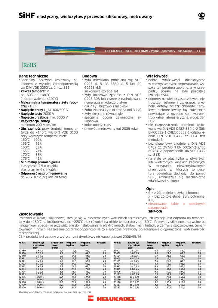 SiHF elastyczny, wielożyłowy przewód silikonowy, metrowany Dane techniczne ⦁S pecjalny przewód izolowany silikonem z wysoką żaroodpornością wg DIN VDE 0250 cz. 1 i cz. 816 ⦁ Zakres temperatur od -60°C do +180°C (krótkotrwale do +220°C) ⦁ Maksymalna temperatura żyły roboczej +180°C ⦁ Napięcie pracy U0/U 300/500 V ⦁ Napięcie testu 2000 V ⦁ Napięcie przebicia min. 5000 V ⦁ Rezystancja izolacji minimum 200 Mom/km ⦁ Obciążalność przy średniej temperaturze do +145°C wg DIN VDE 0100 przy wyższych temperaturach: 150°C 100% 155°C 91% 160°C 82% 165°C 71% 170°C 58% 175°C 41% ⦁ Minimalny promień gięcia elastycznie 7,5 x ø kabla stacjonarnie 4 x ø kabla ⦁ Odporność na promieniowanie do 20 x 106 cJ/kg (do 20 Mrad) Budowa ⦁ż yła miedziana pobielana wg VDE 0295 kl. 5, BS 6360 kl. 5 lub IEC 60228 kl.5 ⦁ silikonowa izolacja żył ⦁ żyły kolorowe zgodnie z DIN VDE 0293-308 lub czarne z nadrukowaną numeracją w kolorze białym ⦁ dla 2 żył: brązowy i niebieski ⦁ żółto-zielona żyła ochronna (od 3 żył) ⦁ żyły skręcone równolegle ⦁ specjalna opona zewnętrzna silikonowa ⦁ kolor opony: rudy ⦁ przewód metrowany (od 2009 roku) Właściwości ⦁d obre właściwości dielektryczne w podwyższonych temperaturach, wysoka temperatura zapłonu, a w przypadku pożaru na żyle pozostaje izolacja z SiO2 ⦁ odporny na wielkocząsteczkowe oleje, tłuszcze roślinne i zwierzęce, alkohole, klofeny, związki chlorodwufenylowe, niektóre kwasy, ług, substancje powstające z rozpadu soli, warunki tropikalne i atmosferyczne, wodę, tlen i UV ⦁ nie rozprzestrzenia płomieni: testowane wg DIN VDE 0482-332-1-2 (DIN EN 60332-1-2/IEC 60332-1 (odpowiednik DIN VDE 0472 cz. 804 test metodą B) ⦁ bezhalogenowy zgodnie z DIN VDE 0482 cz. 267/DIN EN 50267-2-2/IEC 60754-2 (odpowiednik DIN VDE 0472 cz. 813) ⦁ na stałe układać tylko w otwartych lub wietrzonych kanałach kablowych. W przypadku niewentylowanych przestrzeni, w których temperatura powietrza dochodzi do ponad 90°C, zmniejszają się mechaniczne właściwości silikonu. Opis Zastosowanie ⦁ G = z żółto-zieloną żyłą ochronną x = bez żółto-zielonej żyły ochronnej (OZ) ⦁ ekranowane kable o podobnych parametrach: SiHF-C-Si Przewód w izolacji silikonowej stosuje się w ekstremalnych warunkach termicznych. Ich izolacja jest odporna na temperatury do +180°C , a krótkotrwale do +220°C , jak również na niskie temperatury do -60°C . Przewody silikonowe są wolne od halogenków, specjalnie przewidziane do instalowania w elektrowniach, stalowniach, hutach, przemyśle stoczniowym, cementowniach i innych. Niezależnie od termoodporności są to elastyczne przewody połączeniowe o ograniczonej wytrzymałości mechanicznej. CE = produkt jest zgodny z wytycznymi dyrektywy niskonapięciowej 2006/95/EG. VDE SiHF elastyczny, wielożyłowy przewód silikonowy, metrowany VDE
