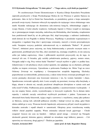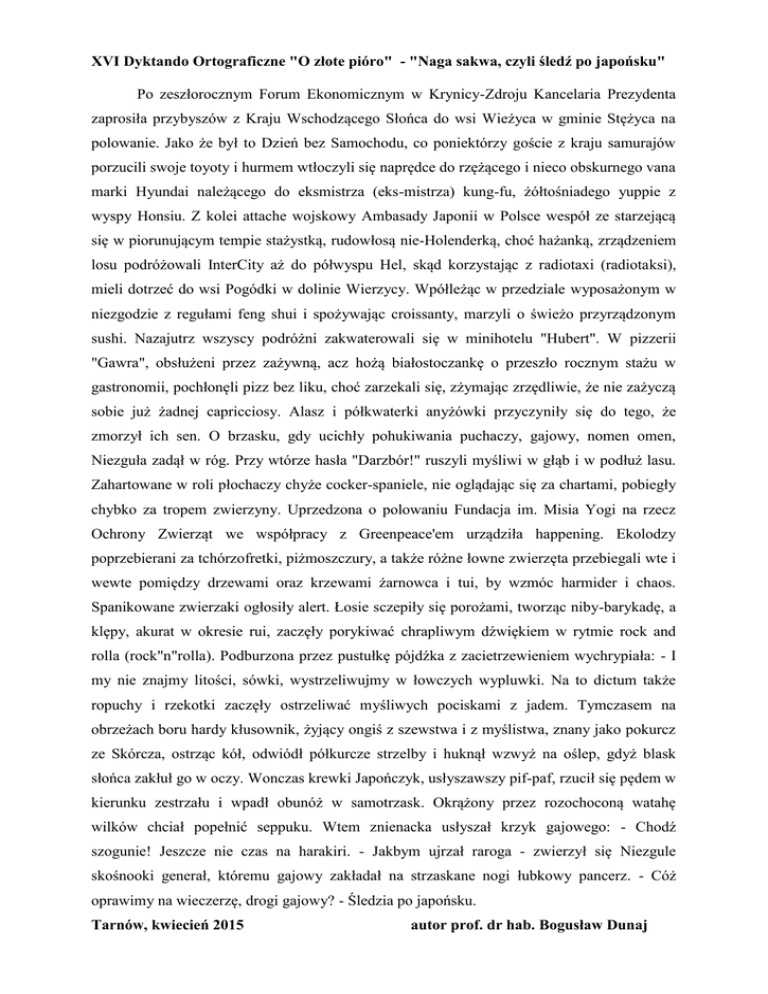 XVI Dyktando Ortograficzne "O złote pióro" - "Naga sakwa, czyli śledź po japońsku" Po zeszłorocznym Forum Ekonomicznym w Krynicy-Zdroju Kancelaria Prezydenta zaprosiła przybyszów z Kraju Wschodzącego Słońca do wsi Wieżyca w gminie Stężyca na polowanie. Jako że był to Dzień bez Samochodu, co poniektórzy goście z kraju samurajów porzucili swoje toyoty i hurmem wtłoczyli się naprędce do rzężącego i nieco obskurnego vana marki Hyundai należącego do eksmistrza (eks-mistrza) kung-fu, żółtośniadego yuppie z wyspy Honsiu. Z kolei attache wojskowy Ambasady Japonii w Polsce wespół ze starzejącą się w piorunującym tempie stażystką, rudowłosą nie-Holenderką, choć hażanką, zrządzeniem losu podróżowali InterCity aż do półwyspu Hel, skąd korzystając z radiotaxi (radiotaksi), mieli dotrzeć do wsi Pogódki w dolinie Wierzycy. Wpółleżąc w przedziale wyposażonym w niezgodzie z regułami feng shui i spożywając croissanty, marzyli o świeżo przyrządzonym sushi. Nazajutrz wszyscy podróżni zakwaterowali się w minihotelu "Hubert". W pizzerii "Gawra", obsłużeni przez zażywną, acz hożą białostoczankę o przeszło rocznym stażu w gastronomii, pochłonęli pizz bez liku, choć zarzekali się, zżymając zrzędliwie, że nie zażyczą sobie już żadnej capricciosy. Alasz i półkwaterki anyżówki przyczyniły się do tego, że zmorzył ich sen. O brzasku, gdy ucichły pohukiwania puchaczy, gajowy, nomen omen, Niezguła zadął w róg. Przy wtórze hasła "Darzbór!" ruszyli myśliwi w głąb i w podłuż lasu. Zahartowane w roli płochaczy chyże cocker-spaniele, nie oglądając się za chartami, pobiegły chybko za tropem zwierzyny. Uprzedzona o polowaniu Fundacja im. Misia Yogi na rzecz Ochrony Zwierząt we współpracy z Greenpeace'em urządziła happening. Ekolodzy poprzebierani za tchórzofretki, piżmoszczury, a także różne łowne zwierzęta przebiegali wte i wewte pomiędzy drzewami oraz krzewami żarnowca i tui, by wzmóc harmider i chaos. Spanikowane zwierzaki ogłosiły alert. Łosie sczepiły się porożami, tworząc niby-barykadę, a klępy, akurat w okresie rui, zaczęły porykiwać chrapliwym dźwiękiem w rytmie rock and rolla (rock"n"rolla). Podburzona przez pustułkę pójdźka z zacietrzewieniem wychrypiała: - I my nie znajmy litości, sówki, wystrzeliwujmy w łowczych wypluwki. Na to dictum także ropuchy i rzekotki zaczęły ostrzeliwać myśliwych pociskami z jadem. Tymczasem na obrzeżach boru hardy kłusownik, żyjący ongiś z szewstwa i z myślistwa, znany jako pokurcz ze Skórcza, ostrząc kół, odwiódł półkurcze strzelby i huknął wzwyż na oślep, gdyż blask słońca zakłuł go w oczy. Wonczas krewki Japończyk, usłyszawszy pif-paf, rzucił się pędem w kierunku zestrzału i wpadł obunóż w samotrzask. Okrążony przez rozochoconą watahę wilków chciał popełnić seppuku. Wtem znienacka usłyszał krzyk gajowego: - Chodź szogunie! Jeszcze nie czas na harakiri. - Jakbym ujrzał raroga - zwierzył się Niezgule skośnooki generał, któremu gajowy zakładał na strzaskane nogi łubkowy pancerz. - Cóż oprawimy na wieczerzę, drogi gajowy? - Śledzia po japońsku. Tarnów, kwiecień 2015 autor prof. dr hab. Bogusław Dunaj