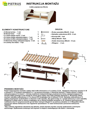 INSTRUKCJA MONTAŻU Łóżko pojedyncze Monte OKUCIA ELEMENTY KONSTRUKCYJNE • • • • • • • A-Szczyt prawy - 1 szt. B-Szczyt lewy - 1 szt. C-Listwa długa nośna - 2 szt. D-Listwa długa zabezpieczająca - 1 szt. E-Listwa krótka zabezpieczająca - 1 szt. F-Elementy listwy zabezpieczającej - 2 szt. G-Listwty dna łóżka - 1 kpl. 1. 2. • Śruba szwedzka M6x55 - 8 szt. • Nakrętka wałeczkowa M10 - 8 szt. 3. 4. • Kluczyk M5 - 1szt. • Wkręt M3x35 - 8szt. 5. • Kołek drewniany M8x32 - 14 szt. 6. • Ślizgacz - 4 szt. 4 4 2 1 G 4 3 3 1 B 2 D 5 1 F C E 2 A 2 3 1 1 F 5 3 C 6 PRZEBIEG MONTAŻU 5 6 Przed rozpoczęciem montażu należy wbić kołki drewniane nr 5 w listwy C,D,E . Następnie skręcamy szczyty A i B z listwami C i D śrubami szwedzkimi nr 1 za pomocą kluczyka 3. Elementy barierki F należy skręcić z listwą zabezpieczającą E śrubami 1. Istnieje możliwość bezpośredniego przykręcenia listwy zabezpieczającej E do szczytu łóżka prawego A lub lewego B. W tej opcji należy użyć tylko jednego elementu F. Wcześniej należy wsunąć nakrętkę wałeczkową nr 2 w otwory #10 znajdujące się w listwach C,D,E. Nakrętkę wałeczkową nr 2 należy przytrzymać śrubokrętem w otworze w taki sposób, aby gwint śruby nr 1 został wkręcony w w/w nakrętkę. Ślizgacze 6 należy wbić w otwory znajdujące się w dolnej krawędzi szczytów A i B. Ostatną czynnością jest rozłożenie dna G i przymocowanie go do listw nośnych długich C za pomocą wkrętów nr 4. Wszystkie okucia muszą być dobrze dokręcone oraz regularnie sprawdzane i w razie konieczności ponownie dokręcone. UWAGA! "Aby uniknąć zagrożenia uduszenia się dziecka, przed użyciem wyrobu usunąć opakowanie z tworzywa sztucznego. Opakowanie zniszczyć lub trzymać w miejscu niedostępnym dla dzieci i niemowląt.
