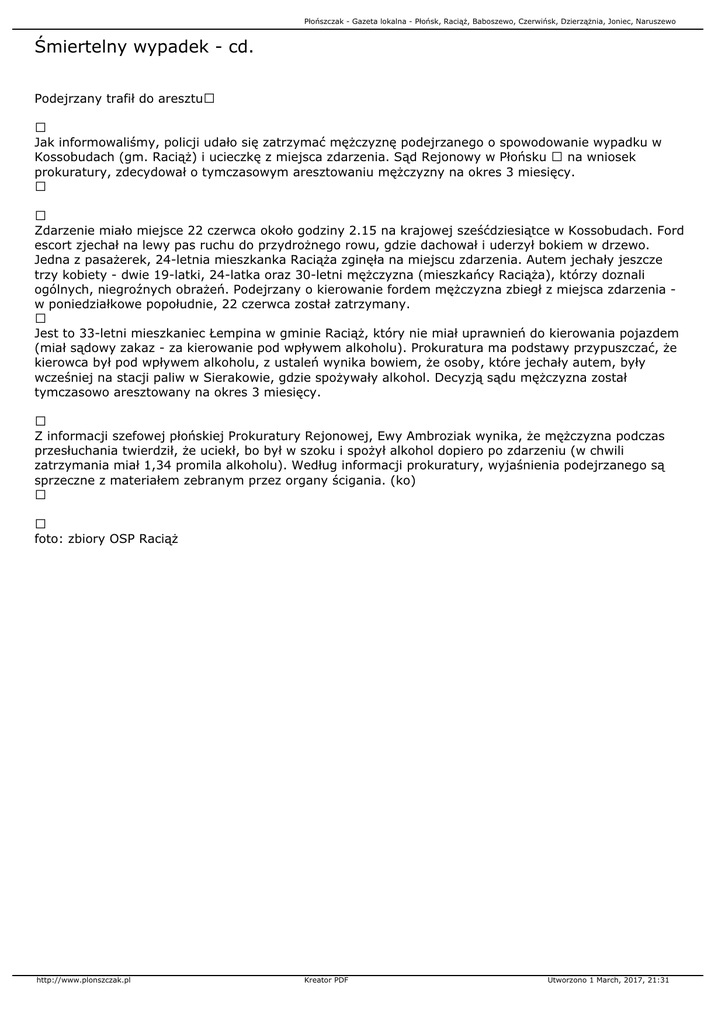 Płońszczak - Gazeta lokalna - Płońsk, Raciąż, Baboszewo, Czerwińsk, Dzierzążnia, Joniec, Naruszewo Śmiertelny wypadek - cd. Podejrzany trafił do aresztu Jak informowaliśmy, policji udało się zatrzymać mężczyznę podejrzanego o spowodowanie wypadku w Kossobudach (gm. Raciąż) i ucieczkę z miejsca zdarzenia. Sąd Rejonowy w Płońsku na wniosek prokuratury, zdecydował o tymczasowym aresztowaniu mężczyzny na okres 3 miesięcy. Zdarzenie miało miejsce 22 czerwca około godziny 2.15 na krajowej sześćdziesiątce w Kossobudach. Ford escort zjechał na lewy pas ruchu do przydrożnego rowu, gdzie dachował i uderzył bokiem w drzewo. Jedna z pasażerek, 24-letnia mieszkanka Raciąża zginęła na miejscu zdarzenia. Autem jechały jeszcze trzy kobiety - dwie 19-latki, 24-latka oraz 30-letni mężczyzna (mieszkańcy Raciąża), którzy doznali ogólnych, niegroźnych obrażeń. Podejrzany o kierowanie fordem mężczyzna zbiegł z miejsca zdarzenia w poniedziałkowe popołudnie, 22 czerwca został zatrzymany. Jest to 33-letni mieszkaniec Łempina w gminie Raciąż, który nie miał uprawnień do kierowania pojazdem (miał sądowy zakaz - za kierowanie pod wpływem alkoholu). Prokuratura ma podstawy przypuszczać, że kierowca był pod wpływem alkoholu, z ustaleń wynika bowiem, że osoby, które jechały autem, były wcześniej na stacji paliw w Sierakowie, gdzie spożywały alkohol. Decyzją sądu mężczyzna został tymczasowo aresztowany na okres 3 miesięcy. Z informacji szefowej płońskiej Prokuratury Rejonowej, Ewy Ambroziak wynika, że mężczyzna podczas przesłuchania twierdził, że uciekł, bo był w szoku i spożył alkohol dopiero po zdarzeniu (w chwili zatrzymania miał 1,34 promila alkoholu). Według informacji prokuratury, wyjaśnienia podejrzanego są sprzeczne z materiałem zebranym przez organy ścigania. (ko) foto: zbiory OSP Raciąż http://www.plonszczak.pl Kreator PDF Utworzono 1 March, 2017, 21:31
