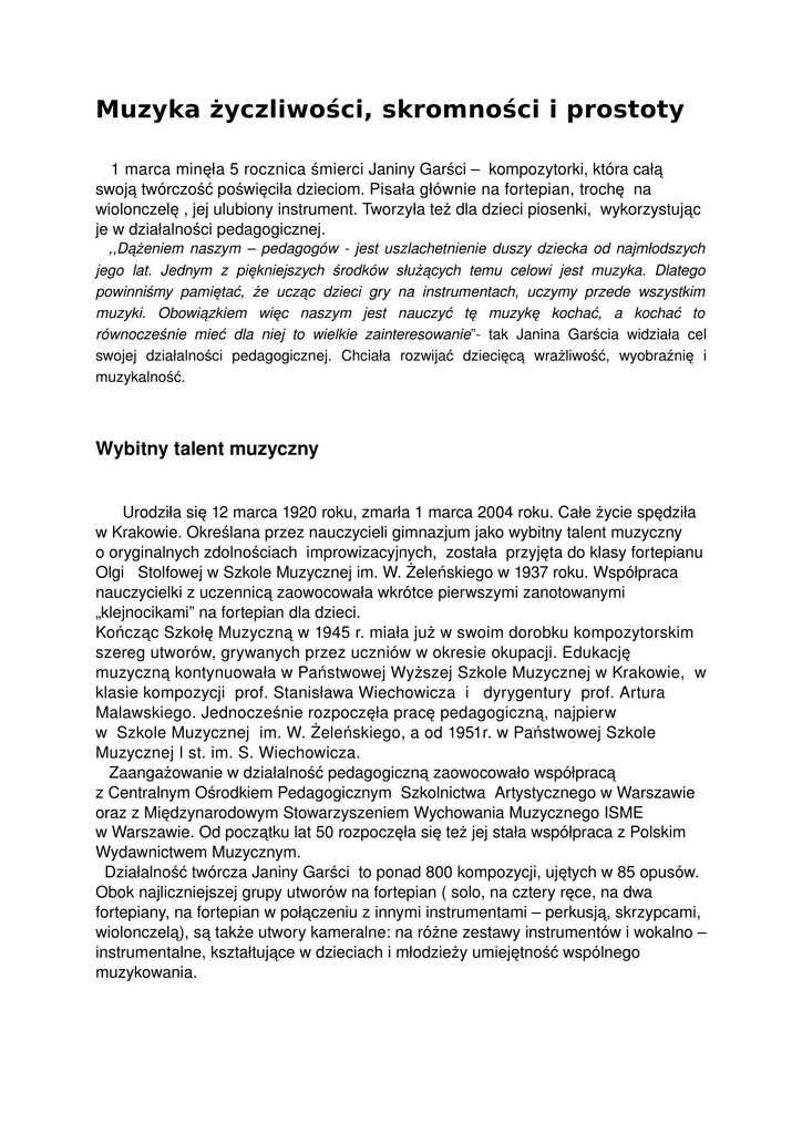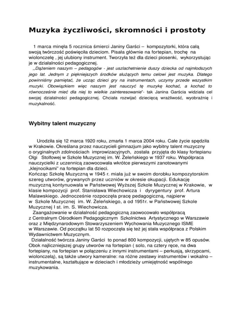 Muzyka życzliwości, skromności i prostoty 1 marca minęła 5 rocznica śmierci Janiny Garści – kompozytorki, która całą swoją twórczość poświęciła dzieciom. Pisała głównie na fortepian, trochę na wiolonczelę , jej ulubiony instrument. Tworzyła też dla dzieci piosenki, wykorzystując je w działalności pedagogicznej. ,,Dążeniem naszym – pedagogów jest uszlachetnienie duszy dziecka od najmłodszych jego lat. Jednym z piękniejszych środków służących temu celowi jest muzyka. Dlatego powinniśmy pamiętać, że ucząc dzieci gry na instrumentach, uczymy przede wszystkim muzyki. Obowiązkiem więc naszym jest nauczyć tę muzykę kochać, a kochać to równocześnie mieć dla niej to wielkie zainteresowanie” tak Janina Garścia widziała cel swojej działalności pedagogicznej. Chciała rozwijać dziecięcą wrażliwość, wyobraźnię i muzykalność. Wybitny talent muzyczny Urodziła się 12 marca 1920 roku, zmarła 1 marca 2004 roku. Całe życie spędziła w Krakowie. Określana przez nauczycieli gimnazjum jako wybitny talent muzyczny o oryginalnych zdolnościach improwizacyjnych, została przyjęta do klasy fortepianu Olgi Stolfowej w Szkole Muzycznej im. W. Żeleńskiego w 1937 roku. Współpraca nauczycielki z uczennicą zaowocowała wkrótce pierwszymi zanotowanymi „klejnocikami” na fortepian dla dzieci. Kończąc Szkołę Muzyczną w 1945 r. miała już w swoim dorobku kompozytorskim szereg utworów, grywanych przez uczniów w okresie okupacji. Edukację muzyczną kontynuowała w Państwowej Wyższej Szkole Muzycznej w Krakowie, w klasie kompozycji prof. Stanisława Wiechowicza i dyrygentury prof. Artura Malawskiego. Jednocześnie rozpoczęła pracę pedagogiczną, najpierw w Szkole Muzycznej im. W. Żeleńskiego, a od 1951r. w Państwowej Szkole Muzycznej I st. im. S. Wiechowicza. Zaangażowanie w działalność pedagogiczną zaowocowało współpracą z Centralnym Ośrodkiem Pedagogicznym Szkolnictwa Artystycznego w Warszawie oraz z Międzynarodowym Stowarzyszeniem Wychowania Muzycznego ISME w Warszawie. Od początku lat 50 rozpoczęła się też jej stała współpraca z Polskim Wydawnictwem Muzycznym. Działalność twórcza Janiny Garści to ponad 800 kompozycji, ujętych w 85 opusów. Obok najliczniejszej grupy utworów na fortepian ( solo, na cztery ręce, na dwa fortepiany, na fortepian w połączeniu z innymi instrumentami – perkusją, skrzypcami, wiolonczelą), są także utwory kameralne: na różne zestawy instrumentów i wokalno – instrumentalne, kształtujące w dzieciach i młodzieży umiejętność wspólnego muzykowania. Klejnociki Garści Obcowanie z dziećmi i młodzieżą inspirowało kompozycje Janiny Garści i ukazywało problemy pedagogiczne, które poprzez swoją twórczość starała się rozwiązywać. Problemy te, obecne w każdym utworze, schowane były wśród palety barw i pokonywane przez dzieci nieświadomie. Wszystkie jej utwory budziły powszechny zachwyt, a współcześni pedagodzy popularnie określają je jako „klejnociki Garści”. Stosowała różne formy muzyczne i zestawienia instrumentów. Sięgała po ciekawe środki wyrazowe, pozwalające zrozumieć i pokochać muzykę i się nią bawić. Nadawała utworom taki kształt muzyczny, by przybliżyć dziecku urok samej muzyki, zachęcić je do muzykowania i pobudzić wyobraźnię odtwórczą. Szczególną wagę przywiązywała do kolorystyki brzmienia, którą posługiwała się zarówno w celach ilustracyjnych, jak też tworząc specyficzny klimat, związany z tytułem programowym danego utworu. Dzięki doskonałemu dostosowaniu do potrzeb szkolnych, liczne kompozycje Janiny Garści wzbogaciły szkolną literaturę i zdobyły trwałą wartość repertuarową w Polsce jak i na świecie (m.in. w Kanadzie, Japonii, USA, Wielkiej Brytanii, Niemczech). Niemal wszystkie jej utwory zostały opublikowane (nie tylko w polskiej wersji językowej ale też po angielsku, niemiecku, francusku, włosku i hiszpańsku), a wiele z nich doczekało się wielokrotnych wydań. Janina Garścia była często zapraszana do uczestnictwa w pracach jury konkursów i festiwali twórczości muzycznej dla dzieci i młodzieży. Znajdowała również czas na spotkania z młodzieżą. Została honorowym patronem Ogólnopolskiego Konkursu im. Janiny Garści w Stalowej Woli (od roku 2003 o randze międzynarodowej), Festiwalu Muzycznego Utworów Dziecięcych i Młodzieżowych im. Janiny Garści w Krakowie oraz Konkursu im. Janiny Garści w Lublińcu. Została też patronem w Szkół Muzycznych: w Tczewie (1997), Lublińcu (2001),Jeleniej Górze (2003),Chrzanowie (2003). Muzyka skromna jak kompozytorka Siła kompozytorki tkwiła w jej niezwykłej osobowości. Sama wielokrotnie podkreślała: „Jestem bardzo skromnym człowiekiem i nie lubię mówić dużo o sobie. Kocham mój zawód, kocham dzieci, wiele pracuję w cichości mojego domu. Być może moja psychika jest tak skonstruowana, że bardzo łatwo nawiązuję kontakt z najmłodszymi. Często przychodzą do mnie, gramy razem i wówczas mogę od razu ocenić mojego ucznia. Od młodości grałam z wielką łatwością, co było tradycją rodzinną. Miałam wrodzone to, do czego inni dochodzą latami” Uczniowie Janiny Garści wspominają, iż należała do ludzi, którzy emanują życzliwością i pozytywnie oddziałują na innych. Jej osobowość odbija się w jej muzyce, prostej i równie skromnej jak ona sama, pozbawionej cienia pozy, ale dobrej, przekonującej muzycznie i przemawiającej do wyobraźni. Dobra, ładna, urocza Pisała muzykę przede wszystkim dla dzieci, bo taka była potrzeba chwili. Zaczęła uczyć gry na fortepianie tuż po II wojnie światowej, kiedy trudno było o materiały nutowe, szczególnie o utwory dla dzieci, i dlatego sama zaczęła je pisać, początkowo na swój pedagogiczny użytek, potem także na użytek ogólny. Drukowała swoje miniaturki muzyczne początkowo w wydawnictwie „ Czytelnik”, 