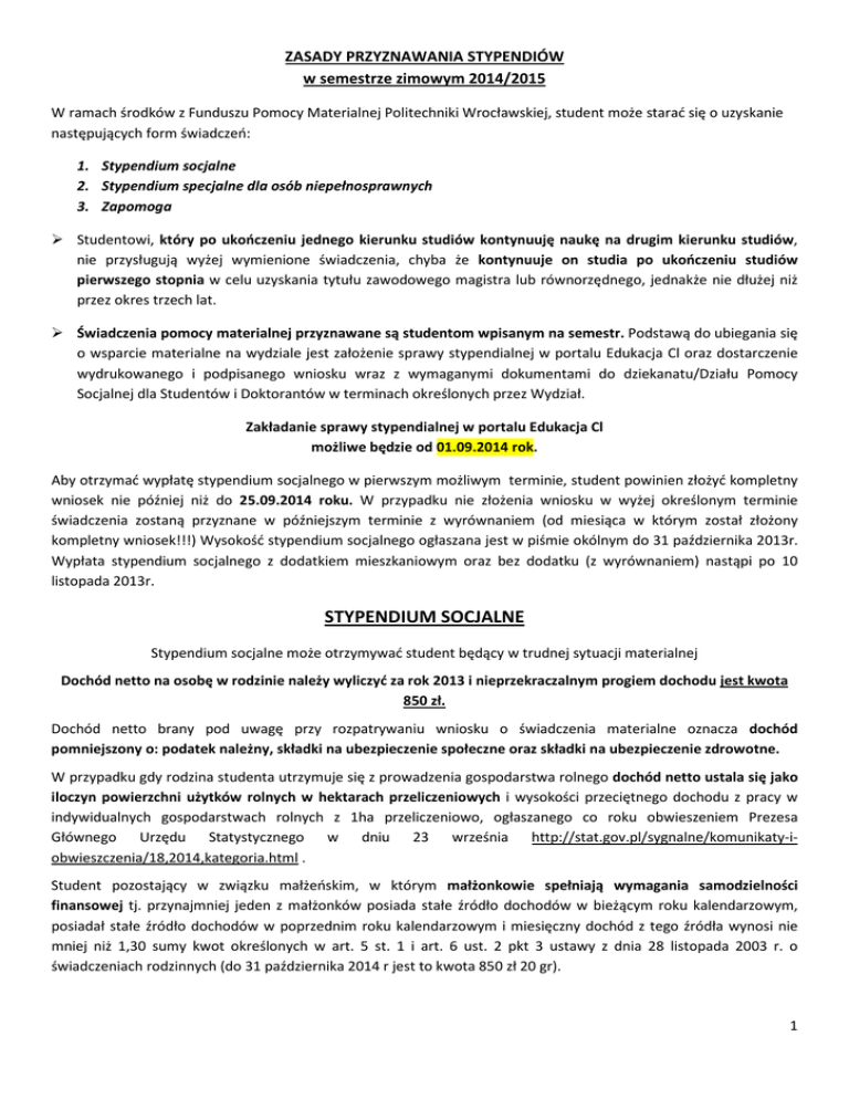 ZASADY PRZYZNAWANIA STYPENDIÓW w semestrze zimowym 2014/2015 W ramach środków z Funduszu Pomocy Materialnej Politechniki Wrocławskiej, student może starać się o uzyskanie następujących form świadczeń: 1. Stypendium socjalne 2. Stypendium specjalne dla osób niepełnosprawnych 3. Zapomoga Studentowi, który po ukończeniu jednego kierunku studiów kontynuuję naukę na drugim kierunku studiów, nie przysługują wyżej wymienione świadczenia, chyba że kontynuuje on studia po ukończeniu studiów pierwszego stopnia w celu uzyskania tytułu zawodowego magistra lub równorzędnego, jednakże nie dłużej niż przez okres trzech lat. Świadczenia pomocy materialnej przyznawane są studentom wpisanym na semestr. Podstawą do ubiegania się o wsparcie materialne na wydziale jest założenie sprawy stypendialnej w portalu Edukacja Cl oraz dostarczenie wydrukowanego i podpisanego wniosku wraz z wymaganymi dokumentami do dziekanatu/Działu Pomocy Socjalnej dla Studentów i Doktorantów w terminach określonych przez Wydział. Zakładanie sprawy stypendialnej w portalu Edukacja Cl możliwe będzie od 01.09.2014 rok. Aby otrzymać wypłatę stypendium socjalnego w pierwszym możliwym terminie, student powinien złożyć kompletny wniosek nie później niż do 25.09.2014 roku. W przypadku nie złożenia wniosku w wyżej określonym terminie świadczenia zostaną przyznane w późniejszym terminie z wyrównaniem (od miesiąca w którym został złożony kompletny wniosek!!!) Wysokość stypendium socjalnego ogłaszana jest w piśmie okólnym do 31 października 2013r. Wypłata stypendium socjalnego z dodatkiem mieszkaniowym oraz bez dodatku (z wyrównaniem) nastąpi po 10 listopada 2013r. STYPENDIUM SOCJALNE Stypendium socjalne może otrzymywać student będący w trudnej sytuacji materialnej Dochód netto na osobę w rodzinie należy wyliczyć za rok 2013 i nieprzekraczalnym progiem dochodu jest kwota 850 zł. Dochód netto brany pod uwagę przy rozpatrywaniu wniosku o świadczenia materialne oznacza dochód pomniejszony o: podatek należny, składki na ubezpieczenie społeczne oraz składki na ubezpieczenie zdrowotne. W przypadku gdy rodzina studenta utrzymuje się z prowadzenia gospodarstwa rolnego dochód netto ustala się jako iloczyn powierzchni użytków rolnych w hektarach przeliczeniowych i wysokości przeciętnego dochodu z pracy w indywidualnych gospodarstwach rolnych z 1ha przeliczeniowo, ogłaszanego co roku obwieszeniem Prezesa Głównego Urzędu Statystycznego w dniu 23 września http://stat.gov.pl/sygnalne/komunikaty-iobwieszczenia/18,2014,kategoria.html . Student pozostający w związku małżeńskim, w którym małżonkowie spełniają wymagania samodzielności finansowej tj. przynajmniej jeden z małżonków posiada stałe źródło dochodów w bieżącym roku kalendarzowym, posiadał stałe źródło dochodów w poprzednim roku kalendarzowym i miesięczny dochód z tego źródła wynosi nie mniej niż 1,30 sumy kwot określonych w art. 5 st. 1 i art. 6 ust. 2 pkt 3 ustawy z dnia 28 listopada 2003 r. o świadczeniach rodzinnych (do 31 października 2014 r jest to kwota 850 zł 20 gr). 1 Student pozostający w związku małżeńskim w którym małżonkowie nie spełniają wymagań samodzielności finansowej, przestawia dochody swoje, małżonka oraz dochody swoich rodziców (a także ewentualnego rodzeństwa). Jeżeli powyżej wymieniony czynnik warunkujący samodzielność finansową nie zostanie spełniony nie ma żadnej innej możliwości by wnioskodawca mógł określić swój status jako samodzielny finansowo. Podstawowe wymagane dokumenty: 1. Zaświadczenie z Urzędu skarbowego o dochodach za poprzedni rok kalendarzowy (2013) dla: • Studenta – wnioskodawcy • Rodziców opiekunów prawnych, opiekunów faktycznych studenta • Rodzeństwa wnioskodawcy pobierającego naukę od 18 do 26 roku życia lub jeśli 26 rok życia przypada na ostatni rok studiów • Małżonka studenta-wnioskodawcy 2. Zaświadczenie z Urzędu Skarbowego o należnym zryczałtowanym podatku dochodowym za poprzedni rok kalendarzowy oraz oświadczenie o dochodach – dotyczy to osób prowadzących działalność gospodarczą na zasadach karty podatkowej lub ryczałtu. 3. Zaświadczenie z ZUS o należnych składkach zdrowotnych odprowadzonych w roku kalendarzowym 2013. Zaświadczenie powinno zawierać składki z podziałem na poszczególne miesiące oraz kod tytułu ubezpieczenia. 4. Oświadczenie o dochodach niepodlegających opodatkowaniu podatkiem dochodowym - Wykaz objętych oświadczeniem dochodów, w zakresie niepodlegającym opodatkowaniu podatkiem dochodowym można znaleźć w załączniku nr 13 do regulaminu pomocy materialnej. W przypadku braku dochodów objętych oświadczeniem, w rubryce wysokość dochodu należy wpisać "0". Oświadczenie wypełnia każdy pełnoletni członek rodziny. 5. NAKAZ PŁATNICZY LUB ZAŚWIADCZENIE Z URZĘDU GMINY (jeśli stałe miejsce zamieszkania rodziców, opiekunów prawnych lub faktycznych czy też małżonka wnioskodawcy znajduje się na terenie gminy rolniczej) o FIGUROWANIU, BĄDŹ NIE w rejestrze podatników podatku rolnego, wraz z liczbą hektarów przeliczeniowych tworzących gospodarstwo rolne. DZIERŻAWA (ha przeliczeniowy) WLICZA SIĘ DO DOCHODU. Nie odliczane są składki na rzecz KRUS-u. DOCHÓD ZA 1 ha PRZELICZENIOWY W ROKU 2013 PODANY BĘDZIE WE WRZEŚNIU!!! 6. ZAŚWIADCZENIE Z URZĘDU PRACY - W przypadku osób o statucie bezrobotny. Zaświadczenie powinno zawierać informację od kiedy osoba pozostaje bezrobotna, czy ma prawo do zasiłku i na jaki okres zasiłek został przyznany, oraz wysokość NETTO pobieranego zasiłku. 7. ZAŚWIADCZENIE O POBIERANIU NAUKI DLA RODZEŃSTWA - Dla pobierających naukę członków rodziny, którzy ukończyli 18 lat, a nie ukończyli 25 lat, a także tych, których 26 rok życia przypada w ostatnim roku studiów, student obowiązany jest dostarczyć zaświadczenie ze szkoły (uczelni) publicznej lub ni