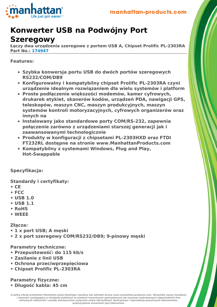 Konwerter USB na Podwójny Port Szeregowy Łączy dwa urządzenia szeregowe z portem USB A, Chipset Prolific PL-2303RA Part No.: 174947 Features: Szybka konwersja portu USB do dwóch portów szeregowych RS232/COM/DB9 Konfigurowalny i kompatybilny chipset Prolific PL-2303RA czyni urządzenie idealnym rozwiązaniem dla wielu systemów i platform Proste podłączenie większości modemów, kamer cyfrowych, drukarek etykiet, skanerów kodów, urządzeń PDA, nawigacji GPS, teleskopów, maszyn CNC, maszyn produkcyjnych, maszyn systemów kontroli motoryzacyjnych, cyfrowych organizerów oraz innych na Instalowany jako standardowe porty COM/RS-232, zapewnia połączenie zarówno z urządzeniami starszej generacji jak i zaawansowanymi technologicznie Produkty w konfiguracji z chipsetami PL-2303HXD oraz FTDI FT232RL dostępne na stronie www.ManhattanProducts.com Kompatybilny z systemami Windows, Plug and Play, Hot-Swappable Specyfikacja: Standardy i certyfikaty: • CE • FCC • USB 1.0 • USB 1.1 • RoHS • WEEE Złącza: • 1 x port USB; A męski • 2 x port szeregowy COM/RS232/DB9; 9-pinowy męski Parametry techniczne: • Przepustowość: do 115 kb/s • Zasilanie z linii USB • Ochrona przeciwprzepięciowa • Chipset Prolific PL-2303RA Parametry fizyczne: • Długość kabla: 45 cm O pełną ofertę produktów Manhattan pytaj lokalnego resellera lub odwiedź stronę www.manhattan-products.com. Wszystkie nazwy handlowe i towarów występujące w niniejszej publikacji są znakami towarowymi zastrzeżonymi lub nazwami zastrzeżonymi odpowiednich firm odnośnych właścicieli i zostały zamieszczone wyłącznie celem identyfikacji. Dystrybucja i reprodukcja powyższych dokumentów, wykorzystanie zawartości jest zabronione. • Waga: 225 g Minimalne wymagania systemowe: • Windows XP/Vista/7/8/8.1/10 oraz Linux oraz Mac OS 9.x/10.x lub wyższy Zawartość opakowania: • Konwerter USB na podwójne złącze szeregowe • Instrukcja użytkownika oraz CD ze sterownikami O pełną ofertę produktów Manhattan pytaj lokalnego resellera lub odwiedź stronę www.manhattan-products.com. Wszystkie nazwy handlowe i towarów występujące w niniejszej publikacji są znakami towarowymi zastrzeżonymi lub nazwami zastrzeżonymi odpowiednich firm odnośnych właścicieli i zostały zamieszczone wyłącznie celem identyfikacji. Dystrybucja i reprodukcja powyższych dokumentów, wykorzystanie zawartości jest zabronione.