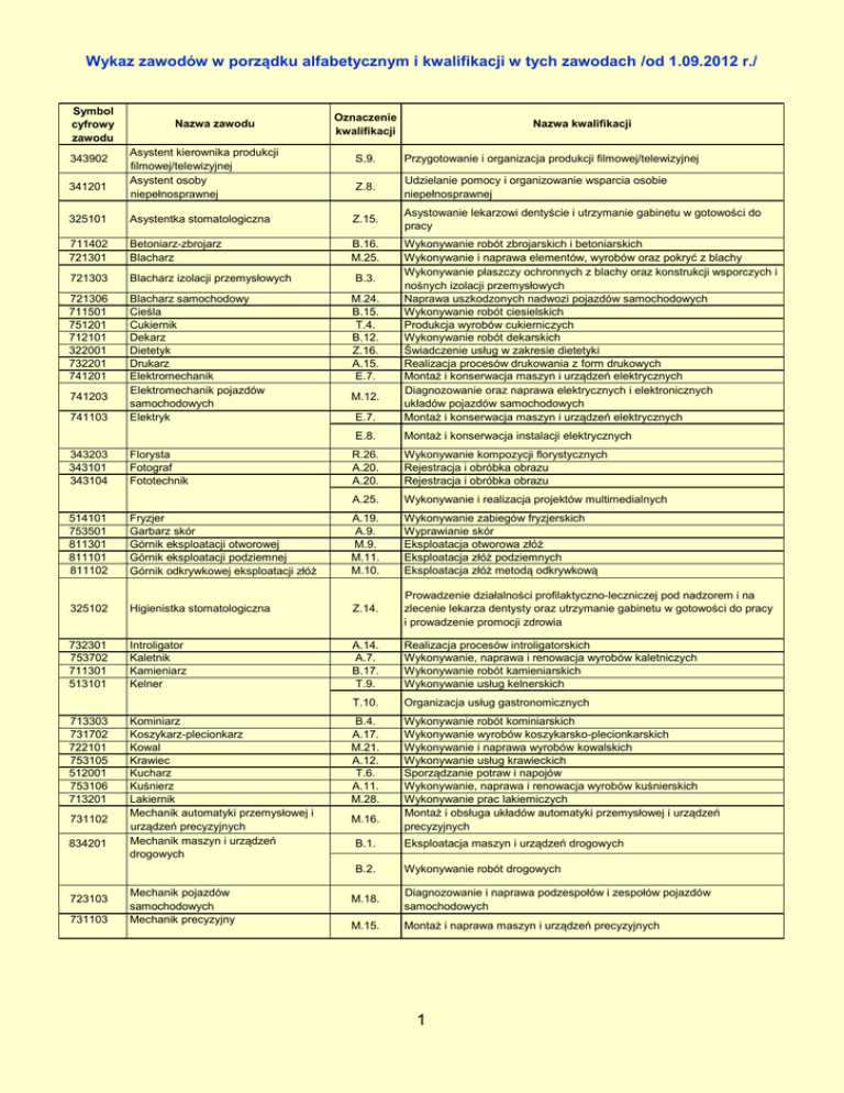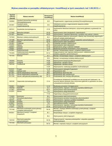 Wykaz zawodów w porządku alfabetycznym i kwalifikacji w tych zawodach /od 1.09.2012 r./ Symbol cyfrowy zawodu 343902 341201 Nazwa zawodu Asystent kierownika produkcji filmowej/telewizyjnej Asystent osoby niepełnosprawnej Oznaczenie kwalifikacji S.9. Przygotowanie i organizacja produkcji filmowej/telewizyjnej Z.8. Udzielanie pomocy i organizowanie wsparcia osobie niepełnosprawnej Asystowanie lekarzowi dentyście i utrzymanie gabinetu w gotowości do pracy 325101 Asystentka stomatologiczna Z.15. 711402 721301 Betoniarz-zbrojarz Blacharz B.16. M.25. 721303 Blacharz izolacji przemysłowych 721306 711501 751201 712101 322001 732201 741201 Blacharz samochodowy Cieśla Cukiernik Dekarz Dietetyk Drukarz Elektromechanik Elektromechanik pojazdów samochodowych Elektryk 741203 741103 343203 343101 343104 Florysta Fotograf Fototechnik Nazwa kwalifikacji E.7. Wykonywanie robót zbrojarskich i betoniarskich Wykonywanie i naprawa elementów, wyrobów oraz pokryć z blachy Wykonywanie płaszczy ochronnych z blachy oraz konstrukcji wsporczych i nośnych izolacji przemysłowych Naprawa uszkodzonych nadwozi pojazdów samochodowych Wykonywanie robót ciesielskich Produkcja wyrobów cukierniczych Wykonywanie robót dekarskich Świadczenie usług w zakresie dietetyki Realizacja procesów drukowania z form drukowych Montaż i konserwacja maszyn i urządzeń elektrycznych Diagnozowanie oraz naprawa elektrycznych i elektronicznych układów pojazdów samochodowych Montaż i konserwacja maszyn i urządzeń elektrycznych E.8. Montaż i konserwacja instalacji elektrycznych R.26. A.20. A.20. Wykonywanie kompozycji florystycznych Rejestracja i obróbka obrazu Rejestracja i obróbka obrazu A.25. Wykonywanie i realizacja projektów multimedialnych B.3. M.24. B.15. T.4. B.12. Z.16. A.15. E.7. M.12. 514101 753501 811301 811101 811102 Fryzjer Garbarz skór Górnik eksploatacji otworowej Górnik eksploatacji podziemnej Górnik odkrywkowej eksploatacji złóż A.19. A.9. M.9. M.11. M.10. Wykonywanie zabiegów fryzjerskich Wyprawianie skór Eksploatacja otworowa złóż Eksploatacja złóż podziemnych Eksploatacja złóż metodą odkrywkową 325102 Higienistka stomatologiczna Z.14. Prowadzenie działalności profilaktyczno-leczniczej pod nadzorem i na zlecenie lekarza dentysty oraz utrzymanie gabinetu w gotowości do pracy i prowadzenie promocji zdrowia 732301 753702 711301 513101 Introligator Kaletnik Kamieniarz Kelner A.14. A.7. B.17. T.9. Realizacja procesów introligatorskich Wykonywanie, naprawa i renowacja wyrobów kaletniczych Wykonywanie robót kamieniarskich Wykonywanie usług kelnerskich T.10. Organizacja usług gastronomicznych 713303 731702 722101 753105 512001 753106 713201 Kominiarz Koszykarz-plecionkarz Kowal Krawiec Kucharz Kuśnierz Lakiernik Mechanik automatyki przemysłowej i urządzeń precyzyjnych Mechanik maszyn i urządzeń drogowych B.4. A.17. M.21. A.12. T.6. A.11. M.28. Wykonywanie robót kominiarskich Wykonywanie wyrobów koszykarsko-plecionkarskich Wykonywanie i naprawa wyrobów kowalskich Wykonywanie usług krawieckich Sporządzanie potraw i napojów Wykonywanie, naprawa i renowacja wyrobów kuśnierskich Wykonywanie prac lakierniczych Montaż i obsługa układów automatyki przemysłowej i urządzeń precyzyjnych 731102 834201 723103 731103 Mechanik pojazdów samochodowych Mechanik precyzyjny M.16. B.1. Eksploatacja maszyn i urządzeń drogowych B.2. Wykonywanie robót drogowych M.18. Diagnozowanie i naprawa podzespołów i zespołów pojazdów samochodowych M.15. Montaż i naprawa maszyn i urządzeń precyzyjnych 1 723310 834103 Mechanik-monter maszyn i urządzeń Mechanik-operator pojazdów i maszyn rolniczych M.17. M.1. M.2. 721104 Modelarz odlewniczy M.26. Montaż i obsługa maszyn i urządzeń Użytkowanie pojazdów, maszyn, urządzeń i narzędzi stosowanych w rolnictwie Obsługa techniczna oraz naprawa pojazdów, maszyn i urządzeń stosowanych w rolnictwie Wykonywanie i naprawa oprzyrządowania odlewniczego z materiałów niemetalowych M.27. Montaż i naprawa oprzyrządowania odlewniczego wykonanego z metalu B.13. B.11. B.10. M.22. Wykonywanie robót regulacyjnych i hydrotechnicznych Wykonywanie izolacji budowlanych Wykonywanie izolacji przemysłowych Wykonywanie elementów kadłuba okrętu 711701 712401 712403 721402 Monter budownictwa wodnego Monter izolacji budowlanych Monter izolacji przemysłowych Monter kadłubów okrętowych M.23. Montaż i remont kadłuba okrętu 711102 742114 Monter konstrukcji budowlanych Monter mechatronik B.20. E.3. Montaż konstrukcji budowlanych Montaż urządzeń i systemów mechatronicznych E.4. Użytkowanie urządzeń i systemów mechatronicznych 711603 Monter nawierzchni kolejowej Monter sieci i urządzeń telekomunikacyjnych B.14. Wykonywanie i utrzymywanie nawierzchni kolejowej E.1. Montaż i utrzymanie linii telekomunikacyjnych E.2. Montaż, konfiguracja i utrzymanie urządzeń sieci telekomunikacyjnych B.8. Wykonywanie robót związanych z budową i remontem sieci komunalnych B.9. Wykonywanie robót związanych z montażem i remontem instalacji sanitarnych 742202 712616 712613 712905 Monter sieci, instalacji i urządzeń sanitarnych Monter systemów rurociągowych Monter zabudowy i robót wykończeniowych w budownictwie M.29. Montaż systemów rurociągowych B.5. Montaż systemów suchej zabudowy B.6. Wykonywanie robót malarsko-tapeciarskich B.7. Wykonywanie robót posadzkarsko-okładzinowych Montaż układów i urządzeń elektronicznych 742102 Monter-elektronik E.5. E.6. Wykonywanie instalacji urządzeń elektronicznych 711204 753602 611303 Murarz-tynkarz Obuwnik Ogrodnik Operator maszyn i urządzeń do obróbki plastycznej Operator maszyn i urządzeń do przetwórstwa tworzyw sztucznych Operator maszyn i urządzeń metalurgicznych Operator maszyn i urządzeń odlewniczych B.18. A.8. R.5. Wykonywanie robót murarskich i tynkarskich Wytwarzanie obuwia Zakładanie i prowadzenie upraw ogrodniczych M.7. Użytkowanie maszyn i urządzeń do obrób