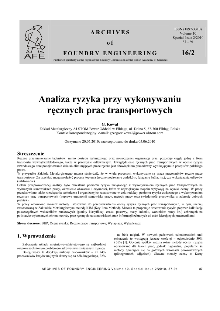 ARCHIVES of ISSN (1897-3310) Volume 10 Special Issue 2/2010 87 – 91 FOUNDRY ENGINEERING 16/2 Published quarterly as the organ of the Foundry Commission of the Polish Academy of Sciences Analiza ryzyka przy wykonywaniu ręcznych prac transportowych G. Kowal Zakład Metalurgiczny ALSTOM Power Oddział w Elblągu, ul. Dolna 5, 82-300 Elbląg, Polska Kontakt korespondencyjny: e-mail: [email protected] Otrzymano 20.05.2010; zaakceptowano do druku 05.06.2010 Streszczenie Ręczne przemieszczanie ładunków, mimo postępu technicznego oraz nowoczesnej organizacji prac, pozostaje ciągle jedną z form transportu wewnątrzzakładowego, także w przemyśle odlewniczym. Uwzględnienie ręcznych prac transportowych w ocenie ryzyka zawodowego oraz podejmowanie działań eliminujących prace ręczne jest obowiązkiem pracodawcy wynikającymi z przepisów polskiego prawa. W przypadku Zakładu Metalurgicznego można stwierdzić, że w wielu procesach wykonywane są przez pracowników ręczne prace transportowe. Za przykład mogą posłużyć procesy topienia (ręczne podawanie dodatków, ściąganie żużla, itp.), czy wykańczania odlewów (szlifowanie). Celem przeprowadzonej analizy było określanie poziomu ryzyka związanego z wykonywaniem ręcznych prac transportowych na wybranych stanowiskach pracy, określenie obszarów i czynności, które w największym stopniu wpływają na wyniki oceny. W pracy przedstawiono także rozwiązania techniczne i organizacyjne zastosowane w celu redukcji poziomu ryzyka związanego z wykonywaniem ręcznych prac transportowych (poprawa ergonomii stanowiska pracy, metody pracy oraz świadomość pracownika w zakresie dobrych praktyk). W pracy omówiono również metody stosowane do przeprowadzenia oceny ryzyka ręcznych prac transportowych, w tym, szerzej zastosowaną w Zakładzie Metalurgicznym metodę KIM (Key Item Method). Metoda ta proponuje szacowanie ryzyka poprzez kalkulację poszczególnych wskaźników punktowych (punkty klasyfikacji czasu, postawy, masy ładunku, warunków pracy itp.) zebranych na podstawie wykonanych chronometraży prac ręcznych na stanowiskach oraz informacji zebranych od osób kierujących pracownikami. Słowa kluczowe: BHP; Ocena ryzyka; Ręczne prace transportowe; Wytapiacz; Wykańczacz. 1. Wprowadzenie Zaburzenia układu mięśniowo-szkieletowego są najbardziej rozpowszechnionym problemem zdrowotnym związanym z pracą. Dolegliwości te dotykają miliony pracowników – aż 24% pracowników krajów unijnych skarży się na bóle kręgosłupa, 22% - na bóle mięśni. W nowych państwach członkowskich unii schorzenia te występują jeszcze częściej – odpowiednio 39% i 36% [1]. Obecnie spotkać można różne metody oceny ryzyka opracowane dla takich prac, jednak najbardziej popularne są metody opierające się na gotowych wzorcach porównawczych (piktogramach, zdjęciach). Główne metody oceny to Karty ARCHIVES OF FOUNDRY ENGINEERING Volume 10, Special Issue 2/2010, 87-91 87 Oceny Ręcznych prac Transportowych (ang. Manual Handling Assessmnet Charts – MAC) oraz Metoda Wskaźników Kluczowych (ang. Key Item Method – KIM) [2]. Opracowane są również przewodniki korzystania z w/w metod. Przy ocenie wartości poszczególnych wskaźników niezbędna jest odpowiednia wiedza w odniesieniu do ocenianej czynności składowej. Jeżeli takiej wiedzy nie mamy, to należy przeprowadzić szczegółową analizę wszystkich wykonywanych czynności. W żadnym wypadku nie wolno opierać się na przypuszczeniach, gdyż zwykle prowadzą one do fałszywych wyników. Ważnym elementem przed rozpoczęciem oceny jest przeprowadzenie chronometraży na stanowiskach, określenie rodzaju prac na stanowisku, zgrupowanie czynności o podobnym charakterze pracy, oraz czasu ich trwania lub ilości powtórzeń. Analizę ryzyka przy wykonywaniu prac ręcznych przeprowadzono na stanowiskach wytapiacz i wykańczacz w Zakładzie Metalurgicznym ALSTOM Power Oddział w Elblągu. Stanowiska oceniano posługując się metodą KIM. 2. Metodyka badań, założenia badawcze, doświadczenia Metoda KIM jest narzędziem opracowanym przez Federalny Instytut Bezpieczeństwa i Higieny Pracy oraz Komitet ds. Bezpieczeństwa i Ochrony Pracy. Dostępne są dwa arkusze kalkulacyjne, które pozwalają ocenić poniższe operacje: • czynności ciągnięcia i pchania, • czynności podnoszenia, trzymania i przenoszenia. Szacowanie ryzyka związanego z wykonywaniem prac ręcznych metodą KIM polega na ocenie punktowej wskaźników czasu pracy lub ilości powtórzeń (T), ładunku (L), postawy (P) i warunków pracy (C). Posługując się poniższym wzorem otrzymuje się wynik oceny ryzyka (R). R = (L + P + C ) × T Każda grupa punktów klasyfikacji (L, P, C) zebrana jest w postaci tabeli, z których wybieramy wartości odpowiadające w najbliższym stopniu ocenianemu przypadkowi. Tabele posiadają opisy słowne oraz ilustracje pomocne w doborze punktacji. Dokładny opis metod wraz z rozwiązanymi przykładami dostępne są w Przewodniku po wybranych metodach oceny ryzyka: KIM i MAC [2]. Przykładami stanowisk w obszarze przemysłu odlewniczego, gdzie występuje szereg prac ręcznych są stanowiska wytapiacza oraz wykańczacza odlewów. Charakterystykę czynności oraz wyniki ocen przedstawiono w dalszej części artykułu. 2.1. Wytapiacz – charakterystyka stanowiska W wyniku przeprowadzonych chronometraży na stanowisku wytapiacza pieców łukowych pogrupowano czynności według zaleceń metodologii KIM. Część z nich oceniono jako trzymanie (operacje świeżenie wsadu tlenem gazowym, dosypywanie dodatków stopowych, noszenie lanc i grac). Sprostować należy, iż czynności transportowe mogą być oceniane jako Trzymanie jeśli przebyta droga jest krótsza niż 5m. W związku z powyższym 88 czynności noszenia lanc i grac zostały sklasyfikowane jako Trzymanie. Drugą grupą ocenianą jako Czynności ciągnięcia i pchania były operację mieszania metalu, ściągania 