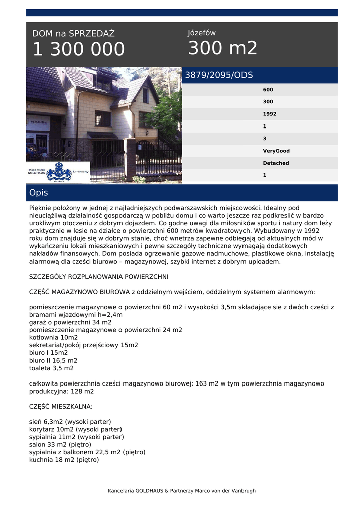 DOM na SPRZEDAŻ 1 300 000 Józefów 300 m2 3879/2095/ODS 600 300 1992 1 3 VeryGood Detached 1 Opis Pięknie położony w jednej z najładniejszych podwarszawskich miejscowości. Idealny pod nieuciążliwą działalność gospodarczą w pobliżu domu i co warto jeszcze raz podkreslić w bardzo urokliwym otoczeniu z dobrym dojazdem. Co godne uwagi dla miłosników sportu i natury dom leży praktycznie w lesie na działce o powierzchni 600 metrów kwadratowych. Wybudowany w 1992 roku dom znajduje się w dobrym stanie, choć wnetrza zapewne odbiegają od aktualnych mód w wykańczeniu lokali mieszkaniowych i pewne szczegóły techniczne wymagają dodatkowych nakładów finansowych. Dom posiada ogrzewanie gazowe nadmuchowe, plastikowe okna, instalację alarmową dla cześci biurowo – magazynowej, szybki internet z dobrym uploadem. SZCZEGÓŁY ROZPLANOWANIA POWIERZCHNI CZĘŚĆ MAGAZYNOWO BIUROWA z oddzielnym wejściem, oddzielnym systemem alarmowym: pomieszczenie magazynowe o powierzchni 60 m2 i wysokości 3,5m składające sie z dwóch cześci z bramami wjazdowymi h=2,4m garaż o powierzchni 34 m2 pomieszczenie magazynowe o powierzchni 24 m2 kotłownia 10m2 sekretariat/pokój przejściowy 15m2 biuro I 15m2 biuro II 16,5 m2 toaleta 3,5 m2 całkowita powierzchnia cześci magazynowo biurowej: 163 m2 w tym powierzchnia magazynowo produkcyjna: 128 m2 CZĘŚĆ MIESZKALNA: sień 6,3m2 (wysoki parter) korytarz 10m2 (wysoki parter) sypialnia 11m2 (wysoki parter) salon 33 m2 (piętro) sypialnia z balkonem 22,5 m2 (piętro) kuchnia 18 m2 (piętro) Kancelaria GOLDHAUS & Partnerzy Marco von der Vanbrugh łazienka 13 m2 (piętro) WC 1,5 m2 (pietro) korytarz 10,3 m2 (piętro) garderoba 4,6 m2 (piętro) study 7 m2 (pietro, antresola w salonie) taras 34 m2 całkowita powierzchnia części mieszkalnej bez tarasu: 137,2 m2 103/ Małgorzata Skwarczyńska-Dymek tel. +48/506-654-298 email: [email protected] Kancelaria GOLDHAUS & Partnerzy Marco von der Vanbrugh Powered by TCPDF (www.tcpdf.org)