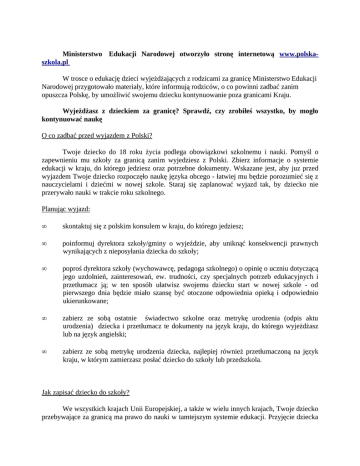 Ministerstwo Edukacji Narodowej otworzyło stronę internetową www.polskaszkola.pl W trosce o edukację dzieci wyjeżdżających z rodzicami za granicę Ministerstwo Edukacji Narodowej przygotowało materiały, które informują rodziców, o co powinni zadbać zanim opuszcza Polskę, by umożliwić swojemu dziecku kontynuowanie poza granicami Kraju. Wyjeżdżasz z dzieckiem za granicę? Sprawdź, czy zrobiłeś wszystko, by mogło kontynuować naukę O co zadbać przed wyjazdem z Polski? Twoje dziecko do 18 roku życia podlega obowiązkowi szkolnemu i nauki. Pomyśl o zapewnieniu mu szkoły za granicą zanim wyjedziesz z Polski. Zbierz informacje o systemie edukacji w kraju, do którego jedziesz oraz potrzebne dokumenty. Wskazane jest, aby juz przed wyjazdem Twoje dziecko rozpoczęło naukę języka obcego - łatwiej mu będzie porozumieć się z nauczycielami i dziećmi w nowej szkole. Staraj się zaplanować wyjazd tak, by dziecko nie przerywało nauki w trakcie roku szkolnego. Planując wyjazd: • skontaktuj się z polskim konsulem w kraju, do którego jedziesz; • poinformuj dyrektora szkoły/gminy o wyjeździe, aby uniknąć konsekwencji prawnych wynikających z nieposyłania dziecka do szkoły; • poproś dyrektora szkoły (wychowawcę, pedagoga szkolnego) o opinię o uczniu dotyczącą jego uzdolnień, zainteresowań, ew. trudności, czy specjalnych potrzeb edukacyjnych i przetłumacz ją; w ten sposób ułatwisz swojemu dziecku start w nowej szkole - od pierwszego dnia będzie miało szansę być otoczone odpowiednia opieką i odpowiednio ukierunkowane; • zabierz ze sobą ostatnie świadectwo szkolne oraz metrykę urodzenia (odpis aktu urodzenia) dziecka i przetłumacz te dokumenty na język kraju, do którego wyjeżdżasz lub na język angielski; • zabierz ze sobą metrykę urodzenia dziecka, najlepiej również przetłumaczoną na język kraju, w którym zamierzasz posłać dziecko do szkoły lub przedszkola. Jak zapisać dziecko do szkoły? We wszystkich krajach Unii Europejskiej, a także w wielu innych krajach, Twoje dziecko przebywające za granicą ma prawo do nauki w tamtejszym systemie edukacji. Przyjęcie dziecka do szkoły regulują przepisy wewnętrzne każdego kraju - dowiesz się o nich przed wyjazdem w ambasadzie danego państwa lub na stronach internetowych ministerstwa edukacji danego państwa. W większości państw na świecie należy zapisać dziecko do lokalnej szkoły i klasy odpowiadającej jego wiekowi. W większości państw nauka jest obowiązkowa od 6 do 16 roku życia ( w Wielkiej Brytanii i Holandii od 5 roku życia). W niektórych krajach dzieci objęte są również nieobowiązkowa edukacją przedszkolną trwająca dwa lata. W szkołach państwowych nauka jest bezpłatna. W większości krajów świadectwa promocyjne, poświadczające przejście z klasy do klasy nie są dokumentami państwowymi, a wyłącznie informacją dla rodziców o postępach dziecka. • wybierz lokalną szkołę, w której dziecko będzie spełniało obowiązek szkolny i obowiązek nauki (może to być również szkoła innego kraju np. francuska w Niemczech lub nauczająca wszystkich przedmiotów polska szkoła w Atenach i Moskwie; dzieci pracowników instytucji UE mogą uczyć się w specjalnie dla nich utworzonych szkołach europejskich); pamiętaj jednak, że mimo obowiązku szkolnego, nie we wszystkich krajach obowiązuje rejonizacja i czasami najbliższa miejsca zamieszkania szkoła może nie mieć wolnych miejsc; • postaraj się zapisać dziecko do szkoły, bezpośrednio albo za pośrednictwem lokalnego biura edukacji, przed rozpoczęciem roku szkolnego, najlepiej jeszcze przed wakacjami; • dowiedz się, najlepiej bezpośrednio w szkole, jakie dokumenty musisz przedstawić zapisując dziecko do szkoły; na ogół potrzebne są: - metryka urodzenia dziecka, - dokument potwierdzający tożsamość (paszport, dowód osobisty), - poświadczenie adresu zamieszkania ( w niektórych krajach wystarczy umowa wynajmu mieszkania), - dokumenty poświadczające dotychczasowa naukę (świadectwa, szkolne), • zapisując dziecko do szkoły dołącz dokumenty poświadczające jego specjalne potrzeby edukacyjne lub dotychczasowe osiągnięcia oraz udział w zajęciach pozalekcyjnych (np. dodatkowa nauka języków obcych, zwycięstwa w olimpiadach i konkursach przedmiotowych, sportowych, artystycznych). Jak podtrzymywać kontakt z polskim językiem i kulturą za granicą? Postaraj się zapewnić dziecku kontakt z językiem polskim i umożliwić mu korzystanie z dostępnej oferty edukacyjnej w języku polskim. W podtrzymaniu kontaktu z językiem ojczystym i polska kultura ułatwiającemu powrót do polskiego systemu edukacji pomogą: • szkoły sobotnie prowadzone m.in. przez polskie organizacje pozarządowe i parafie dające możliwość nauki języka polskiego, a często także polskiej historii, geografii (zajęcia odbywają się popołudniami lub w weekendy); • szkoły polskie przy polskich ambasadach, konsulatach i ich filie - nauczanie uzupełniające naukę w lokalnej szkole o jęz. polski, historię, geografię Polski, czasem WOS, religię i matematykę (zajęcia wieczorem lub w weekendy); Języka polskiego można się uczyć także: • w Szkołach Europejskich (wyłącznie dla dzieci pracowników instytucji europejskich), na mocy Konwencji o Statucie Szkól Europejskich; • w krajach Unii Europejskiej, zarejestrowani pracownicy migrujący mogą ubiegać się o nauczanie języka ojczystego w lokalnej szkole publicznej (na podstawie Dyrektywy Rady 77/486/EWG z dnia 25 lipca 1977 w sprawie kształcenia dzieci pracowników migrujących). Informacji o polskich szkołach sobotnich i innych możliwościach nauki w języku polskim szukaj na stronie www.polska-szkola.pl Pamiętaj, żeby Twoje dziecko mogło łatwiej wrócić do polskiego systemu edukacji: • w trakcie pobytu za granicą zapewnij dziecku żywy kontakt z językiem polskim oraz w miarę możliwości stara