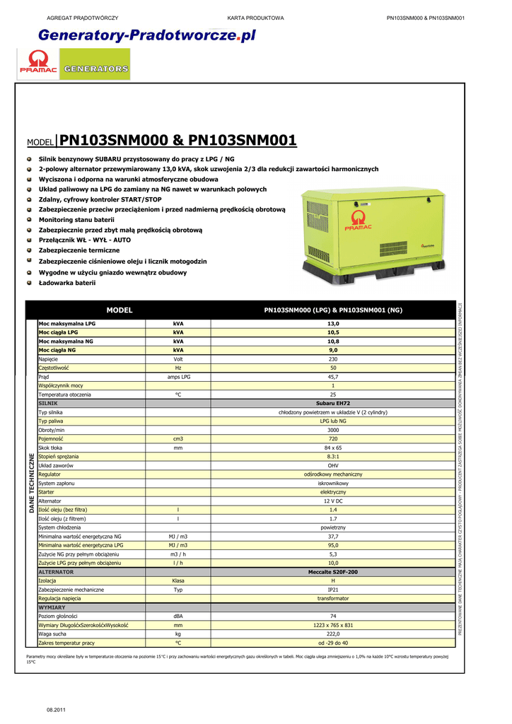 AGREGAT PRĄDOTWÓRCZY MODEL KARTA PRODUKTOWA PN103SNM000 & PN103SNM001 |PN103SNM000 & PN103SNM001 Silnik benzynowy SUBARU przystosowany do pracy z LPG / NG 2-polowy alternator przewymiarowany 13,0 kVA, skok uzwojenia 2/3 dla redukcji zawartości harmonicznych Wyciszona i odporna na warunki atmosferyczne obudowa Układ paliwowy na LPG do zamiany na NG nawet w warunkach polowych Zdalny, cyfrowy kontroler START/STOP Zabezpieczenie przeciw przeciążeniom i przed nadmierną prędkością obrotową Monitoring stanu baterii Zabezpiecznie przed zbyt małą prędkością obrotową Przełącznik WŁ - WYŁ - AUTO Zabezpieczenie termiczne Zabezpieczenie ciśnieniowe oleju i licznik motogodzin Wygodne w użyciu gniazdo wewnątrz obudowy MODEL PN103SNM000 (LPG) & PN103SNM001 (NG) Moc maksymalna LPG kVA Moc ciągła LPG kVA 10,5 Moc maksymalna NG kVA 10,8 Moc ciągła NG kVA 9,0 Napięcie Volt 230 Częstotliwość Prąd Hz 50 amps LPG 45,7 °C 25 Współczynnik mocy Temperatura otoczenia 1 SILNIK Subaru EH72 Typ silnika chłodzony powietrzem w układzie V (2 cylindry) Typ paliwa LPG lub NG 3000 Obroty/min DANE TECHNICZNE 13,0 Pojemność cm3 720 Skok tłoka mm 84 x 65 Stopień sprężania 8.3:1 Układ zaworów OHV Regulator odśrodkowy mechaniczny System zapłonu iskrownikowy elektryczny Starter 12 V DC Alternator Ilość oleju (bez filtra) l 1.4 Ilość oleju (z filtrem) l 1.7 powietrzny System chłodzenia Minimalna wartość energetyczna NG MJ / m3 37,7 Minimalna wartość energetyczna LPG MJ / m3 95,0 Zużycie NG przy pełnym obciążeniu m3 / h 5,3 Zużycie LPG przy pełnym obciążeniu l/h 10,0 ALTERNATOR Izolacja Zabezpieczenie mechaniczne Meccalte S20F-200 Klasa H Typ IP21 Regulacja napięcia transformator WYMIARY Poziom głośności dBA 74 Wymiary DługośćxSzerokośćxWysokość mm 1223 x 765 x 831 Waga sucha kg 222,0 Zakres temperatur pracy °C od -29 do 40 Parametry mocy określane były w temperaturze otoczenia na poziomie 15°C i przy zachowaniu wartości energetycznych gazu określonych w tabeli. Moc ciągła ulega zmniejszeniu o 1,0% na każde 10°C wzrostu temperatury powyżej 15°C 08.2011 PREZENTOWANE DANE TECHINCZNE MAJĄ CHARAKTER CZYSTO POGLĄDOWY - PRODUCENT ZASTRZEGA SOBIE MOŻLIWOŚĆ DOKONYWANIA ZMIAN BEZ WCZEŚNIEJSZEJ INFORMACJI Ładowarka baterii