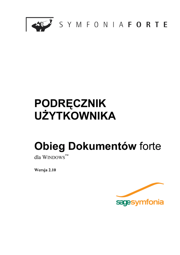 PODRĘCZNIK UŻYTKOWNIKA Obieg Dokumentów forte dla WINDOWS™ Wersja 2.10 Powielanie w jakiejkolwiek formie całości lub fragmentów podręcznika bez pisemnej zgody firmy Sage Symfonia Sp. z o.o. jest zabronione. Copyright © Sage Symfonia Sp. z o.o. Wszelkie prawa zastrzeżone. All Rights Reserved. Windows™ jest znakiem towarowym firmy Microsoft Corporation. ® Microsoft SQL Server™ jest znakiem towarowym firmy Microsoft Corporation. Adobe, Acrobat, Acrobat Reader, Acrobat Distiller są zastrzeżonymi znakami towarowymi firmy Adobe Systems Inc. Opracowanie i skład: Sage Symfonia Sp. z o.o. Warszawa maj 2005 Spis treści Wstęp 1 Zastrzeżenia ................................................................................................................................................. 1 System Symfonia forte................................................................................................................................. 1 Dokumentacja programu .............................................................................................................................. 2 Korzystanie z podręcznika drukowanego ............................................................................................... 2 Korzystanie z podręczników elektronicznych ........................................................................................ 2 Korzystanie z pomocy kontekstowej ...................................................................................................... 3 Aktualne informacje..................................................................................................................................... 5 Pojęcia podstawowe 7 Filozofia działania programu ............................................................................................................................. 7 Pojęcia podstawowe........................................................................................................................................... 7 Użytkownicy i ich uprawnienia .............................................................................................................. 7 Dokument ............................................................................................................................................... 8 Akceptacja .............................................................................................................................................. 8 Archiwum............................................................................................................................................... 8 Proces ..................................................................................................................................................... 8 Poziom tajności ...................................................................................................................................... 8 Priorytet dokumentu ............................................................................................................................... 8 Kontrakt.................................................................................................................................................. 8 Zadanie ................................................................................................................................................... 8 Przygotowanie programu do pracy 9 Ustawienia ogólne ............................................................................................................................................. 9 Uzupełnienie słowników prostych................................................................................................................... 11 Kontrakty ................................................................................................................................................... 11 Opis dokumentu ......................................................................................................................................... 11 Poziomy tajności dokumentu ..................................................................................................................... 12 Priorytety dokumentu................................................................................................................................. 12 Słowniki dodatkowe................................................................................................................................... 12 Słowniki zewnętrzne .................................................................................................................................. 13 Wprowadzenie listy użytkowników................................................................................................................. 13 Zbudowanie struktury organizacyjnej.............................................................................................................. 15 Wypełnienie listy stanowisk....................................................................................................................... 15 Uzupełnienie słownika typów organizacji ................................................................................................. 15 Opisanie struktury organizacyjnej.............................................................................................................. 16 Umieszczenie użytkowników w strukturze firm ........................................................................................ 17 Zdefiniowanie procesów obiegu dokumentów ................................................................................................ 17 Zdefiniowanie poziomów akceptacji ............................................................................................................... 19 Zdefiniowanie typów archiwów ...............................................................................................................
