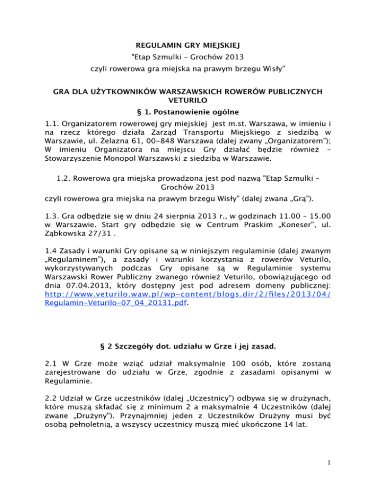 REGULAMIN GRY MIEJSKIEJ "Etap Szmulki – Grochów 2013 czyli rowerowa gra miejska na prawym brzegu Wisły” GRA DLA UŻYTKOWNIKÓW WARSZAWSKICH ROWERÓW PUBLICZNYCH VETURILO § 1. Postanowienie ogólne 1.1. Organizatorem rowerowej gry miejskiej jest m.st. Warszawa, w imieniu i na rzecz którego działa Zarząd Transportu Miejskiego z siedzibą w Warszawie, ul. Żelazna 61, 00-848 Warszawa (dalej zwany „Organizatorem”); W imieniu Organizatora na miejscu Gry działać będzie również – Stowarzyszenie Monopol Warszawski z siedzibą w Warszawie. 1.2. Rowerowa gra miejska prowadzona jest pod nazwą "Etap Szmulki – Grochów 2013 czyli rowerowa gra miejska na prawym brzegu Wisły” (dalej zwana „Grą”). 1.3. Gra odbędzie się w dniu 24 sierpnia 2013 r., w godzinach 11.00 – 15.00 w Warszawie. Start gry odbędzie się w Centrum Praskim „Koneser”, ul. Ząbkowska 27/31 . 1.4 Zasady i warunki Gry opisane są w niniejszym regulaminie (dalej zwanym „Regulaminem”), a zasady i warunki korzystania z rowerów Veturilo, wykorzystywanych podczas Gry opisane są w Regulaminie systemu Warszawski Rower Publiczny zwanego również Veturilo, obowiązującego od dnia 07.04.2013, który dostępny jest pod adresem domeny publicznej: http://www.veturilo.waw.pl/wp-content/blogs.dir/2/files/2013/04/ Regulamin-Veturilo-07_04_20131.pdf. § 2 Szczegóły dot. udziału w Grze i jej zasad. 2.1 W Grze może wziąć udział maksymalnie 100 osób, które zostaną zarejestrowane do udziału w Grze, zgodnie z zasadami opisanymi w Regulaminie. 2.2 Udział w Grze uczestników (dalej „Uczestnicy”) odbywa się w drużynach, które muszą składać się z minimum 2 a maksymalnie 4 Uczestników (dalej zwane „Drużyny”). Przynajmniej jeden z Uczestników Drużyny musi być osobą pełnoletnią, a wszyscy uczestnicy muszą mieć ukończone 14 lat. 1 2.3 Uczestnicy i Drużyny dokonują rejestracji swojego udziału w Grze poprzez formularz zgłoszeniowy. Formularz należy pobrać ze strony internetowej: www.monopolpraski.pl, wypełnić zgodnie z instrukcją i odesłać na adres poczty elektronicznej: [email protected]; 2.4 W związku z ograniczeniem liczby Uczestników wskazanym w 2.1 powyżej, decyduje kolejność prawidłowych zgłoszeń i rejestracji. 2.5 W trakcie Gry Uczestnicy przemieszczają się na rowerach Veturilo od miejsca i w czasie wskazanym w 1.3 powyżej. Zabrania się korzystania z samochodów oraz rozdzielania się Drużyny. 2.6 Rowery Veturilo wypożyczane są przez każdego z Uczestników samodzielnie przed rozpoczęciem Gry. Drużyna zobowiązana jest do przybycia na miejsce startu na rowerach Veturilo do godziny 11.00. Od momentu rozpoczęcia Gry do godziny jej zakończenia (zgodnie z 1.3 powyżej) korzystanie z rowerów Veturilo jest bezpłatne. 2.7 Drużyna zarejestrowania i dopuszczona do udziału w Grze, która nie przybędzie na miejsce startu w wyznaczonym miejscu i czasie, traci prawo uczestnictwa w Grze. 2.8 Drużyny po przybyciu na miejsce startu otrzymają mapę oraz kartę zadań składającą się z dwóch części. Pierwsza część to zadania wskazane przez agentów, którzy będą rozmieszczeni w określonych miejscach terenu Gry. Druga część, to zadania do rozwiązania podczas Gry. 2.9 Gra miejska polega na dotarciu do miejsc wyznaczonych na karcie zadań oraz wykonaniu zadań samodzielnych lub wskazywanych przez agentów (dalej zwane „Zadaniami”), w czasie trwania Gry (patrz 1.3 powyżej), oraz przybyciu na metę Gry i przekazaniu wypełnionej karty Gry Organizatorowi. 2.10 Drużyny samodzielnie dokonują wyboru trasy Gry oraz wykonywanych Zadań. Prawidłowe wykonanie Zadania jest punktowane zgodnie z wytycznymi znajdującymi się na karcie zadań. 2.11 Klasyfikację Drużyn po zakończeniu Gry ustala się w oparciu o zdobyte punkty lub wykonane zadania specjalne. Klasyfikację Gry ustala się w oparciu o karty Gry oddane Organizatorowi w czasie Gry. Drużyna, która nie odda karty Gry lub nie dotrze do mety Gry do godz. 15.00 nie jest klasyfikowana. 2.12 Wyniki Gry zostaną podane do wiadomości do dnia 29.08.2013 r. drogą mailową oraz podane na stronie internetowej: www.monopolpraski.pl., www.veturilo.waw.pl; 2 2.13 Część Zadań wymagać będzie wykonania zdjęć, które muszą zostać przesłane na adres poczty elektronicznej: [email protected], do godz. 10.00 w dniu następnym po dniu zakończenia Gry. Drużyna powinna posiadać własny aparat fotograficzny, lub telefon komórkowy z aparatem. 2.14 Na trasie Gry rozmieszczone będą wskazówki, informacje oraz elementy gry. Zabrania się ingerowania lub niszczenia informacji lub elementów Gry umieszczonych przez Organizatora. W przypadku stwierdzenia naruszenia tego obowiązku Drużyna zostaje wyłączona z Gry. 2.15 Pełnoletni Uczestnicy Drużyn odpowiedzialni są za niepełnoletnich Uczestników swoich Drużyn. 2.16 W związku z odbywaniem Gry na rowerach Uczestnicy obowiązani są do przestrzegania zasad ruchu drogowego, przepisów prawa i dobrych obyczajów, oraz do stosowania się do regulaminu Veturilo wskazanego w pkt 1.4 powyżej. 2.17 Naruszenie przez Uczestnika lub Drużynę Regulaminu, zasad przepisów ruchu drogowego, przepisów prawa, udział w Grze po spożyciu alkoholu, lub środków odurzających, inne zachowania nieobyczajne lub narażające na niebezpieczeństwo Uczestników, Organizatora i osoby działające na jego zlecenie lub osoby postronne, uprawnia Organizatora do wykluczenia Drużyny z Gry oraz podjęcia wszelkich środków zaradczych. 2.18 Uczestnik wyraża wolę uczestnictwa w Grze na zasadach i warunkach zamieszczonych w niniejszym Regulaminie z chwilą przesłania Organizatorowi formularza rejestracyjnego, zgodnie z 2.3 powyżej. § 3 Nagrody 3.1 Nad wyłonieniem zwycięzców i ustaleniem klasyfikacji generalnej Gry, czuwać będzie komisja powołana przez Organizatora. 3.2 W skład komisji wchodzić będą osoby reprezentujące Organizatora lub podmioty związane z 