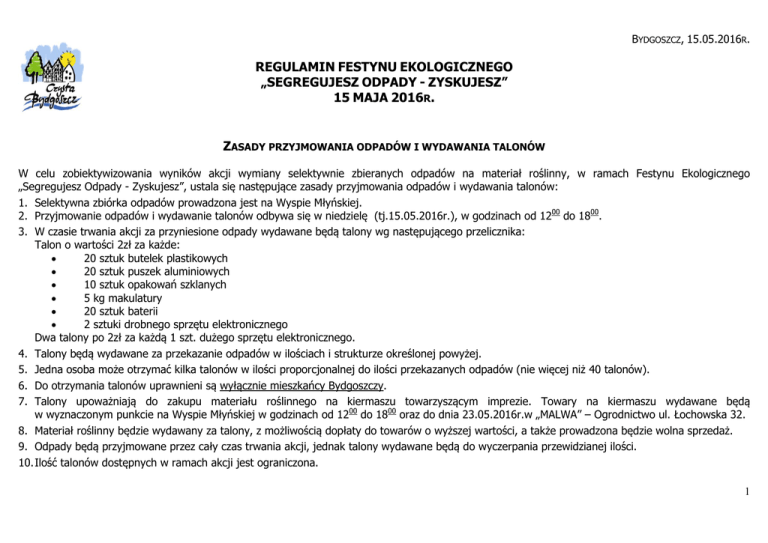 BYDGOSZCZ, 15.05.2016R. REGULAMIN FESTYNU EKOLOGICZNEGO „SEGREGUJESZ ODPADY - ZYSKUJESZ” 15 MAJA 2016R. ZASADY PRZYJMOWANIA ODPADÓW I WYDAWANIA TALONÓW W celu zobiektywizowania wyników akcji wymiany selektywnie zbieranych odpadów na materiał roślinny, w ramach Festynu Ekologicznego „Segregujesz Odpady - Zyskujesz”, ustala się następujące zasady przyjmowania odpadów i wydawania talonów: 1. Selektywna zbiórka odpadów prowadzona jest na Wyspie Młyńskiej. 2. Przyjmowanie odpadów i wydawanie talonów odbywa się w niedzielę (tj.15.05.2016r.), w godzinach od 1200 do 1800. 3. W czasie trwania akcji za przyniesione odpady wydawane będą talony wg następującego przelicznika: Talon o wartości 2zł za każde: 20 sztuk butelek plastikowych 20 sztuk puszek aluminiowych 10 sztuk opakowań szklanych 5 kg makulatury 20 sztuk baterii 2 sztuki drobnego sprzętu elektronicznego Dwa talony po 2zł za każdą 1 szt. dużego sprzętu elektronicznego. 4. Talony będą wydawane za przekazanie odpadów w ilościach i strukturze określonej powyżej. 5. Jedna osoba może otrzymać kilka talonów w ilości proporcjonalnej do ilości przekazanych odpadów (nie więcej niż 40 talonów). 6. Do otrzymania talonów uprawnieni są wyłącznie mieszkańcy Bydgoszczy. 7. Talony upoważniają do zakupu materiału roślinnego na kiermaszu towarzyszącym imprezie. Towary na kiermaszu wydawane będą w wyznaczonym punkcie na Wyspie Młyńskiej w godzinach od 1200 do 1800 oraz do dnia 23.05.2016r.w „MALWA” – Ogrodnictwo ul. Łochowska 32. 8. Materiał roślinny będzie wydawany za talony, z możliwością dopłaty do towarów o wyższej wartości, a także prowadzona będzie wolna sprzedaż. 9. Odpady będą przyjmowane przez cały czas trwania akcji, jednak talony wydawane będą do wyczerpania przewidzianej ilości. 10. Ilość talonów dostępnych w ramach akcji jest ograniczona. 1 BYDGOSZCZ, 15.05.2016R. REGULAMIN FESTYNU EKOLOGICZNEGO „SEGREGUJESZ ODPADY - ZYSKUJESZ” 15 MAJA 2016R. 11. Sprawy nieuregulowane w treści niniejszych zasad rozstrzygają pracownicy Biura Zarządzania Gospodarką Odpadami Komunalnymi Urzędu Miasta Bydgoszczy. Urząd Miasta Bydgoszczy Zbieramy Nie zbieramy puste butelki po napojach (PET) butelki po chemii gospodarczej (kosmetyki, środki czystości) butelki szklane słoiki (bez nakrętek) gazety, książki, zeszyty tekturę zwykłą i falistą, worki papierowe, ścinki drukarskie, PLASTIK tworzywa sztuczne pochodzenia medycznego, mokre folie, opakowania i butelki po olejach i smarach, puszki i pojemniki po farbach i lakierach opakowania po środkach chwasto i owadobójczych styropian SZKŁO ceramika (porcelana, naczynia typu arco, talerze, naczynia żaroodporne, doniczki), lustra, szklane opakowania farmaceutyczne i chemiczne z pozostałościami zawartości, szkło budowlane (szyby okienne, szkło zbrojone), szyby samochodowe żarówki PAPIER opakowania z zawartością np. żywnością, wapnem, cementem, celofan, kalka techniczna, tapety prospekty, foliowane i lakierowane katalogi zatłuszczone papiery np. po maśle kartony po mleku i sokach 2 BYDGOSZCZ, 15.05.2016R. REGULAMIN FESTYNU EKOLOGICZNEGO „SEGREGUJESZ ODPADY - ZYSKUJESZ” 15 MAJA 2016R. puszki aluminiowe po napojach PUSZKI ALUMINIOWE opakowania aluminiowe połączone z papierem lub innymi metalami bądź plastikiem puszki stalowe BATERIE ZUŻYTY SPRZĘT ELEKTRYCZNY I ELEKTRONICZNY Mały: suszarki, żelazka, czajniki, lokówki, golarki, tostery, klawiatury komputerowe, telefony komórkowe itp. Duży: telewizory, monitory, komputery, kuchenki itp. Poza wyżej wymienionymi nie są przyjmowane żadne inne odpady. 3 BYDGOSZCZ, 15.05.2016R. REGULAMIN FESTYNU EKOLOGICZNEGO „SEGREGUJESZ ODPADY - ZYSKUJESZ” 15 MAJA 2016R. ZASADY PRZYDZIELANIA TALONÓW 1. Na przeprowadzenie akcji zostaje przeznaczonych 10.000 sztuk talonów ponumerowanych od numeru 0001 do 10 000. 2. Talony będą wydawane przez przedstawiciela Biura Zarządzania Gospodarką Odpadami Komunalnymi w dniu 15 maja 2016 roku w trakcie festynu. 3. Talon składa się z dwóch części. Jedna (po oderwaniu od całości) przekazywana jest osobie przekazującej odpady, druga jako dowód wydania talonu pozostaje do rozliczenia w bloczku. 4. Sprawy nieuregulowane w treści niniejszych zasad rozstrzyga Dyrektor Biura Zarządzania Gospodarką Odpadami Komunalnymi. 4