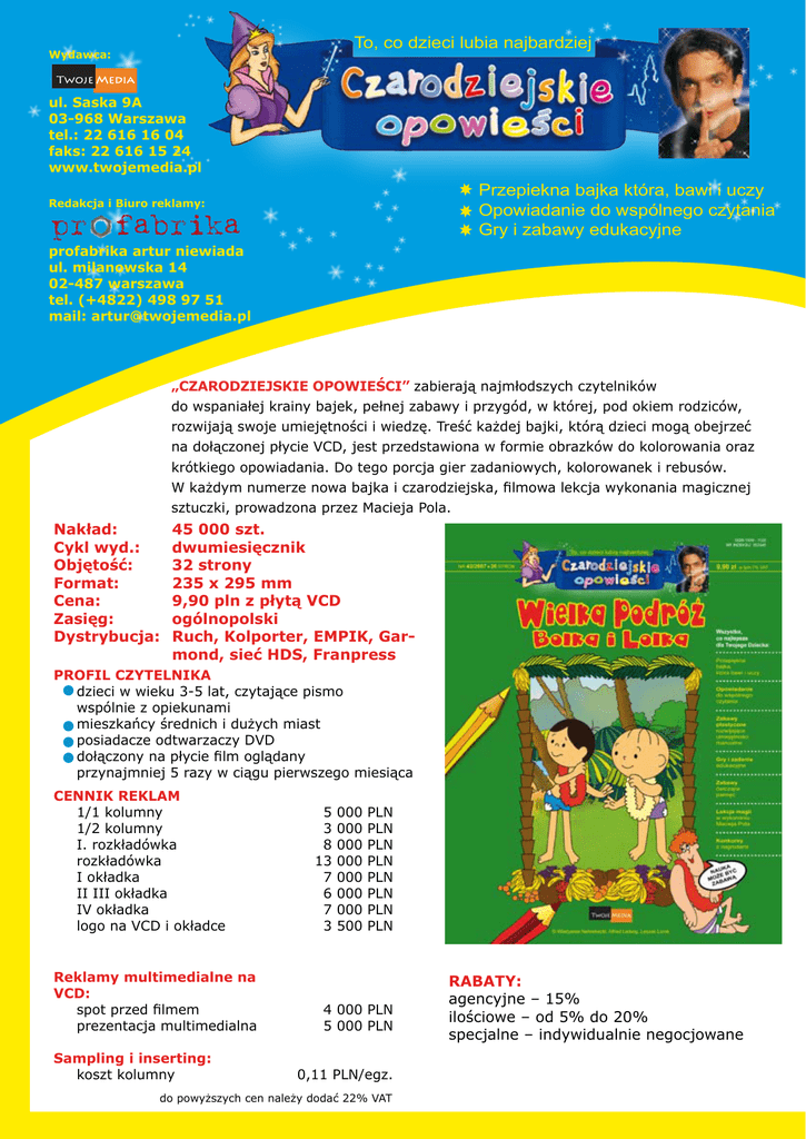 To, co dzieci lubia najbardziej Wydawca: ul. Saska 9A 03-968 Warszawa tel.: 22 616 16 04 faks: 22 616 15 24 www.twojemedia.pl Przepiekna bajka która, bawi i uczy Opowiadanie do wspólnego czytania Gry i zabawy edukacyjne Redakcja i Biuro reklamy: profabrika artur niewiada ul. milanowska 14 02-487 warszawa tel. (+4822) 498 97 51 mail: [email protected] „CZARODZIEJSKIE OPOWIEŚCI” zabierają najmłodszych czytelników do wspaniałej krainy bajek, pełnej zabawy i przygód, w której, pod okiem rodziców, rozwijają swoje umiejętności i wiedzę. Treść każdej bajki, którą dzieci mogą obejrzeć na dołączonej płycie VCD, jest przedstawiona w formie obrazków do kolorowania oraz krótkiego opowiadania. Do tego porcja gier zadaniowych, kolorowanek i rebusów. W każdym numerze nowa bajka i czarodziejska, filmowa lekcja wykonania magicznej sztuczki, prowadzona przez Macieja Pola. Nakład: Cykl wyd.: Objętość: Format: Cena: Zasięg: Dystrybucja: 45 000 szt. dwumiesięcznik 32 strony 235 x 295 mm 9,90 pln z płytą VCD ogólnopolski Ruch, Kolporter, EMPIK, Garmond, sieć HDS, Franpress PROFIL CZYTELNIKA dzieci w wieku 3-5 lat, czytające pismo wspólnie z opiekunami mieszkańcy średnich i dużych miast posiadacze odtwarzaczy DVD dołączony na płycie film oglądany przynajmniej 5 razy w ciągu pierwszego miesiąca CENNIK REKLAM 1/1 kolumny 1/2 kolumny I. rozkładówka rozkładówka I okładka II III okładka IV okładka logo na VCD i okładce Reklamy multimedialne na VCD: spot przed filmem prezentacja multimedialna Sampling i inserting: koszt kolumny 5 3 8 13 7 6 7 3 000 000 000 000 000 000 000 500 PLN PLN PLN PLN PLN PLN PLN PLN 4 000 PLN 5 000 PLN 0,11 PLN/egz. do powyższych cen należy dodać 22% VAT RABATY: agencyjne – 15% ilościowe – od 5% do 20% specjalne – indywidualnie negocjowane Reklamy na płyty VCD można dostarczyć na następujących nośnikach: - beta analogowa - beta cyfrowa - mini DVD Reklamy prasowe przyjmujemy jako pliki w następujących formatach: · PDF 1.3, 1.4 · JPG ( 300 DPI z najwyższą jakością) · TIFF Reklama powinna mieć spady 5 mm, które zostają obcięte w trakcie druku. W przypadku reklam pionowych, zajmujących pół albo 1/3 strony, prosimy o nie umieszczanie spadów po lewej stronie, jeśli reklama ma się znaleźć na stronie prawej (nieparzystej) albo po prawej stronie, jeśli reklama ma się znaleźć na stronie lewej (parzystej). W przypadku reklam poziomych, jeśli mają się znaleźć na górze strony, spadów nie powinno być na dole, natomiast jeśli znajdą się na dole strony, spadów nie powinno być na górze. Elementy istotne (tekst, logo itp.) powinny znajdować się nie mniej niż 3 mm od miejsca obcięcia reklamy (zakładając 5 mm spad będzie to 8 mm od brzegu). Uwaga! Grzbiet pisma jest zszywany w związku z tym, zaleca się nie umieszczanie istotnych informacji ! Wymiary reklam netto: · Cała strona – … x … mm · Pół strony – pion … x … mm , poziom ….. mm · 1/3 strony – pion … mm, poziom … mm Do podanych wymiarów trzeba doliczyć po 5 mm na spady. Dostarczenie odbitki próbnej (Cromalin, Matchprint etc.) obliguje pismo do odtworzenia kolorów reklamy w druku. Odbitkami próbnymi nie są wydruki z drukarek atramentowych, laserowych etc. Reklamy prosimy przesyłać drogą elektroniczną równolegle na adresy: [email protected], [email protected], [email protected] lub pocztą (na nośnikach CDR): PROFABRIKA ul. Milanowska 14 02-487 Warszawa e-mail: [email protected]