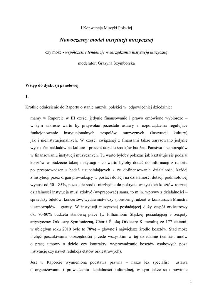I Konwencja Muzyki Polskiej Nowoczesny model instytucji muzycznej czy może - współczesne tendencje w zarządzaniu instytucją muzyczną moderator: Grażyna Szymborska Wstęp do dyskusji panelowej 1. Krótkie odniesienie do Raportu o stanie muzyki polskiej w odpowiedniej dziedzinie: mamy w Raporcie w III części jedynie finansowanie i prawo omówione wybiórczo – w tym zakresie warto by przywołać pozostałe ustawy i rozporządzenia regulujące funkcjonowanie instytucjonalnych zespołów muzycznych (instytucji kultury) jak i nieinstytucjonalnych. W części związanej z finansami także zarysowano jedynie wysokości nakładów na kulturę - procent udziału środków budżetu Państwa i samorządów w finansowaniu instytucji muzycznych. Tu warto byłoby pokazać jak kształtuje się podział kosztów w budżecie takiej instytucji - co warto byłoby dodać do informacji z raportu po przeprowadzeniu badań uzupełniających - że dofinansowanie działalności każdej z instytucji przez organ prowadzący w postaci dotacji na działalność, dotacji podmiotowej wynosi od 50 - 85%, pozostałe środki niezbędne do pokrycia wszystkich kosztów rocznej działalności instytucja musi zdobyć (wypracować) sama, to m.in. wpływy z działalności – sprzedaży biletów, koncertów, wydawnictw czy sponsoring, udział w konkursach Ministra i samorządów, granty. W instytucji muzycznej posiadającej duży zespół orkiestrowy ok. 70-80% budżetu stanowią płace (w Filharmonii Śląskiej posiadającej 3 zespoły artystyczne: Orkiestrę Symfoniczną, Chór i Śląską Orkiestrę Kameralną ze 177 etatami, w ubiegłym roku 2010 było to 78%) – główne i największe źródło kosztów. Stąd może i chęć poszukiwania oszczędności przede wszystkim w tej dziedzinie (zamiast umów o pracę umowy o dzieło czy kontrakty, wyprowadzanie kosztów osobowych poza instytucję czy nawet redukcja etatów orkiestrowych). Jest w Raporcie wymieniona podstawa prawna – nasze lex specialis: ustawa o organizowaniu i prowadzeniu działalności kulturalnej, w tym także są omówione 1 projekty zmian legislacyjnych tej ustawy, które mimo negatywnych oddźwięków ze strony związkowej, zostały skierowane do prac w Sejmie. Do tych zmian – także w toku dyskusji zamierzamy się odnieść. Odkładam na bok rozważania o prowadzeniu działalności koncertowej i prowadzenia zespołów muzycznych przez tzw. organizacje pozarządowe, czy firmy prywatne – jako zjawisko znikome, choć ważne, lecz poziom finansowania jest bardzo niewielki . Tematy do dyskusji obejmować będą problemy instytucji kultury prowadzącej działalność w dziedzinie muzyki i prowadzącej przynajmniej jeden etatowy zespół artystyczny. 2. Podstawą takiej instytucji muzycznej jest zespół (orkiestra chór): Postawmy pytania: - który punkt widzenia jest najważniejszy? Instytucji czy muzyka? Wymogi polskiego prawa czy nawyki i komfort pracy artysty, finanse publiczne i kodeks pracy czy tradycje, przyzwyczajenia i oczekiwania) - tu stawiam na instytucję, bowiem o interes publiczny idzie i misję działalności, ale… w zgodzie z prawem pracy i poszanowaniem godności artysty muzyka, - etat czy kontrakt dla muzyka, zalety i wady obu rozwiązań (np. etaty kosztowniejsze także i dla muzyka, kontrakty oszczędniejsze dla kosztów instytucji także i korzystniejsze dla muzyka m.in. 50% koszty uzyskania w całym kontrakcie, więcej otrzymuje się „na rękę”, ale o ZUS i przyszłą emeryturę trzeba zadbać samemu, można tu wynegocjować lepsze warunki, nie tylko finansowe, - poczucie stabilizacji życiowej muzyka i budowania stabilnego zespołu – to zatrudnienie na etatach, a wszak o budowanie stabilnego spójnie brzmiącego zespołu chodzi w orkiestrze, ale gorset kodeksu pracy uciska w codziennej pracy (jak ewidencjonować czas pracy muzyka orkiestry symfonicznej - tradycja a wymogi prawa pracy, nie objęcie partyturą oznacza tygodniowy przestój? Co z tzw. urlopami na żądanie, np. w dniu koncertu???, problemy ZUSu przy ustalaniu emerytur – był w pracy czy miał zwolnienie lekarskie (takie okazał np. w drugim miejscu pracy ale nie w orkiestrze – bo w niej miał przestój, jak zapisać w umowie pracę wykonywaną z tytułu praw autorskich - próby i koncerty i jak zapisywać w tej umowie prawa majątkowe instytucji do dzieła wykonanego w wyniku stosunku pracy, czy trzeba to zapisywać?), poczucie tymczasowości (destabilizacja) przy krótkotrwałych 2 kontraktach ale szeroko można dookreślić wszelkie warunki także i czasowe – oba warianty mają swoje zalety, - angażowanie muzyka i weryfikacja drogą konkursu, czy „należy” weryfikować muzyka już zaangażowanego drogą przesłuchań, w jakich warunkach? – czy kierownik zespołu może zarządzić przesłuchania, zwolnić muzyka źle grającego – właśnie toczy się fala niepokojów społecznych w filharmoniach, - czy zespół w takich sytuacjach może domagać się zmiany swojego kierownika, dyrektora, mimo dobrych wyników prowadzenia instytucji, ewidentnych osiągnięć? Niedobre przykłady dała orkiestra w Białymstoku i władze samorządowe, podobnie w Olsztynie…, - co powinna zawierać umowa kontraktowa, aby stała się konkurencyjną formą zatrudnienia dla muzyka, brak wypracowanych modeli w Europie - propozycje zmian w ustawie o organizowaniu działalności kulturalnej, omówione w raporcie i w komentarzu na rozpoczęciu obrad i opinie konferencji dyrektorów orkiestr: nie zgadzają się oni z propozycjami legislacyjnymi rozpatrywanymi w sejmie w zakresie zasad zatrudniania muzyków, m.in. nierówność pracowników artystycznych wobec prawa, gorszy start, sezonowe zatrudnianie zagraża brzmieniu orkiestry, który im dłużej wspólnie gra, tym ma szansę wznosić się na coraz wyższy poziom. Projekt ustawy nie odpowiada zadaniom jakie kultura stawia instytucjom – zwłaszcza takim jak Filharmonia, gdzie podstawą działania jest orkies