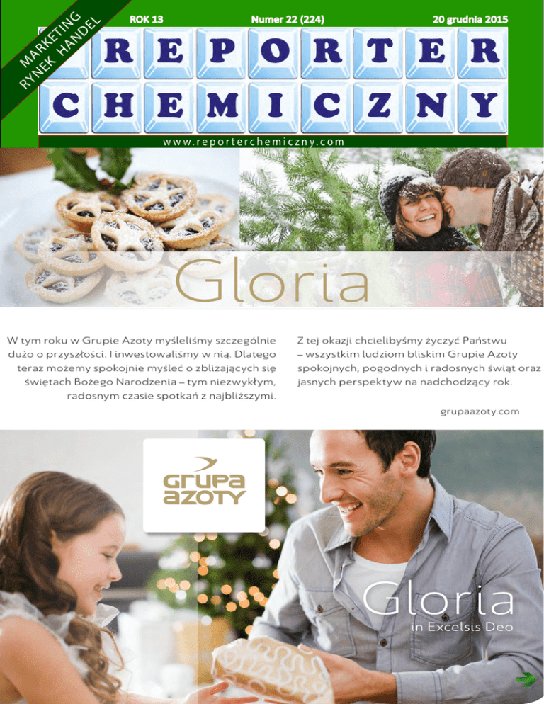 RY M N AR EK K E HA TIN N G D EL ROK 13 Numer 22 (224) 20 grudnia 2015 w w w. r e p o r t e r c h e m i c z n y. c o m Gloria W tym roku w Grupie Azoty myśleliśmy szczególnie dużo o przyszłości. I inwestowaliśmy w nią. Dlatego teraz możemy spokojnie myśleć o zbliżających się świętach Bożego Narodzenia – tym niezwykłym, radosnym czasie spotkań z najbliższymi. Z tej okazji chcielibyśmy życzyć Państwu – wszystkim ludziom bliskim Grupie Azoty spokojnych, pogodnych i radosnych świąt oraz jasnych perspektyw na nadchodzący rok. grupaazoty.com Warszawa, 20 grudnia 2015r. Kochani, za kilka dni Boże Narodzenie. Z tej okazji życzę wszystkim Czytelnikom i naszym Sympatykom dużo zdrowia, pomyślności i powodzenia w interesach. A dla całej branży miła niespodzianka. Tydzień temu miałem okazję porozmawiać z ładną i miłą krakowianką, która właśnie objęła funkcję podsekretarza stanu w ministerstwie rozwoju. Wysłuchałem pierwszego publicznego wystąpienia pani Jadwigi Emilewicz i jestem zbudowany. Takich ludzi nam potrzeba: młodych, zdolnych, doświadczonych, pracowitych i chcących coś dobrego dla Polski zrobić. Pani minister jest teraz odpowiedzialna m.in. za innowacje. Wyraża się bardzo dobrze i o Grupie Azoty, i o Synthosie. Kładzie nacisk na potrzebę budowy polskiej marki. A właśnie prezes Zieliński z PIPC startuje z promocją marki „Polska Chemia”. Zapytałem jeszcze panią minister czy wzięła by na przykład udział w Kongresie Polska Chemia. Mamy więc dobrego ducha wśród decydentów i z wielką nadzieją patrzę na 2016 rok. Życzę wszystkim więcej uśmiechu i radości na co dzień. Ale nie jest to łatwe. Nie muszę nastawiać telewizji, wystarczy, że uruchomię komputer. Nie potrzebujemy w naszym kraju terrorystów islamskich (prawdziwi muzułmanie miłują pokój i są takimi samymi ludźmi, jak my), bo mamy własnych wariatów politycznych, którzy nawołują do krwawych jatek i palenia budynków. Z drugiej strony mam świadomość, że może to nieprawda, a scena polityczna jest inscenizowana przez media, które niestety są w większości w rękach zagranicznych, gdzie liczy się tylko kasa i im większa rozróba, tym większe czytelnictwo. Mówię to także z własnego doświadczenia. Jakieś 10 lat temu na targach poznańskich podeszła do mojego stoiska telewizja i znany dziennikarz zapytał mnie o tworzywa sztuczne, przychodząc oczywiście z gotową tezą i oczekując, że ją potwierdzę. A ja tymczasem zacząłem zachwalać chemię i tworzywa sztuczne tłumacząc, ile dobrodziejstwa i korzyści ma człowiek z rozwoju tej nauki, że chemia otacza nas zewsząd i to, że dłużej i lepiej żyjemy oraz mamy żywności pod dostatkiem zawdzięczamy właśnie przemysłowi chemicznemu. Dziennikarz zzieleniał z zaskoczenia, że ja zamiast opluwać chemię, czego ode mnie oczekiwał, zachwalam ją. A już o mało nie spadł ze stołka, gdy powiedziałem, że najlepszym dla mnie tworzywem sztucznym jest PVC, bo jest najtańszym z tworzyw, najlepiej przebadanym i bezproblemowo stosowanym od dziesiątków lat zarówno na rury, okna, drzwi, tapety, dywany, jak i na woreczki do przechowywania krwi. To jest właśnie chemia i temu zawdzięcza swój sukces. Niestety czarny PR stosowany na całym świecie z dużym nakładem kosztów przez naszą konkurencję powoduje, że PVC jest coraz rzadziej stosowany, a szkoda. Spotkamy się już w przyszłym roku, 5 stycznia w godzinach porannych. I liczę, że nie tylko 100% Czytelników do tej pory odnowi swoją prenumeratę, ale przybędą też nowi. Namawiam i zapraszam do czytania Reportera Chemicznego i współtworzenia naszego dwutygodnika, aby był jeszcze ciekawszy, bardziej opiniotwórczy i stał się niezbędną lekturą każdego sympatyka polskiego przemysłu chemicznego. pozdrawiam, Jacek Romanowski [email protected] Wydawca Publisher: Wydawnictwo Jacek Romanowski Adres do korespondencji Address: skr. poczt. 1018, 00-950 Warszawa 1 www.reporterchemiczny.com Redaktor Naczelny Editor : Jacek Romanowski e-mail: [email protected] Wszystkie prawa autorskie zastrzeżone. Żadna część publikacji zawartych w Reporterze Chemicznym nie może być kopiowana, tłumaczona ani elektronicznie przetwarzana bez zgody wydawcy. All rights reserved. No part of this magazine may be reproduced, stored in a retrieval system or transmitted in any form or by any means, electronic or mechanical, photocopying, recording or otherwise without prior permission of the publisher. Dwutygodnik Reporter Chemiczny jest dystrybuowany elektronicznie i rozsyłany prenumeratorom w postaci e-maila. Dostępny jest w prenumeracie redakcyjnej oraz w Garmond Press SA lub Kolporter Sp. z o.o. w cenie 440 zł/rok + 23% VAT. Bimonthly magazine Reporter Chemiczny is distributed electronically and available only in subscription at PLN 440/year – Polish sites or € 100/year – European sites. TEMAT NASTĘPNEGO NUMERU: Podsumowanie roku 20.12.2015 REPORTER CHEMICZNY Strona 2 z 20 Nowa marka „Polska Chemia” 7 grudnia w czasie spotkania najbardziej prominentnych przedstawicieli polskiego przemysłu chemicznego i sympatyków naszej chemii w Teatrze Polskim w Warszawie Tomasz Zieliński, prezes Polskiej Izby Przemysłu Chemicznego (PIPC) zainaugurował Kampanię „Polska Chemia”. Tworzymy nowe możliwości umacniania pozycji sektora na arenie krajowej – powiedział Zieliński. Takiego działania potrzeba nam było od lat. Gratulacje dla PIPC za odwagę i wytrwałość w dążeniu do postawienia przemysłu chemicznego na należne mu miejsce w gospodarce narodowej. Polska posiada wielu dobrze wykształconych chemików, inżynierów i techników, naukowców i praktyków, którzy gotowi byli od lat budować nasz przemysł. Niestety ostatnie 20 lub nawet więcej lat zostało zmarnowane i to nie wiadomo z czyjej winy. Pamiętam, że kilkanaście lat temu cieszyłem się, że stanowisko ministra gospodarki objął chem