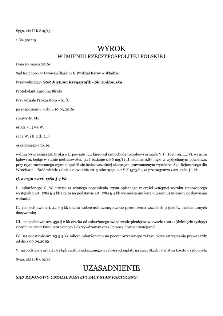 Sygn. akt II K 619/15 1 Ds. 361/15 WYROK W IMIENIU RZECZYPOSPOLITEJ POLSKIEJ Dnia 10 marca 2016r. Sąd Rejonowy w Lwówku Śląskim II Wydział Karny w składzie: Przewodniczący SSR Justyna Krzysztofik - Skrzydłowska Protokolant Karolina Birulo Przy udziale Prokuratora – K. Ś. po rozpoznaniu w dniu 10.03.2016r. sprawy G. W. urodz. (...) we W. syna W. i B. z d. (...) oskarżonego o to, że: w dniu 09 września 2015 roku w L. powiatu (...) kierował samochodem osobowym marki V. (...) o nr rej. (...)VL w ruchu lądowym, będąc w stanie nietrzeźwości, tj.: I badanie 0,86 mg/l i II badanie 0,85 mg/l w wydychanym powietrzu, przy czym zarzucanego czynu dopuścił się będąc wcześniej skazanym prawomocnym wyrokiem Sąd Rejonowego dla Wrocławia – Śródmieście z dnia 22 kwietnia 2015 roku sygn. akt V K 1523/14 za przestępstwo z art. 178a § 1 kk tj. o czyn z art. 178a § 4 kk I. oskarżonego G. W. uznaje za winnego popełnienia czynu opisanego w części wstępnej wyroku stanowiącego występek z art. 178a § 4 kk i za to na podstawie art. 178a § 4 kk wymierza mu karę 6 (sześciu) miesięcy pozbawienia wolności; II. na podstawie art. 42 § 3 kk orzeka wobec oskarżonego zakaz prowadzenia wszelkich pojazdów mechanicznych dożywotnio; III. na podstawie art. 43a § 2 kk orzeka od oskarżonego świadczenie pieniężne w kwocie 10000 (dziesięciu tysięcy) złotych na rzecz Funduszu Pomocy Pokrzywdzonym oraz Pomocy Postpenitencjarnej; IV. na podstawie art. 63 § 4 kk zalicza oskarżonemu na poczet orzeczonego zakazu okres zatrzymania prawa jazdy od dnia 09.09.2015r.; V. na podstawie art. 624 § 1 kpk zwalnia oskarżonego w całości od zapłaty na rzecz Skarbu Państwa kosztów sądowych. Sygn. akt II K 619/15 UZASADNIENIE SĄD REJONOWY USTALIŁ NASTĘPUJĄCY STAN FAKTYCZNY: G. W. w dniu 8 września 2015r. przebywał wraz ze swoją ówczesną dziewczyną M. Ż. u znajomego K. M. zamieszkującego w P.. Tam spożywał alkohol. W pewnym momencie pomiędzy G. W., a M. Ż. doszło do kłótni, wskutek której dziewczyna postanowiła powrócić do miejsca zamieszkania we W.. Wymienieni w późnych godzinach wieczornych opuścili teren posesji znajomego samochodem osobowym marki V. (...) o nr rej. (...)(...). Udali się do L.. ( dowód: wyjaśnienia oskarżonego G. W. – k. 60 verte-61, zeznania świadka M. Ż. – k. 54 verte-55, 63 verte-65, zeznania świadka K. M. – k. 52, 65-66 , zeznania świadka B. Ć. – k. 66 – 66 verte) W okolicach rynku miejskiego w L. przedmiotowy pojazd kierowany przez G. W. spostrzegli patrolujący miasto funkcjonariusze Policji: J. P. i J. G.. Odnosząc wrażenie, że kierowca pojazdu próbuje uciec przed spostrzeżonym patrolem policyjnym, funkcjonariusze udali się za samochodem. Używając sygnalizacji świetlnej zatrzymali auto do kontroli poza terenem rynku przy skrzyżowaniu ul. (...) z Al. (...). Przez ten czas nie tracili kontaktu wzrokowego z pojazdem. ( dowód: zeznania świadka J. P. –k. 62 verte- 63 verte, zeznania świadka J. G. – k. 58, 61 verte-62 verte ) Przestępując od kontroli policjanci zażądali od kierującego – G. W. okazania dokumentów pojazdu oraz poddali wymienionego badaniu na zawartość alkoholu w organizmie przy użyciu urządzenia kontrolno - pomiarowego A. I.. Pierwsze badanie z godz. 01:48 dnia 9 września 2015r. dało wynik 0,86 mg/dm3, a drugie z godz. 02:03- 0,85 mg/dm3 alkoholu w wydychanym powietrzu. G. W. nie żądał ponownego badania wydychanego powietrza, nie zgłosił uwag co do prawidłowości zabezpieczenia ustnika oraz nie zażądał badania krwi. Po ustaleniu wyniku badania informując policjantów, że „za to pójdzie do więzienia”, początkowo odmawiał złożenia podpisu, lecz następnie protokół podpisał. ( dowód: zeznania świadka J. P. –k. 62 verte- 63 verte, zeznania świadka J. G. – k. 58, 61 verte-62 verte, protokół użycia alcosensoara - k. 2-4 ) G. W. był uprzednio skazany za przestępstwo z art. 178a § 1 k.k. prawomocnym wyrokiem Sądu Rejonowego dla Wrocławia-Śródmieścia z dnia 22 kwietnia 2015r. sygn. akt V K 1523/14. Odzyskał prawo jazdy po upływie okresu orzeczonego w powołanej sprawie zakazu prowadzenia wszelkich pojazdów mechanicznych w ruchu lądowym, tj. po dniu 14 lipca 2015r. Za prowadzenie pojazdu w stanie nietrzeźwości skazany został także prawomocnym wyrokiem z dnia 20.02.2013r. sądu niemieckiego. Nadto na przestrzeni lat 1998 – 2002 karany był trzykrotnie za przestępstwa z art. 265 § 2 d.k.k., art. 186 § 1 d.k.k.i art. 48 ust. 3 d. ustawy o przeciwdziałaniu narkomanii. Zakład karny opuścił w lutym 2007r. ( dowód: odpis wyroku Sądu Rejonowego dla Wrocławia-Śródmieścia –k. 16, dane o karalności – k. 29-31 ) G. W. ma 40 lat. Z zawodu mechanik przetwórstwa tworzyw sztucznych, utrzymuje się z prac podejmowanych na terenie Niemiec zarabiając średnio miesięcznie ok. 4000 zł. Posiada dwoje dzieci na utrzymaniu, rozwodzi się. ( dowód: wyjaśnienia oskarżonego G. W. –k. 14 -15, 60 verte) G. W. nie przyznał się do popełnienia zarzucanego mu czynu. Nie kwestionując, że w dacie 9 września 2015r. w godzinach nocnych przebywał na terenie L. oraz faktu, że był nietrzeźwy, zaprzeczał, aby to on był kierowcą zatrzymanego do kontroli policyjnej pojazdu. Wskazał, że samochodem kierowała podróżująca z nim dziewczyna M. Ż., która nie posiada uprawnień do kierowania pojazdami. Dodał, że nie potrafi wskazać jak doszło do kontroli, bowiem został zaskoczony przez funkcjonariuszy Policji w trakcie kłótni z dziewczyną obok samochodu, gdy jeden z policjantów chwycił go za ramię. Nie potrafił wskazać dokładnie miejsca, w którym znajdowali się w trakcie kłótni, kiedy podeszła policja. Uznał, że został poddany badaniu na zawartość alkoholu w organizmie wobec agresywnej postawy w stosunku do dziewczyny. W ostatnim słowie wskazując, że byłby w stanie przyjąć karę z warunkowym zawieszeniem jej