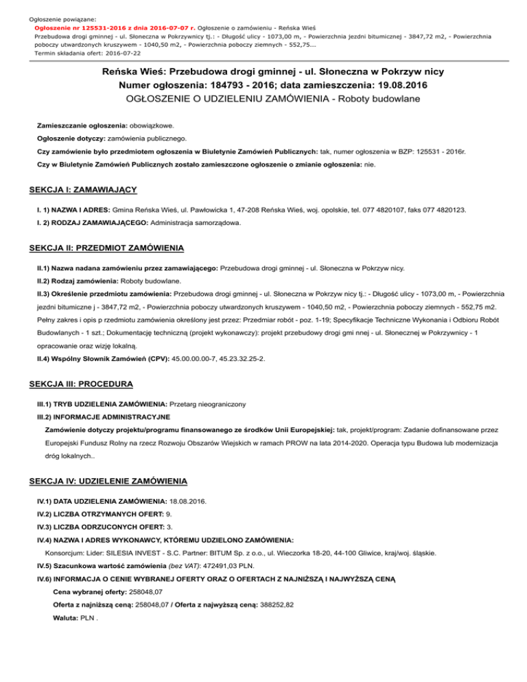 Ogłoszenie powiązane: Ogłoszenie nr 125531-2016 z dnia 2016-07-07 r. Ogłoszenie o zamówieniu - Reńska Wieś Przebudowa drogi gminnej - ul. Słoneczna w Pokrzywnicy tj.: - Długość ulicy - 1073,00 m, - Powierzchnia jezdni bitumicznej - 3847,72 m2, - Powierzchnia poboczy utwardzonych kruszywem - 1040,50 m2, - Powierzchnia poboczy ziemnych - 552,75... Termin składania ofert: 2016-07-22 Reńska Wieś: Przebudowa drogi gminnej - ul. Słoneczna w Pokrzyw nicy Numer ogłoszenia: 184793 - 2016; data zamieszczenia: 19.08.2016 OGŁOSZENIE O UDZIELENIU ZAMÓWIENIA - Roboty budowlane Zamieszczanie ogłoszenia: obowiązkowe. Ogłoszenie dotyczy: zamówienia publicznego. Czy zamówienie było przedmiotem ogłoszenia w Biuletynie Zamówień Publicznych: tak, numer ogłoszenia w BZP: 125531 - 2016r. Czy w Biuletynie Zamówień Publicznych zostało zamieszczone ogłoszenie o zmianie ogłoszenia: nie. SEKCJA I: ZAMAWIAJĄCY I. 1) NAZWA I ADRES: Gmina Reńska Wieś, ul. Pawłowicka 1, 47-208 Reńska Wieś, woj. opolskie, tel. 077 4820107, faks 077 4820123. I. 2) RODZAJ ZAMAWIAJĄCEGO: Administracja samorządowa. SEKCJA II: PRZEDMIOT ZAMÓWIENIA II.1) Nazwa nadana zamówieniu przez zamawiającego: Przebudowa drogi gminnej - ul. Słoneczna w Pokrzyw nicy. II.2) Rodzaj zamówienia: Roboty budowlane. II.3) Określenie przedmiotu zamówienia: Przebudowa drogi gminnej - ul. Słoneczna w Pokrzyw nicy tj.: - Długość ulicy - 1073,00 m, - Powierzchnia jezdni bitumiczne j - 3847,72 m2, - Powierzchnia poboczy utwardzonych kruszywem - 1040,50 m2, - Powierzchnia poboczy ziemnych - 552,75 m2. Pełny zakres i opis p rzedmiotu zamówienia określony jest przez: Przedmiar robót - poz. 1-19; Specyfikacje Techniczne Wykonania i Odbioru Robót Budowlanych - 1 szt.; Dokumentację techniczną (projekt wykonawczy): projekt przebudowy drogi gmi nnej - ul. Słonecznej w Pokrzywnicy - 1 opracowanie oraz wizję lokalną. II.4) Wspólny Słownik Zamówień (CPV): 45.00.00.00-7, 45.23.32.25-2. SEKCJA III: PROCEDURA III.1) TRYB UDZIELENIA ZAMÓWIENIA: Przetarg nieograniczony III.2) INFORMACJE ADMINISTRACYJNE Zamówienie dotyczy projektu/programu finansowanego ze środków Unii Europejskiej: tak, projekt/program: Zadanie dofinansowane przez Europejski Fundusz Rolny na rzecz Rozwoju Obszarów Wiejskich w ramach PROW na lata 2014-2020. Operacja typu Budowa lub modernizacja dróg lokalnych.. SEKCJA IV: UDZIELENIE ZAMÓWIENIA IV.1) DATA UDZIELENIA ZAMÓWIENIA: 18.08.2016. IV.2) LICZBA OTRZYMANYCH OFERT: 9. IV.3) LICZBA ODRZUCONYCH OFERT: 3. IV.4) NAZWA I ADRES WYKONAWCY, KTÓREMU UDZIELONO ZAMÓWIENIA: Konsorcjum: Lider: SILESIA INVEST - S.C. Partner: BITUM Sp. z o.o., ul. Wieczorka 18-20, 44-100 Gliwice, kraj/woj. śląskie. IV.5) Szacunkowa wartość zamówienia (bez VAT): 472491,03 PLN. IV.6) INFORMACJA O CENIE WYBRANEJ OFERTY ORAZ O OFERTACH Z NAJNIŻSZĄ I NAJWYŻSZĄ CENĄ Cena wybranej oferty: 258048,07 Oferta z najniższą ceną: 258048,07 / Oferta z najwyższą ceną: 388252,82 Waluta: PLN .