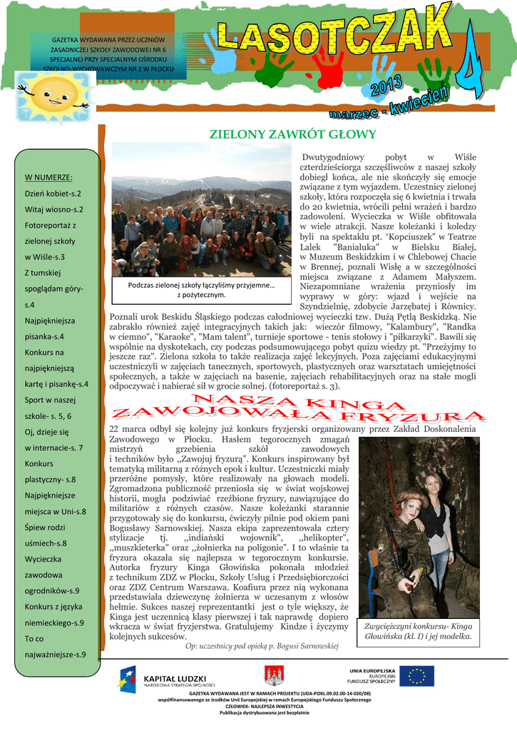 GAZETKA WYDAWANA PRZEZ UCZNIÓW ZASADNICZEJ SZKOŁY ZAWODOWEJ NR 6 SPECJALNEJ PRZY SPECJALNYM OŚRODKU SZKOLNO-WYCHOWAWCZYM NR 2 W PŁOCKU ZIELONY ZAWRÓT GŁOWY W NUMERZE: Dzieo kobiet-s.2 Witaj wiosno-s.2 Fotoreportaż z zielonej szkoły w Wiśle-s.3 Z tumskiej spoglądam górys.4 Najpiękniejsza pisanka-s.4 Konkurs na najpiękniejszą kartę i pisankę-s.4 Dwutygodniowy pobyt w Wiśle czterdzieściorga szczęśliwców z naszej szkoły dobiegł końca, ale nie skończyły się emocje związane z tym wyjazdem. Uczestnicy zielonej szkoły, która rozpoczęła się 6 kwietnia i trwała do 20 kwietnia, wrócili pełni wrażeń i bardzo zadowoleni. Wycieczka w Wiśle obfitowała w wiele atrakcji. Nasze koleżanki i koledzy byli na spektaklu pt. "Kopciuszek" w Teatrze Lalek "Banialuka" w Bielsku Białej, w Muzeum Beskidzkim i w Chlebowej Chacie w Brennej, poznali Wisłę a w szczególności miejsca związane z Adamem Małyszem. Podczas zielonej szkoły łączyliśmy przyjemne… Niezapomniane wrażenia przyniosły im z pożytecznym. wyprawy w góry: wjazd i wejście na Szyndzielnię, zdobycie Jarzębatej i Równicy. Poznali urok Beskidu Śląskiego podczas całodniowej wycieczki tzw. Dużą Pętlą Beskidzką. Nie zabrakło również zajęć integracyjnych takich jak: wieczór filmowy, "Kalambury", "Randka w ciemno", "Karaoke", "Mam talent", turnieje sportowe - tenis stołowy i "piłkarzyki". Bawili się wspólnie na dyskotekach, czy podczas podsumowującego pobyt quizu wiedzy pt. "Przeżyjmy to jeszcze raz". Zielona szkoła to także realizacja zajęć lekcyjnych. Poza zajęciami edukacyjnymi uczestniczyli w zajęciach tanecznych, sportowych, plastycznych oraz warsztatach umiejętności społecznych, a także w zajęciach na basenie, zajęciach rehabilitacyjnych oraz na stałe mogli odpoczywać i nabierać sił w grocie solnej. (fotoreportaż s. 3). Sport w naszej szkole- s. 5, 6 Oj, dzieje się w internacie-s. 7 Konkurs plastyczny- s.8 Najpiękniejsze miejsca w Uni-s.8 Śpiew rodzi uśmiech-s.8 Wycieczka zawodowa ogrodników-s.9 Konkurs z języka niemieckiego-s.9 To co najważniejsze-s.9 22 marca odbył się kolejny już konkurs fryzjerski organizowany przez Zakład Doskonalenia Zawodowego w Płocku. Hasłem tegorocznych zmagań mistrzyń grzebienia szkół zawodowych i techników było ,,Zawojuj fryzurą”. Konkurs inspirowany był tematyką militarną z różnych epok i kultur. Uczestniczki miały przeróżne pomysły, które realizowały na głowach modeli. Zgromadzona publiczność przeniosła się w świat wojskowej historii, mogła podziwiać rzeźbione fryzury, nawiązujące do militariów z różnych czasów. Nasze koleżanki starannie przygotowały się do konkursu, ćwiczyły pilnie pod okiem pani Bogusławy Sarnowskiej. Nasza ekipa zaprezentowała cztery stylizacje tj. ,,indiański wojownik", ,,helikopter", ,,muszkieterka" oraz ,,żołnierka na poligonie”. I to właśnie ta fryzura okazała się najlepsza w tegorocznym konkursie. Autorka fryzury Kinga Głowińska pokonała młodzież z technikum ZDZ w Płocku, Szkoły Usług i Przedsiębiorczości oraz ZDZ Centrum Warszawa. Koafiura przez nią wykonana przedstawiała dziewczynę żołnierza w uczesanym z włosów hełmie. Sukces naszej reprezentantki jest o tyle większy, że Kinga jest uczennicą klasy pierwszej i tak naprawdę dopiero Zwyciężczyni konkursu- Kinga wkracza w świat fryzjerstwa. Gratulujemy Kindze i życzymy Głowińska (kl. I) i jej modelka. kolejnych sukcesów. Op: uczestnicy pod opieką p. Bogusi Sarnowskiej GAZETKA WYDAWANA JEST W RAMACH PROJEKTU (UDA-POKL.09.02.00-14-020/08) współfinansowanego ze środków Unii Europejskiej w ramach Europejskiego Funduszu Społecznego CZŁOWIEK- NAJLEPSZA INWESTYCJA Publikacja dystrybuowana jest bezpłatnie