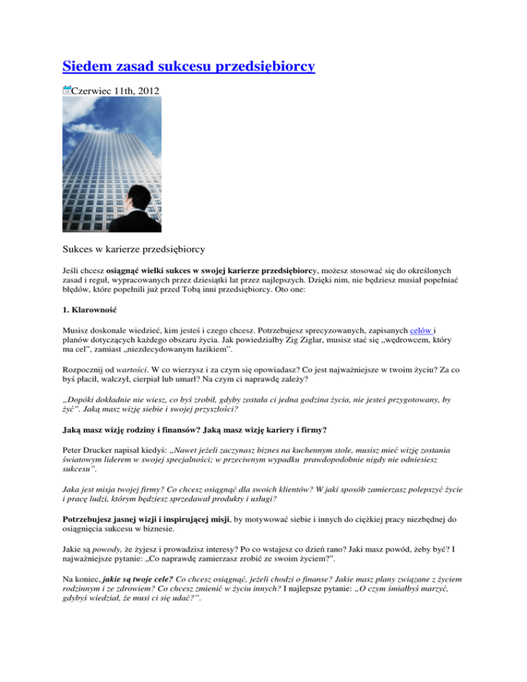 Siedem zasad sukcesu przedsiębiorcy Czerwiec 11th, 2012 Sukces w karierze przedsiębiorcy Jeśli chcesz osiągnąć wielki sukces w swojej karierze przedsiębiorcy, możesz stosować się do określonych zasad i reguł, wypracowanych przez dziesiątki lat przez najlepszych. Dzięki nim, nie będziesz musiał popełniać błędów, które popełnili już przed Tobą inni przedsiębiorcy. Oto one: 1. Klarowność Musisz doskonale wiedzieć, kim jesteś i czego chcesz. Potrzebujesz sprecyzowanych, zapisanych celów i planów dotyczących każdego obszaru życia. Jak powiedziałby Zig Ziglar, musisz stać się „wędrowcem, który ma cel”, zamiast „niezdecydowanym łazikiem”. Rozpocznij od wartości. W co wierzysz i za czym się opowiadasz? Co jest najważniejsze w twoim życiu? Za co byś płacił, walczył, cierpiał lub umarł? Na czym ci naprawdę zależy? „Dopóki dokładnie nie wiesz, co byś zrobił, gdyby została ci jedna godzina życia, nie jesteś przygotowany, by żyć”. Jaką masz wizję siebie i swojej przyszłości? Jaką masz wizję rodziny i finansów? Jaką masz wizję kariery i firmy? Peter Drucker napisał kiedyś: „Nawet jeżeli zaczynasz biznes na kuchennym stole, musisz mieć wizję zostania światowym liderem w swojej specjalności; w przeciwnym wypadku prawdopodobnie nigdy nie odniesiesz sukcesu”. Jaka jest misja twojej firmy? Co chcesz osiągnąć dla swoich klientów? W jaki sposób zamierzasz polepszyć życie i pracę ludzi, którym będziesz sprzedawał produkty i usługi? Potrzebujesz jasnej wizji i inspirującej misji, by motywować siebie i innych do ciężkiej pracy niezbędnej do osiągnięcia sukcesu w biznesie. Jakie są powody, że żyjesz i prowadzisz interesy? Po co wstajesz co dzień rano? Jaki masz powód, żeby być? I najważniejsze pytanie: „Co naprawdę zamierzasz zrobić ze swoim życiem?”. Na koniec, jakie są twoje cele? Co chcesz osiągnąć, jeżeli chodzi o finanse? Jakie masz plany związane z życiem rodzinnym i ze zdrowiem? Co chcesz zmienić w życiu innych? I najlepsze pytanie: „O czym śmiałbyś marzyć, gdybyś wiedział, że musi ci się udać?”. Im bardziej klarownie będziesz umiał odpowiedzieć sobie na pytania dotyczące tych kwestii – twoich wartości, wizji, misji, powodów i celów – tym większe będzie prawdopodobieństwo, że osiągniesz w życiu coś wspaniałego. 2. Kompetencje By osiągnąć sukces i zadowolenie, musisz być naprawdę bardzo dobry w tym, co robisz. Powinieneś być zdeterminowany, by znaleźć się wśród 10% najlepszych w swojej branży. Twoim podstawowym celem powinno być doskonałe wykonywanie zadań zawodowych, dlatego całą energię skieruj na jakość pracy oraz jakość oferowanych produktów i usług. Według Jima Collinsa, autora Od dobrego do wielkiego, by osiągnąć sukces w biznesie, musisz znaleźć obszar, który spełnia trzy warunki. Po pierwsze, musi to być coś, co jest twoją pasją, coś, co cię interesuje i co lubisz robić. Po drugie, musisz być w tym lepszy niż pozostałe 90% ludzi zajmujących się tym samym. Po trzecie, muszą to być produkty lub usługi, które przynoszą zysk i pozwalają osiągnąć cele finansowe. Według Harvard Business School najcenniejszym majątkiem firmy jest jej reputacja. Definiowana jest ona jako „to, jak widzą nas klienci”. Zdobywamy ją przede wszystkim dzięki jakości produktów i usług oraz dzięki jakości ludzi, którzy je wytwarzają i oferują oraz kontaktują się z naszymi klientami. Wszystko zależy od kompetencji i charakteru. 3. Ograniczenia Między tobą a celem zawsze znajdują się jakieś przeszkody lub czynniki ograniczające. Niezwykle istotna jest zatem twoja zdolność do identyfikowania czynników w największym stopniu wpływających na szybkość realizacji celów biznesowych. Zasada 80/20 odnosi się także do czynników ograniczających rozwój zawodowy. Ponad 80% powodów odpowiedzialnych za to, że nie osiągasz celu tak szybko, jak byś chciał, znajduje się w tobie. Jedynie 20% powodów to okoliczności zewnętrzne lub inni ludzie. Jakie są twoje ograniczenia? Co cię powstrzymuje? Co wpływa na szybkość realizacji celów? Co możesz natychmiast zrobić, by zacząć zmniejszać wpływ najważniejszego ograniczenia? Jest to często klucz do szybkiego postępu. 4. Kreatywność Istotą sukcesu w biznesie jest innowacja. Oznacza ona umiejętność znajdowania szybszych, lepszych i łatwiejszych sposobów produkowania i dostarczania wyrobów oraz świadczenia usług. Na szczęście prawie każdy jest potencjalnym geniuszem. Masz większą inteligencję i większe zdolności, niż mógłbyś wykorzystać, żyjąc nawet sto lat. Twoim zadaniem jest uwolnienie kreatywności i skoncentrowanie jej jak promienia lasera, na usuwaniu przeszkód, rozwiązywaniu problemów i osiąganiu swoich celów. Istota kreatywności kryje się w umiejętności radzenia sobie z nieuchronnymi problemami i trudnościami pojawiającymi się w trakcie prowadzenia firmy. „Przywództwo jest umiejętnością rozwiązywania problemów”, twierdzi Colin Powell. Sukces to zdolność rozwiązywania problemów. Pamiętaj: nie osiągnięty cel jest jedynie nie rozwiązanym problemem. Sposobem na osiągnięcie sukcesu jest koncentrowanie się na rozwiązaniu, a nie na problemie. Poświęcenie uwagi temu, co ma być zrobione a nie temu, co się stało i kogo należy za to winić. Skoncentruj całą uwagę na przezwyciężaniu wszystkiego, co nie pozwala ci osiągnąć takiego poziomu sprzedaży i zyskowności, jaki jest niezbędny, by zbudować efektywną firmę. Im więcej będziesz myślał o rozwiązaniach, tym więcej ich znajdziesz. Poczujesz się mądrzejszy i silniejszy, koncentrując całą energię na przyszłości, na tym, co trzeba zrobić, by poprawić sytuację. 5. Koncentracja Niezwykle ważna dla osiągnięcia sukcesu jest umiejętność koncentrowania się na jednym, najważniejszym działaniu