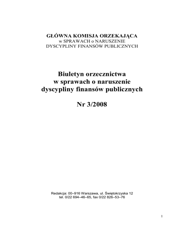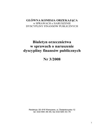 GŁÓWNA KOMISJA ORZEKAJĄCA w SPRAWACH o NARUSZENIE DYSCYPLINY FINANSÓW PUBLICZNYCH Biuletyn orzecznictwa w sprawach o naruszenie dyscypliny finansów publicznych Nr 3/2008 Redakcja: 00–916 Warszawa, ul. Świętokrzyska 12 tel. 0/22 694–46–65, fax 0/22 826–53–76 1 Redakcja i kolportaŜ: Zespół – Biuro Dyscypliny Finansów Publicznych MINISTERSTWA FINANSÓW „Biuletyn” dostępny jest takŜe w formie elektronicznej na stronie internetowej Ministerstwa Finansów: http://www.mf.gov.pl Druk: Drukarnia Nr 1, Przedsiębiorstwo Państwowe 02–521 Warszawa, ul. Rakowiecka 37 2 SPIS TREŚCI Orzeczenia Komisji Orzekających Pierwszej Instancji 1. Orzeczenie Resortowej Komisji Orzekającej w Sprawach o Naruszenie Dyscypliny Finansów Publicznych przy Ministrze S. z dnia 27 września 2007 r. Ds. 47/2007........................ 5 2. Orzeczenie Regionalnej Komisji Orzekającej w Sprawach o Naruszenie Dyscypliny Finansów Publicznych przy RIO z dnia 23 października 2007 r., NDB-5000/23/2007 ............... 9 3. Orzeczenie Regionalnej Komisji Orzekającej w Sprawach o Naruszenie Dyscypliny Finansów Publicznych przy RIO z dnia 7 grudnia 2007 r., NDB/22/2007 ................................................... 12 4. Orzeczenie Regionalnej Komisji Orzekającej w Sprawach o Naruszenie Dyscypliny Finansów Publicznych przy RIO z dnia 14 stycznia 2008 r., 0965-DB/141/07 ............................................ 18 5. Orzeczenie Regionalnej Komisji Orzekającej w Sprawach o Naruszenie Dyscypliny Finansów Publicznych przy RIO z dnia 26 lutego 2008 r., DFP-RKO.530-1/9/08 ..................................... 27 6. Orzeczenie Regionalnej Komisji Orzekającej w Sprawach o Naruszenie Dyscypliny Finansów Publicznych przy RIO z dnia 28 lutego 2008 r., DFP-53-18/2007 .............................................. 33 Orzeczenia Głównej Komisji Orzekającej 7. Orzeczenie GKO z dnia 19 listopada 2007 r., DF/GKO-4900-57/61/RN-20/07/2356 ...................................................... 37 8. Orzeczenie GKO z dnia 14 stycznia 2008 r., DF/GKO-4900-83/91/07/3594 .................................................................. 40 9. Orzeczenie GKO z dnia 28 stycznia 2008 r., DF/GKO-4900/25/23/08/1085 .................................................................. 45 10. Orzeczenie GKO z dnia 28 stycznia 2008 r., DF/GKO-4900-74/81/07/3382 ................................................................. 52 11. Orzeczenie GKO z dnia 3 marca 2008 r., DF/GKO-4900-76/83/RN-29/07/3418 ...................................................... 56 3 12. Orzeczenie GKO z dnia 17 marca 2008 r., DF/GKO/4900-92/105/RN-41/07/4078 ................................................... 62 13. Orzeczenie GKO z dnia 27 marca 2008 r., DF/GKO-4900-2/2/08/103 ....................................................................... 66 14. Orzeczenie GKO z dnia 27 marca 2008 r., DF/GKO-4900-71/77RN-25/07/3130 ...................................................... 70 15. Orzeczenie GKO z dnia 14 kwietnia 2008 r., DF/GKO-4900/7/7/08/338 ......................................................................... 73 16. Orzeczenie GKO z dnia 21 kwietnia 2008 r., DF/GKO-4900-6/6/08/339................................................................... 78 17. Orzeczenie GKO z dnia 29 maja 2008 r., DF/GKO-4900-24/22/08/1047................................................................... 84 Indeks haseł ......................................................................................................... 91 4 1. ORZECZENIE Resortowej Komisji Orzekającej z dnia 27 września 2007 r. Ds. 47/2007 Resortowa Komisja Orzekająca w sprawach o naruszenie dyscypliny finansów publicznych przy Ministrze S. w składzie: Przewodniczący: Członkowie: Mariusz Kramarczuk GraŜyna Piwowarska Iwona Podolska Protokolant: Edyta Krzewska z udziałem Rzecznika Dyscypliny Finansów Publicznych: Jacka Zielińskiego, po rozpatrzeniu na rozprawie w dniu 01.08.2007 r. oraz w dniu 27.09.2007 r. wniosku Rzecznika Ds./Rz 45/07 z dnia 14.06.2007 r. przeciwko Grzegorzowi D.– byłemu Dyrektorowi Gospodarstwa Pomocniczego przy Zakładzie Karnym w B. obwinionemu o to, Ŝe: w dniu 30 października 2006 r. pełniąc funkcję Dyrektora Gospodarstwa Pomocniczego przy Zakładzie Karnym w B. umyślnie naruszył dyscyplinę finansów publicznych w ten sposób, Ŝe z pominięciem procedur w zakresie zamówień publicznych, dokonał zakupu sprzętu komputerowego od firmy C. Serwis spółka z o.o. w B. dla Centralnego Zarządu SłuŜby Więziennej na łączną kwotę 1.546.246,30 zł, co było niezgodne z art. 4 pkt 8 obowiązującej od 2 marca 2004 r. ustawy z dnia 29 stycznia 2004 r. Prawo zamówień publicznych (Dz. U. Nr 19 poz. 177 ze zm.), tj. o czyn z art. 17 ust. 1 pkt 1 ustawy z dnia 17 grudnia 2004 r. o odpowiedzialności za naruszenie dyscypliny finansów publicznych ( Dz. U. z 2005 r., Nr 14, poz. 114 ze zm.) orzeka: 1) uznaje Grzegorza D. za winnego umyślnego naruszenia dyscypliny finansów publicznych w ten sposób, Ŝe w dniu 30 października 2006 r. pełniąc funkcję Dyrektora Gospodarstwa Pomocniczego przy Zakładzie Karnym w B. z pominięciem procedur w zakresie zamówień publicznych, dokonał zakupu sprzętu komputerowego od firmy C. Serwis spółka z o.o. w B. dla Centralnego Zarządu SłuŜby Więziennej na łączną kwotę 1.546.246,30 zł, co było niezgodne z art. 4 pkt 8 obowiązującej od 2 marca 2004 r. ustawy z dnia 29 stycznia 2004 r. Prawo zamówień publicznych (Dz. U. Nr 19 poz. 177 ze zm.), tj. za winnego popełnienia czynu wyczerpującego znamiona art. 17 ust. 1 pkt 1 ustawy z dnia 17 grudnia 2004 r. o odpowiedzialności za naruszenie dyscypliny finansów publicznych ( Dz. U. z 2005 r., Nr 14, poz. 114 ze zm.) i za to na podstawie ww. przepisów oraz art. 31 ust. 1 pkt 2 ustawy z dnia 17 grudnia 2004 r. o odpowiedzialności za naruszenie dyscypliny finansów publicznych (Dz. U. z 2005 r. Nr 14, poz. 114, ze zm.) wymierza kar
