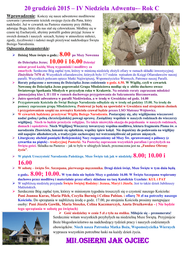20 grudzień 2015 – IV Niedziela Adwentu-– Rok C Wprowadzenie: Kończy się nasze adwentowe modlitewne czuwanie i prostowanie ścieżek swojego życia dla Pana, który nadchodzi. Już w czwartek na Pasterce staniemy przy żłóbku, adorując Boga, który dla nas stał się człowiekiem. Módlmy się w czasie tej Eucharystii, abyśmy potrafili godnie przyjąć Jezusa w swoich domach i naszych sercach, byśmy w atmosferze miłości, zgody, życzliwości i radości mogli przeżywać nadchodzące Święta Bożego Narodzenia. Ogłoszenia duszpasterskie: 8.00 po Mszy Nowenna do Dzieciątka Jezus; 10.00 i 16.00 Dziesięć Dzisiaj Msze święte o godz.: minut przed każdą Mszą wypominki i modlitwy za zmarłych. Serdeczne Bóg zapłać tym, którzy w minioną niedzielę złożyli ofiary w ramach składki inwestycyjnej. Złożyliście 7470 zł. Wszystkich ofiarodawców, których było 117 rodzin wpisałem do Księgi Ofiarodawców naszej parafii. Wszystkich polecam opiece Matki Najświętszej, Wspomożycielce Wiernych, Patronce naszej Parafii. Roraty połączone z nowenną do Dzieciątka Jezus codziennie o godz. 6.50. W Wigilię, czyli w czwartek Nowennę do Dzieciątka Jezus poprowadzi Grupa Młodzieżowa modląc się o obfite duchowe owoce Światowego Spotkania Młodych w przyszłym roku w Krakowie. Na ostatnie roraty zapraszam młodzież gimnazjalną klas I, II i III w ramach duchowego przygotowania do Sakramentu Bierzmowania. Jutro spowiedź adwentowa w parafii Niedźwiedza, a w środę w Gwoździec od godz. 14.00 Przygotowanie Kościoła do Świąt Bożego Narodzenia odbędzie się w środę od godziny 15.00. Na środę do pomocy zapraszam grupę Młodzieżową. Ponieważ ja będę na spowiedzi w Gwoźdzcu nad strojeniem choinek i przygotowaniem szopki na zewnątrz Kościoła czuwał będzie prezes LSO Mateusz Wójtowicz. W czwartek będziemy przeżywać Wigilię Bożego Narodzenia. Postarajmy się, aby wigilijnemu wieczorowi nadać godną i pełną chrześcijańskiej powagi oprawę. Zasiądźmy wspólnie w naszych rodzinach do wieczerzy wigilijnej. Niech to będzie przeżycie religijne. To także niezwykła okazja do pojednania w naszych rodzinach, domach i sąsiedztwie. Niech Wigilijnej Wieczerzy towarzyszy wspólna modlitwa, lektura fragmentu Pisma św. o narodzeniu Zbawiciela, łamanie się opłatkiem, wspólny śpiew kolęd. Nie dopuśćmy do podawania na wigilijny stół napojów alkoholowych, a tradycyjnie zachowajmy też wstrzemięźliwość od potraw mięsnych. Liturgiczny obchód pamiątki Betlejemskiej Nocy rozpoczniemy od Mszy Św. sprawowanej o północy (z czwartku na piątek) - tradycyjnej Pasterki. Na Pasterkę zapraszam wszystkich parafian i przybyłych na Święta gości. Składka na Pasterce – jak to było w ubiegłych latach, przeznaczona jest na „Fundusz Obrony życia”. W piątek Uroczystość Narodzenia Pańskiego, Msze Święte tak jak w niedzielę: 8.00; 10.00 i 16.00 W sobotę – święto Św. Szczepana, pierwszego męczennika. Drugi dzień świąt, Msze Święte w tym dniu będą . 8.00; 10.00. o godz W tym dniu nie będzie Mszy o godzinie 16.00. W Święto Szczepana wspieramy duchowo przez modlitwę i materialnie przez ofiary składane na tacę Katolickie Uczelnie: KUL i PAT W najbliższą niedzielę przypada Święto Świętej Rodziny: Jezusa, Maryi i Józefa. Jest to także dzień Jubileuszy Małżeńskich. Serdecznie Bóg zapłać tym, którzy w minionym tygodniu troszczyli się o czystość naszego Kościoła: Pani Joanna Kuras, Maria Pilch, Cecylia Burnóg i Celina Pabian. i ofiarę 70 zł na potrzeby naszego Kościoła. Do sprzątania w najbliższą środę o godz. 17.00, po strojeniu Kościoła prosimy następujące osoby: Pani Józefa Gawlik, Maria Stoszko, Celina Kaczmarczyk, Aneta Drużkowska - ( Nie będzie tego sprzątania w sobotę po świętach) Gość niedzielny w cenie 5 zł z tyłu na stoliku. Miłujcie się – prenumerata! Serdecznie witam wszystkich przybyłych na niedzielną Msze Świętą. Przyjmijcie Boże błogosławieństwo na nadchodzący tydzień pracy i naszych codziennych obowiązków. Niech nasza Patronka Matka Boża, Wspomożycielka Wiernych wyprasza wszystkim potrzebne łaski na każdy dzień życia. MIŁOSIERNI JAK OJCIEC