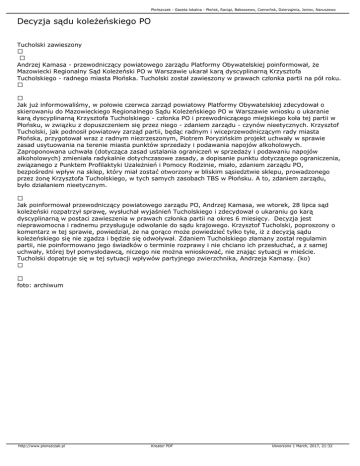 Płońszczak - Gazeta lokalna - Płońsk, Raciąż, Baboszewo, Czerwińsk, Dzierzążnia, Joniec, Naruszewo Decyzja sądu koleżeńskiego PO Tucholski zawieszony Andrzej Kamasa - przewodniczący powiatowego zarządu Platformy Obywatelskiej poinformował, że Mazowiecki Regionalny Sąd Koleżeński PO w Warszawie ukarał karą dyscyplinarną Krzysztofa Tucholskiego - radnego miasta Płońska. Tucholski został zawieszony w prawach członka partii na pół roku. Jak już informowaliśmy, w połowie czerwca zarząd powiatowy Platformy Obywatelskiej zdecydował o skierowaniu do Mazowieckiego Regionalnego Sądu Koleżeńskiego PO w Warszawie wniosku o ukaranie karą dyscyplinarną Krzysztofa Tucholskiego - członka PO i przewodniczącego miejskiego koła tej partii w Płońsku, w związku z dopuszczeniem się przez niego - zdaniem zarządu - czynów nieetycznych. Krzysztof Tucholski, jak podnosił powiatowy zarząd partii, będąc radnym i wiceprzewodniczącym rady miasta Płońska, przygotował wraz z radnym niezrzeszonym, Piotrem Poryzińskim projekt uchwały w sprawie zasad usytuowania na terenie miasta punktów sprzedaży i podawania napojów alkoholowych. Zaproponowana uchwała (dotycząca zasad ustalania ograniczeń w sprzedaży i podawaniu napojów alkoholowych) zmieniała radykalnie dotychczasowe zasady, a dopisanie punktu dotyczącego ograniczenia, związanego z Punktem Profilaktyki Uzależnień i Pomocy Rodzinie, miało, zdaniem zarządu PO, bezpośredni wpływ na sklep, który miał zostać otworzony w bliskim sąsiedztwie sklepu, prowadzonego przez żonę Krzysztofa Tucholskiego, w tych samych zasobach TBS w Płońsku. A to, zdaniem zarządu, było działaniem nieetycznym. Jak poinformował przewodniczący powiatowego zarządu PO, Andrzej Kamasa, we wtorek, 28 lipca sąd koleżeński rozpatrzył sprawę, wysłuchał wyjaśnień Tucholskiego i zdecydował o ukaraniu go karą dyscyplinarną w postaci zawieszenia w prawach członka partii na okres 6 miesięcy. Decyzja jest nieprawomocna i radnemu przysługuje odwołanie do sądu krajowego. Krzysztof Tucholski, poproszony o komentarz w tej sprawie, powiedział, że na gorąco może powiedzieć tylko tyle, iż z decyzją sądu koleżeńskiego się nie zgadza i będzie się odwoływał. Zdaniem Tucholskiego złamany został regulamin partii, nie poinformowano jego świadków o terminie rozprawy i nie chciano ich przesłuchać, a z samej uchwały, której był pomysłodawcą, niczego nie można wnioskować, nie znając sytuacji w mieście. Tucholski dopatruje się w tej sytuacji wpływów partyjnego zwierzchnika, Andrzeja Kamasy. (ko) foto: archiwum http://www.plonszczak.pl Kreator PDF Utworzono 1 March, 2017, 21:32