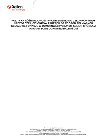 POLITYKA RÓŻNORODNOŚCI W ODNIESIENIU DO CZŁONKÓW RADY NADZORCZEJ, CZŁONKÓW ZARZĄDU ORAZ OSÓB PEŁNIĄCYCH KLUCZOWE FUNKCJE W DOMU INWESTYCYJNYM XELION SPÓŁKA Z OGRANICZONĄ ODPOWIEDZIALNOŚCIĄ Dom Inwestycyjny Xelion sp. z o.o. Ul. Puławska 107, 02-595 Warszawa, tel.: +48 22 565 44 00, fax: +48 22 565 44 01 infolinia: 0-801 370 370 lub +48 42 683 83 70, www.xelion.pl KRS 0000061809, Sąd Rejonowy dla m.st. Warszawy w Warszawie XIII Wydział Gospodarczy KRS kapitał zakładowy 60 050 000 zł, NIP 725-14-09-492 Spółka należy do Grupy Bankowej UniCredit, wpisanej do rejestru Grup Bankowych prowadzonych przez Bank Włoch. § 1. Niniejsza Polityka określa strategię w zakresie zarządzania różnorodnością, w tym zróżnicowania w odniesieniu do wyboru, członków Rady Nadzorczej, członków Zarządu oraz osób pełniących Kluczowe Funkcje w Domu Inwestycyjnym Xelion sp. z o.o. § 2. Przez użyte w niniejszej Polityce określenia należy rozumieć: 1) Spółka – Dom Inwestycyjny Xelion sp. z o.o., 2) Kluczowa Funkcja w Spółce – stanowisko Pracownika Xelion, który z racji jego zajmowania ma istotny wpływ na profil ryzyka Xelion, zidentyfikowane na podstawie Polityki Wynagradzania w Domu Inwestycyjnym Xelion sp. z o.o. - z wyłączeniem członków Zarządu Xelion, 3) Polityka – niniejsza Polityka, 4) Polityka Doboru - Polityka Doboru Kandydatów do pełnienia funkcji członka Zarządu, Kluczowej Funkcji w Domu Inwestycyjnym Xelion sp. z o.o., 5) Polityka Oceny Odpowiedniości – Polityka dotycząca oceny odpowiedniości proponowanych i mianowanych członków Zarządu, Rady Nadzorczej oraz osób pełniących Kluczowe Funkcje w Domu Inwestycyjnym Xelion sp. z o.o., 6) Polityka Równości Płci - Globalna Polityka dotycząca równości płci, wydana przez UniCredit, S.p.A. z siedzibą w Mediolanie 7) Procedura Planów Sukcesji – procedura uregulowana w Polityce w zakresie wyboru, uzupełniania i monitorowania potrzeb kadrowych oraz planowania zaplecza kadrowego w Domu Inwestycyjnym Xelion sp. z o.o., której celem jest zdefiniowanie standardów przygotowania i aktualizowania planów sukcesji w Spółce, które mają za zadanie zapewnienie ciągłości zatrudnienia osób, w szczególności zajmujących Kluczowe Funkcje w Spółce, 8) Rada Nadzorcza – Rada Nadzorcza Spółki, 9) Różnorodność – różnice pomiędzy osobami wynikające z np. płci, kierunku wykształcenia, wieku, doświadczenia zawodowego i innych cech. 10) Zarząd – Zarząd Spółki, § 3. Spółka traktuje Różnorodność jako jeden z atrybutów kultury organizacyjnej, pozwalający na realizację celów strategicznych w zmieniającym się otoczeniu rynkowym i zróżnicowanych preferencjach klientów. § 4. Realizując strategię Różnorodności Spółka wzmacnia innowacyjność i wszechstronność, wynikającą ze zrównoważonych oraz zobiektywizowanych poglądów kształtujących organizację. Dom Inwestycyjny Xelion sp. z o.o. Ul. Puławska 107, 02-595 Warszawa, tel.: +48 22 565 44 00, fax: +48 22 565 44 01 infolinia: 0-801 370 370 lub +48 42 683 83 70, www.xelion.pl KRS 0000061809, Sąd Rejonowy dla m.st. Warszawy w Warszawie XIII Wydział Gospodarczy KRS kapitał zakładowy 60 050 000 zł, NIP 725-14-09-492 Spółka należy do Grupy Bankowej UniCredit, wpisanej do rejestru Grup Bankowych prowadzonych przez Bank Włoch. § 5. Celem strategii Różnorodności Spółki jest zapewnienie wysokiej jakości realizacji zadań przez jego organy, poprzez wybór kompetentnych osób do pełnienia funkcji w Radzie Nadzorczej, Zarządzie oraz Kluczowych Funkcji w Spółce, stosując w pierwszej kolejności obiektywne kryteria merytoryczne i uwzględniając korzyści wynikające z różnorodności. § 6. W zakresie kryteriów merytorycznych strategia Różnorodności Spółki zapewnia wybór osób posiadających zróżnicowaną wiedzę, umiejętności i doświadczenie, adekwatne do pełnionych przez nie funkcji i powierzonych im obowiązków, które dopełniają się na poziomie całego składu Zarządu i Rady Nadzorczej. § 7. Strategia Różnorodności Spółki obejmuje i wykorzystuje do osiągnięcia najlepszych rezultatów różnice, które oprócz wiedzy, umiejętności i doświadczenia zawodowego, wynikają z kierunku wykształcenia, pochodzenia geograficznego i narodowości, płci oraz wieku. § 8. Strategia Różnorodności w odniesieniu do wyboru członków Rady Nadzorczej/ członków Zarządu/ osób pełniących Kluczową Funkcję w Spółce jest realizowana w następujących procesach: 1) Doboru, zgodnie z postanowieniami Polityki Doboru, 2) Oceny odpowiedniości, zgodnie z postanowieniami Polityki Oceny Odpowiedniości, 3) Sukcesji, zgodnie z Procedurą Planów Sukcesji. § 9. Dobór kandydatów na członków Zarządu oraz osób pełniących Kluczowe Funkcje w Spółce prowadzony jest w oparciu o jednolite standardy pozyskiwania i oceny Kandydatów. § 10. 1. Ocena odpowiedniości obejmuje wymogi w zakresie: 1) kwalifikacji zawodowych, w tym: wiedzy, doświadczenia oraz umiejętności niezbędnych do wykonywania powierzonej funkcji odpowiednio członka Rady Nadzorczej / członka Zarządu/ Kluczowej Funkcji w Spółce. 2) reputacji na podstawie informacji o postępowaniach karnych i administracyjnych, o postępowaniu w kontaktach gospodarczych obecnie i w przeszłości, o sytuacjach związanych z przeszłą i obecną działalnością biznesową oraz kondycją finansową, o skutkach drobniejszych incydentów, a także o prowadzeniu działalności poza Spółką, która mogłaby wpłynąć negatywnie na reputację; 3) dodatkowych kryteriów dotyczących zarządzania, w szczególności: a) potencjalne Konflikty Interesów, m.in. wynikające z prowadzenia Działalności Poza Domem Maklerskim; b) prowadzenie Działalności Konkurencyjnej; c) zdolność przeznaczania wystarczającej ilości czasu na pełnienie funkcji odpowiednio członka Rady Nadzorczej/członka Zarządu/pełnienie Kluczowej F