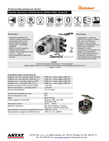 Przetworniki pomiarowe obrotu Enkoder absolutny wieloobrotowy SENDIX 5868, EtherCAT SafetyLockTM Wysokoobrotowe Temp. pracy Wysokie IP Odporny na uderzenia Odporny na wibracje Odporny na pole magn. Zabezp. zwarciowe Przekładnia Zabezp. polaryzacji mechaniczna Niezawodny: Uniwersalny: - zwiększona odporność na wibracje dzięki zastosowaniu technologii Safety-Lock™ - wysoki stopień integracji elementów – technologia OptoASIC - solidna szczelna obudowa – stopień ochrony IP67 - szeroki zakres temperatur pracy (-40 °C ... +80 °C) - łatwa diagnostyka (diody LED statusu) - wyposażony w najnowszy profil sieci do pracy w trybie CoE (Can over Ethernet) - parametry typu: pozycja, prędkość, przyspieszenie czy zakres pracy mogą być dostępne w czasie rzeczywistym w zależności od preferencji użytkownika - szybki, bezawaryjny rozruch urządzenia; parametry są wprowadzane przez magistralę - wiele możliwości montażu Szybki: - synchroniczna akwizycja danych z wielu urządzeń - szybki dostęp do danych z enkodera nawet podczas zwiększonego obciążenia sieci - złącza 3 x M12 Charakterystyki mechaniczne: Prędkość max. bez uszczelki (IP65) do 70°C: Prędkość max. bez uszczelki (IP65) do Tmax: Prędkość max. z uszczelką (IP67) do 70°C: Prędkość max. z uszczelką (IP67) do Tmax: Moment początkowy bez uszczelki (IP65): Moment początkowy z uszczelką (IP67): Moment bezwładności: 9 000 min-1, praca 7 000 min-1, praca 8 000 min-1, praca 6 000 min-1, praca < 0,01 Nm < 0,05 Nm 3,0 x 10-6 kgm2 ciągła ciągła ciągła ciągła 7 4 6 3 000 000 000 000 min-1 min-1 min-1 min-1 Promieniowa obciążalność wału: Osiowa obciążalność wału: Waga: Ochrona zgodnie z EN 60 529: 80 N 40 N Około 0,54 kg Obudowa: IP67, wał: IP65 opcjonalnie IP67 Temperatura pracy: -40 °C ... +80 °C Materiały wykonania: Wał: stal nierdzewna, kołnierz: aluminium, obudowa cynkowana Wytrzymałość na uderzenia wg DIN-IEC 68-2-27: >2500 m/s2, 6 ms Wytrzymałość na drgania wg DIN-IEC 68-2-6: >100 m/s2, 55...2000 Hz ASTAT Sp. z o.o., ul. Dąbrowskiego 441, 60-451 Poznań, tel. 061 848 88 71, fax. 061 848 82 76, www.astat.com.pl, [email protected] Przetworniki pomiarowe obrotu Enkoder absolutny wieloobrotowy SENDIX 5868, EtherCAT Charakterystyki elektryczne: Napięcie zasilania: 10...30 VDC Pobór prądu: 24 VDC: max. 90 mA Ochrona przed Tak zamianą biegunów: Zgodność z normami CE: EN 61000-6-1, EN 61000-6-4 oraz EN 61000-6-3 Ogólna charakterystyka urządzenia: Rozdzielczość skalowalna 1 ... 65536 (16 bitów), enkodera fabrycznie ustawiony na 8192 (13 bitów) Całkowita skalowalna 1 ... 228 rozdzielczość: Liczba obrotów: 1 ... 4096 (12 bitów) Kod: binarna ramka EtherNet Protokół: EtherNet / EtherCAT Dioda diagnostyczna LED (czerwona) Dioda sygnalizuje błąd układu optycznego (błąd czytania kodu z tarczy enkodera, uszkodzenie diody nadawczej lub odbiorczej), niski stan napięcie na wejściu enkodera i przekroczenie dopuszczalnej temperatury pracy Dioda pracy LED (zielona) Dioda sygnalizuje proces: Init-, Preop-, Safeop i Op-State 2 x dioda połączenia LED (żółta) Dioda sygnalizuje połączenie na porcie A i B. Ogólne informacje na temat CoE (CAN over EtherCAT) Enkodery serii 58X8 z obsługą EtherCAT wspierają możliwość komunikacji w sieci CAN wykorzystując profil DS 301. Ponadto dostępny jest także profil enkodera DS 406. Parametry takie jak wartości nastaw, punkty przełączania, przeskalowanie oraz inne są programowane bezpośrednio przez magistralę EtherCAT. Włączenie urządzenia powoduje załadowanie parametrów z pamięci EEPROM, która zabezpiecza je przed skutkami awarii zasilania. ASTAT Sp. z o.o., ul. Dąbrowskiego 441, 60-451 Poznań, tel. 061 848 88 71, fax. 061 848 82 76, www.astat.com.pl, [email protected] Przetworniki pomiarowe obrotu Enkoder absolutny wieloobrotowy SENDIX 5868, EtherCAT Kołnierz synchroniczny Ø58 mm, wersja ze skrzynką zaciskową, programowany za pomocą przełączników wewnątrz obudowy kołnierz typu 2 i 4 (rysunek dla wersji z przewodem) Kołnierz zaciskowy Ø58 mm, wersja ze złączem, programowany za pomocą przełączników wewnątrz obudowy kołnierz typu 1 i 3 (rysunek dla złącza 3 x M12) Kołnierz kwadratowy □63.5 mm, wersja ze skrzynką zaciskową, programowany za pomocą przełączników wewnątrz obudowy kołnierz typu 5 i 7 (rysunek dla wersji z przewodem) ASTAT Sp. z o.o., ul. Dąbrowskiego 441, 60-451 Poznań, tel. 061 848 88 71, fax. 061 848 82 76, www.astat.com.pl, [email protected] Przetworniki pomiarowe obrotu Enkoder absolutny wieloobrotowy SENDIX 5868, EtherCAT Układ połączeń: Dla układu wyjść nr 2 (kod-D) Kierunek: Port A Port B Sygnał: Transmisja danych + Odbiór danych + Transmisja danych - Odbiór danych - Transmisja danych + Odbiór danych + Transmisja danych - Odbiór danych - Skrót: TxD+ RxD+ TxD- RxD- TxD+ RxD+ TxD- RxD- 1 2 3 4 1 2 3 4 nie podłączany 0V nie podłączany + UB - 0 - 1 2 3 4 M12 Pin: Port A i B Układ połączeń zasilania: wtyczka M12 + UB Sygnał: zasilanie Skrót: M12 Pin: Kod zamówienia: 8.5868.XXXX.XX12 Typ Kołnierz 1 = kołnierz zaciskowy φ 58, IP65 2 = kołnierz synchro φ 58, IP65 3 = kołnierz zaciskowy φ 58, IP67 4 = kołnierz synchro φ 58, IP67 5 = kołnierz kwadr. 2.5'',63.5mm,IP65 7 = kołnierz kwadr. 2.5'',63.5mm,IP67 Profil sieci B1 = EtherCAT z CoE (CAN over EtherNet) Rodzaj przyłącza 2 = złącze 3 x M12, obudowa otwierana Wał (φ x L) 1 = wałek 6mm x 10mm1) 2 = wałek 10mm x 20mm2) 3 = wałek 1/4'' x 7/8'' 4 = wałek 3/8'' x 7x8'' Układ wyjścia i napięcie zasilania B = EtherCAT preferowane z kołnierzem typu 2 preferowane z kołnierzem typu 1 Preferowany przez producenta typy zostały wytłuszczone. Enkoder dostępny także w wersji Ex (strefa 2 i 22) 1) 2) ASTAT Sp. z o.o., ul. Dąbrowskiego 441, 60-451 Poznań, tel. 061 848 88 71, fax. 061 848 82 76, www.astat.com.pl, [email protected]