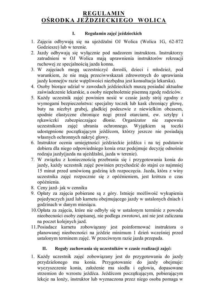 REGULAMIN OŚRODKA JEŹDZI ECKI EGO WOLI CA I. Regulamin zajęć jeździeckich 1. Zajęcia odbywają się na ujeżdżalni OJ Wolica (Wolica 1G, 62-872 Godziesze) lub w terenie. 2. Jazdy odbywają się wyłącznie pod nadzorem instruktora. Instruktorzy zatrudnieni w OJ Wolica mają uprawnienia instruktorów rekreacji ruchowej ze specjalnością jazda konna. 3. W zajęciach mogą uczestniczyć dorośli, dzieci i młodzież, pod warunkiem, że nie mają przeciwwskazań zdrowotnych do uprawiania jazdy konnej(w razie wątpliwości niezbędna jest konsultacja lekarska). 4. Osoby biorące udział w zawodach jeździeckich muszą posiadać aktualne zaświadczenie lekarskie, a osoby niepełnoletnie pisemną zgodę rodziców. 5. Każdy uczestnik zajęć powinien nosić w czasie jazdy strój zgodny z wymogami bezpieczeństwa: specjalny toczek lub kask chroniący głowę, buty na niezbyt grubej, gładkiej podeszwie z niewielkim obcasem, spodnie elastyczne chroniące nogi przed otarciami, ew. sztylpy i rękawiczki zabezpieczające dłonie. Organizator nie zapewnia uczestnikom zajęć ubrania ochronnego. Wyjątkiem są toczki udostępnione początkującym jeźdźcom, którzy jeszcze nie posiadają własnych ochronnych nakryć głowy. 6. Instruktor ocenia umiejętności jeździeckie jeźdźca i na tej podstawie dobiera dla niego odpowiedniego konia oraz podejmuje decyzję odnośnie rodzaju jazdy(jazda na ujeżdżalni, jazda w terenie). 7. W związku z koniecznością przebrania się i przygotowania konia do jazdy, każdy uczestnik zajęć powinien przychodzić do stajni co najmniej 15 minut przed umówioną godziną ich rozpoczęcia. Jazda, która z winy uczestnika zajęć rozpocznie się z opóźnieniem, jest krótsza o czas opóźnienia. 8. Ceny jazd- jak w cenniku 9. Opłaty za zajęcia pobierane są z góry. Istnieje możliwość wykupienia pojedynczych jazd lub karnetu obejmującego jazdy w ustalonych dniach i godzinach w danym miesiącu. 10. Opłata za zajęcia, które nie odbyły się w ustalonym terminie z powodu nieobecności osoby zapisanej, nie podlega zwrotowi, ani nie jest zaliczana na poczet kolejnych jazd. 11. Posiadacz karnetu zobowiązany jest poinformować instruktora o planowanej nieobecności na jeździe minimum 1 dzień wcześniej przed ustalonym terminem zajęć. W przeciwnym razie jazda przepada. II. Reguły zachowania się uczestników w czasie realizacji zajęć: 1. Każdy uczestnik zajęć zobowiązany jest do przygotowania do jazdy przydzielonego mu konia. Przygotowanie do jazdy obejmuje: wyczyszczenie konia, założenie mu siodła i ogłowia, dopasowane strzemion do wzrostu jeźdźca. Jeźdźcom początkującym, pobierającym lekcje na lonży, instruktor lub wyznaczona przez niego osoba pomaga w przygotowaniu konia, ucząc ich jednocześnie wszystkich wyżej wymienionych czynności. 2. Przed jazdą należy dokładnie wyczyścić konia szczotką, sprawdzić grzbiet i kłąb konia, czy nie ma otarć, skaleczeń lub objawów odbicia. Kopystką dokładnie oczyścić podeszwy kopyt, sprawdzając jednocześnie, czy pod podkowę i w rowki strzałki nie dostał się kamyczek, szyszka, itp. Należy sprawdzić, czy potnik jest czysty – szczególnie od strony przylegającej do ciała konia. Wszelkie objawy chorobowe konia należy zgłaszać instruktorowi lub pracownikowi OJ Wolica. 3. Przed osiodłaniem konia sprawdzić stan ogłowia i siodła, a w szczególności pasków policzkowych i wodzy, stan puślisk, popręgu i przystuł. Wszelkie uszkodzenia sprzętu należy zgłosić instruktorowi. 4. Jeżeli prowadzący zajęcia stwierdza, że koń został źle przygotowany, uczestnik zajęć zobowiązany jest dokonać poprawek. Czas poświęcony na dokonanie poprawek wlicza się w czas jazdy. 5. Po zakończeniu jazdy jeździec zobowiązany jest zadbać o konia, na którym jeździł(lub innego, wyznaczonego przez instruktora), stosując się do poleceń prowadzącego. Może to oznaczać przekazanie konia innej osobie lub odprowadzanie go do stajni i wykonanie czynności związanych z rozsiodłaniem: zdjęcie i wyczyszczenie siodła, zdjęcie ogłowia, umycie wędzidła, odniesienie używanego sprzętu do siodlarni, umycie lub dokładne wyczyszczenie konia, sprawdzenie stanu kopyt, poprawne założenie kantara. 6. Przy wyprowadzaniu ze stajni jednocześnie dwóch lub więcej koni, należy w czasie prowadzenia zachować odległość co najmniej 3 metrów od poprzednika. Taką samą odległość zachowujemy podczas postoju. Nie należy dopuszczać, aby podczas postoju konie obwąchiwały się lub wzajemnie podgryzały. 7. Nie należy pozwolić koniowi opuszczać głowy do ziemi, gdy popręg jest mocno dociągnięty (może nastąpić uraz mięśnia okolicy mostka). 8. Nie wolno przywiązywać konia za wodze ani przypinać uwiązu do wędzidła. 9. Zabrania się jeździć kłusem i galopem po drogach o nawierzchni utwardzonej. 10. Podczas jazdy w zastępie nie wolno najeżdżać na konia poprzednika, przy wyprzedzaniu należy zachować odstęp co najmniej 3 metry od wyprzedzanego konia – tak samo przy mijaniu. 11. Jeźdźcy mijają się lewymi ramionami. Pierwszeństwo ma zastęp nad jeźdźcem jeżdżącym indywidualnie, osoba jadąca wyższym chodem, osoba wykonująca zadany zestaw ćwiczeń, osoba najeżdżająca na przeszkodę. Nieporozumienia w tym względzie rozstrzyga osoba odpowiedzialna za porządek na ujeżdżalni. 12. W czasie jazdy uczestnik zajęć zobowiązany jest wykonywać starannie polecenia instruktora i zachowywać się tak, by nie stwarzać zagrożenia dla siebie, innych jeźdźców i koni. Uczestnik jazdy jest odpowiedzialny za szkody powstałe w wyniku lekceważenia przez niego poleceń prowadzącego. Do szkód zalicza się: kontuzje uczestnika jazdy, kontuzje konia, uszkodzenie sprzętu. 13. Osoby towarzyszące mogą oglądać jazdę za ogrodzeniem , zachowując się spokojnie, aby nie straszyć koni i nie stwarzać zagrożenia dla jeźdźców. Bez zezwolenia instruktor