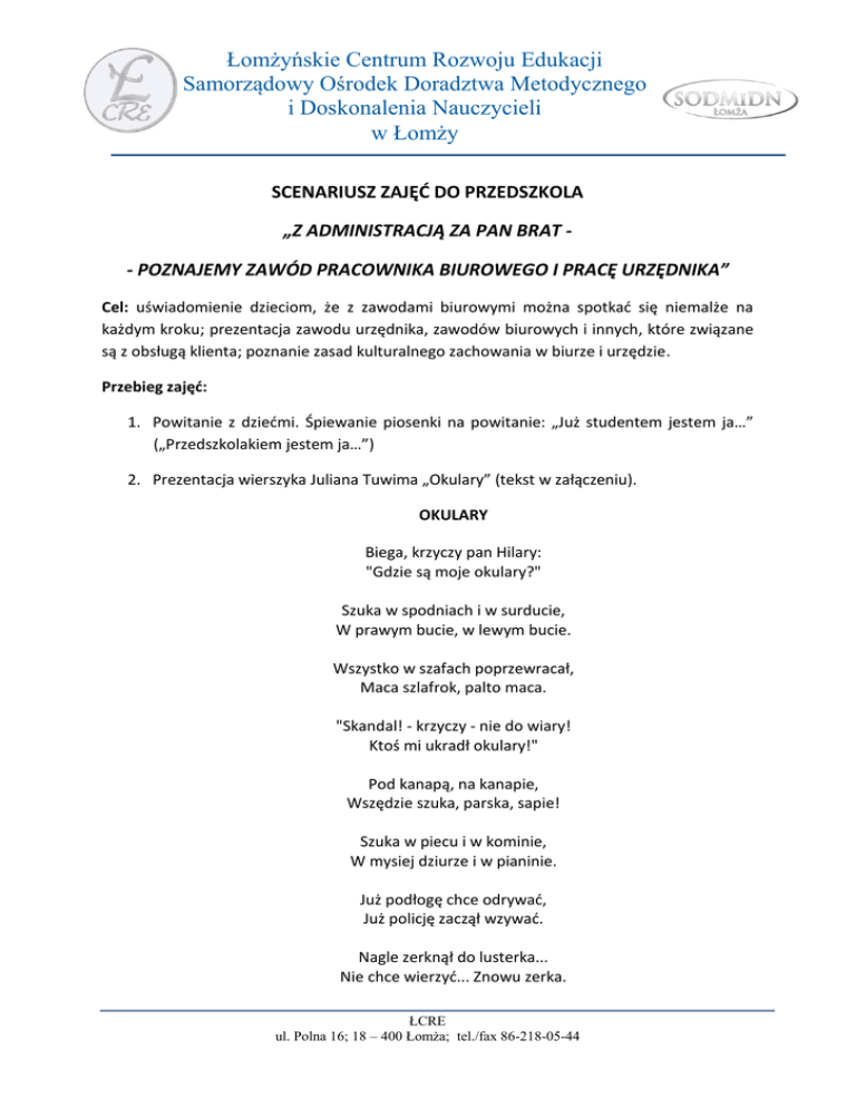 Łomżyńskie Centrum Rozwoju Edukacji Samorządowy Ośrodek Doradztwa Metodycznego i Doskonalenia Nauczycieli w Łomży SCENARIUSZ ZAJĘĆ DO PRZEDSZKOLA „Z ADMINISTRACJĄ ZA PAN BRAT - POZNAJEMY ZAWÓD PRACOWNIKA BIUROWEGO I PRACĘ URZĘDNIKA” Cel: uświadomienie dzieciom, że z zawodami biurowymi można spotkać się niemalże na każdym kroku; prezentacja zawodu urzędnika, zawodów biurowych i innych, które związane są z obsługą klienta; poznanie zasad kulturalnego zachowania w biurze i urzędzie. Przebieg zajęć: 1. Powitanie z dziećmi. Śpiewanie piosenki na powitanie: „Już studentem jestem ja…” („Przedszkolakiem jestem ja…”) 2. Prezentacja wierszyka Juliana Tuwima „Okulary” (tekst w załączeniu). OKULARY Biega, krzyczy pan Hilary: "Gdzie są moje okulary?" Szuka w spodniach i w surducie, W prawym bucie, w lewym bucie. Wszystko w szafach poprzewracał, Maca szlafrok, palto maca. "Skandal! - krzyczy - nie do wiary! Ktoś mi ukradł okulary!" Pod kanapą, na kanapie, Wszędzie szuka, parska, sapie! Szuka w piecu i w kominie, W mysiej dziurze i w pianinie. Już podłogę chce odrywać, Już policję zaczął wzywać. Nagle zerknął do lusterka... Nie chce wierzyć... Znowu zerka. ŁCRE ul. Polna 16; 18 – 400 Łomża; tel./fax 86-218-05-44 Łomżyńskie Centrum Rozwoju Edukacji Samorządowy Ośrodek Doradztwa Metodycznego i Doskonalenia Nauczycieli w Łomży Znalazł! Są! Okazało się, Że je ma na własnym nosie. 3. Dyskusja z dziećmi na temat usłyszanego wierszyka. Okulary jako jeden z atrybutów urzędnika. 4. Dyskusja z dziećmi na temat: wiele zawodów wymaga ubierania się w odpowiedni strój, charakterystyczny dla danej profesji (np. strażak, policjant, lekarz itp.). Jak Waszym zdaniem powinien wyglądać (ubierać się, jakie „gadżety” posiadać) urzędnik, dyrektor, pracownik biurowy? 5. Dyskusja z dziećmi na temat: Czy odpowiednim strojem możemy okazać szacunek wobec innych osób? Czy bycie schludnym i czystym jest ważne? Jak powinien ubierać się urzędnik, jak powinni ubierać się interesanci, którzy przychodzą do biura? 6. Dyskusja z dziećmi na temat: Jak Waszym zdaniem powinien zachowywać się urzędnik, dyrektor, pracownik biurowy? Jakie cechy powinny go określać? Jak powinien zachowywać się interesant, który przychodzi załatwić coś w biurze czy urzędzie? Rozmowa na temat zasad kulturalnego zachowania, uprzejmości i używania zwrotów grzecznościowych. Prezentacja wybranych wierszyków i piosenek. PAMIĘTAJ O POZDROWIENIACH Pamiętaj o pozdrowieniach Każdy, kto dobre ma wychowanie, mówi „Dzień dobry” na powitanie. Na pożegnanie zaś „Do widzenia”, bo to są miłe pozdrowienia.1 DZIEŃ DOBRY Dzień dobry tato i mamo kochana Dzień dobry wszystkim mówię już od rana Dzień dobry wołam do pana sąsiada Dzień będzie dobry, nawet, gdy deszczyk pada Pogłaszczę pieska przytulę też kotka Dzień dobry powiem, jeśli kogoś spotkam 1 http://zadane.pl/zadanie/3725386 (08.04.2015). ŁCRE ul. Polna 16; 18 – 400 Łomża; tel./fax 86-218-05-44 Łomżyńskie Centrum Rozwoju Edukacji Samorządowy Ośrodek Doradztwa Metodycznego i Doskonalenia Nauczycieli w Łomży Pomacham też ręką do pana sąsiada I już świeci słońce i deszcz przestał padać2 ZAKAZANE SŁOWA Czasem w ustach się kotłują brzydkie słowa, lecz przy innych je pod język szybko schowaj. Niech czekają pod jęzorem, aż wyplujesz je wieczorem.... do śmietnika. I bezwzględnie w towarzystwie ich unikaj! 3 ZACHOWANIE DOBRA SPRAWA Zachowanie dobra sprawa To uprzejmość i podstawa Gdy ktoś będzie beznadziejny To i tak bądź uprzejmy, Nie mów nigdy że to źle Bo to będzie bardzo bee Gdy upadnie komuś książka To nie pytaj czy to wstążka Czy to Lili czy Emilii Gorzej to niż źle Więc pamiętaj siostro, bracie Nie zawracaj gdy na starcie Gdy na dobro masz już parcie4 PIOSENKA „GRZECZNE SŁÓWKA” Dziękuję, przepraszam i proszę. Trzy słówka za trzy małe grosze. I grzeczny królewicz I grzeczna królewna Znają te słówka, na pewno. Ref. Trzy słówka za małe trzy grosze. Dziękuję, przepraszam i proszę. 2 http://www.wesolyprzedszkolak.pl/index.php/wiersze/375-wiersze-o-dobrym-wychowaniu (08.04.2015). http://www.wesolyprzedszkolak.pl/index.php/wiersze/375-wiersze-o-dobrym-wychowaniu (08.04.2015). 4 http://zapytaj.onet.pl/Category/015,004/2,23622298,Napiszcie_mi_wierszyk_o_dobrym_zachowaniu.html (08.04.2015). ŁCRE ul. Polna 16; 18 – 400 Łomża; tel./fax 86-218-05-44 3 Łomżyńskie Centrum Rozwoju Edukacji Samorządowy Ośrodek Doradztwa Metodycznego i Doskonalenia Nauczycieli w Łomży To przecież niewiele kosztuje, Gdy powiesz uprzejmie dziękuję. Korona ci z głowy Nie spadnie na pewno. Nawet, gdy jesteś królewną. Ref. Trzy słówka za małe trzy grosze. Dziękuję, przepraszam i proszę5, 6. PIOSENKA „CZARODZIEJSKIE ZNAM WYRAZY” Czarodziejskie znam wyrazy, które mówię wiele razy, Gdy przychodzę do przedszkola, to „Dzień Dobry” zawsze wołam, Zawsze mówię też dziękuję, gdy obiadek mi smakuje. Ref: Bo przepraszam i poproszę, Do widzenia i dziękuję I dzień dobry na dzień dobry Nic mnie przecież nie kosztuje. A gdy dostać chcę trzy grosze, wtedy mówię ja poproszę Gdy wyleje mi się kasza, głośno mówię ja przepraszam To zasługa naszej pani, że jesteśmy wychowani. Ref: Bo przepraszam i poproszę.........7,8 7. Dyskusja z dziećmi na temat: Czy sumienność, pracowitość, dbanie o ład i porządek jest ważne w pracy urzędnika? 8. Dyskusja z dziećmi na temat: Czy kiedyś byliście w biurze, urzędzie? Co tam widzieliście? Co się tam znajdowało, jakie jest wyposażenie biura, do czego służą poszczególne sprzęty, materiały biurowe? 9. Dyskusja z dziećmi na temat: Jak należy zachowywać się w urzędzie? Czy w urzędzie powinno być cicho? Prezentacja wierszyka „Hałas”. 5 http://www.wesolyprzedszkolak.pl/index.php/wiersze/375-wiersze-o-dobrym-wychowaniu (