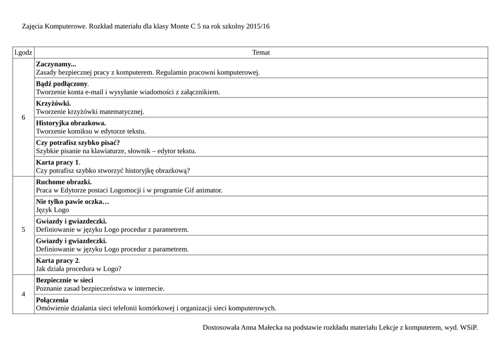 Zajęcia Komputerowe. Rozkład materiału dla klasy Monte C 5 na rok szkolny 2015/16 l.godz Temat Zaczynamy... Zasady bezpiecznej pracy z komputerem. Regulamin pracowni komputerowej. Bądź podłączony. Tworzenie konta e-mail i wysyłanie wiadomości z załącznikiem. 6 Krzyżówki. Tworzenie krzyżówki matematycznej. Historyjka obrazkowa. Tworzenie komiksu w edytorze tekstu. Czy potrafisz szybko pisać? Szybkie pisanie na klawiaturze, słownik – edytor tekstu. Karta pracy 1. Czy potrafisz szybko stworzyć historyjkę obrazkową? Ruchome obrazki. Praca w Edytorze postaci Logomocji i w programie Gif animator. Nie tylko pawie oczka… Język Logo 5 Gwiazdy i gwiazdeczki. Definiowanie w języku Logo procedur z parametrem. Gwiazdy i gwiazdeczki. Definiowanie w języku Logo procedur z parametrem. Karta pracy 2. Jak działa procedura w Logo? 4 Bezpiecznie w sieci Poznanie zasad bezpieczeństwa w internecie. Połączenia Omówienie działania sieci telefonii komórkowej i organizacji sieci komputerowych. Dostosowała Anna Małecka na podstawie rozkładu materiału Lekcje z komputerem, wyd. WSiP. Zajęcia Komputerowe. Rozkład materiału dla klasy Monte C 5 na rok szkolny 2015/16 Rozmowy w sieci Omówienie czatów i komunikatorów. Posługiwanie się akronimami i emotikonami. Zasady komunikowania się w sieci. Karta pracy 3 Bezpiecznie w sieci. Graj melodie Układanie nut na komputerze, tworzenie przycisków do odtwarzania melodii, komponowanie własnych melodii za pomocą modułu Melodia Logomocji. Mówiący komputer Pierwsza lekcja o dźwięku w komputerze. Nagrywanie i odtwarzanie dźwiękow w systemie Windows oraz w Logomocji. Korzystanie z syntezy mowy. 5 Dźwięki wokół nas Rozpoznawanie formatów zapisu dźwięku: MIDI, WAV, WMA i MP3. Nagrywanie, modyfikowanie i zapisywanie dźwięków w programie Audacity. Dźwięki w plikach i internecie Korzystanie z systemu pomocy programu Audacity. Zapisywanie dźwięku w formacie MP3. Komputerowa audycja radiowa, możliwości tworzenia dźwiękowych stron WWW, etyczne i prawne aspekty wykorzystywania utworów dźwiękowych. Wirtualne wędrówki Zwiedzanie ciekawych miejsc w internecie, korzystanie z usługi Google Street View i internetowego tłumacza. Co to jest Logomocja? Pokazy w Logomocji. Steruj żółwiem Rysowanie prostych figur – język Logo. 5 Naucz żółwia nowych słów Definiowanie procedur bez parametrów – język Logo. Kolorowe kwadraty Definiowanie procedur z parametrem – język Logo. Karta pracy 4. O logomocji. 6 Fotograficzne poprawki Cyfrowa obróbka zdjęć w programie PhotoFiltre – korygowanie podstawowych parametrów obrazu, usuwanie zbędnych elementów obrazu. Zabawy z obrazem Dostosowała Anna Małecka na podstawie rozkładu materiału Lekcje z komputerem, wyd. WSiP. Zajęcia Komputerowe. Rozkład materiału dla klasy Monte C 5 na rok szkolny 2015/16 Cyfrowa obróbka zdjęć w programie PhotoFilter – praca na warstwach obrazu, zamiana fotografii i w malowidło, stosowanie filtrów i efektów specjalnych. Fotohistoria Tworzenie filmu ze zdjęć w programie Photo Story. Zapisywanie i odtwarzanie filmu. Jak powstaje film? Przygotowanie projektu i scenariusza filmu z wybranych zdjęć. Importowanie plików do projektu Windows Movie Maker, stosowanie efektów specjalnych,zapisywanie filmu. Trzy, dwa, jeden… Edycja filmu w programie Windows Movie Maker. Nagrywanie audio- wideonarracji do filmu. Zapisywanie i odtwarzanie filmu. Trzy, dwa, jeden… Edycja filmu w programie Windows Movie Maker. Nagrywanie audio- wideonarracji do filmu. Zapisywanie i odtwarzanie filmu. 1 Podsumowanie i omówienie całorocznej pracy z komputerem. 32 Razem godzin Dostosowała Anna Małecka na podstawie rozkładu materiału Lekcje z komputerem, wyd. WSiP.