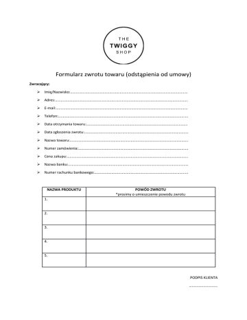 Formularz zwrotu towaru (odstąpienia od umowy) Zwracający:  Imię/Nazwisko:……………………………………………………………………………………………………………  Adres:………………………………………………………………………………………………………………………….  E-mail:…………………………………………………………………………………………………………………………  Telefon:……………………………………………………………………………………………………………………….  Data otrzymania towaru:…………………………………………………………………………………………….  Data zgłoszenia zwrotu:……………………………………………………………………………………………….  Nazwa towaru:…………………………………………………………………………………………………………….  Numer zamówienia:…………………………………………………………………………………………………….  Cena zakupu:……………………………………………………………………………………………………………….  Nazwa banku:………………………………………………………………………………………………………………  Numer rachunku bankowego:…………………………………………………………………………………….. NAZWA PRODUKTU POWÓD ZWROTU *prosimy o umieszczenie powodu zwrotu 1. 2. 3. 4. 5. PODPIS KLIENTA …………………………