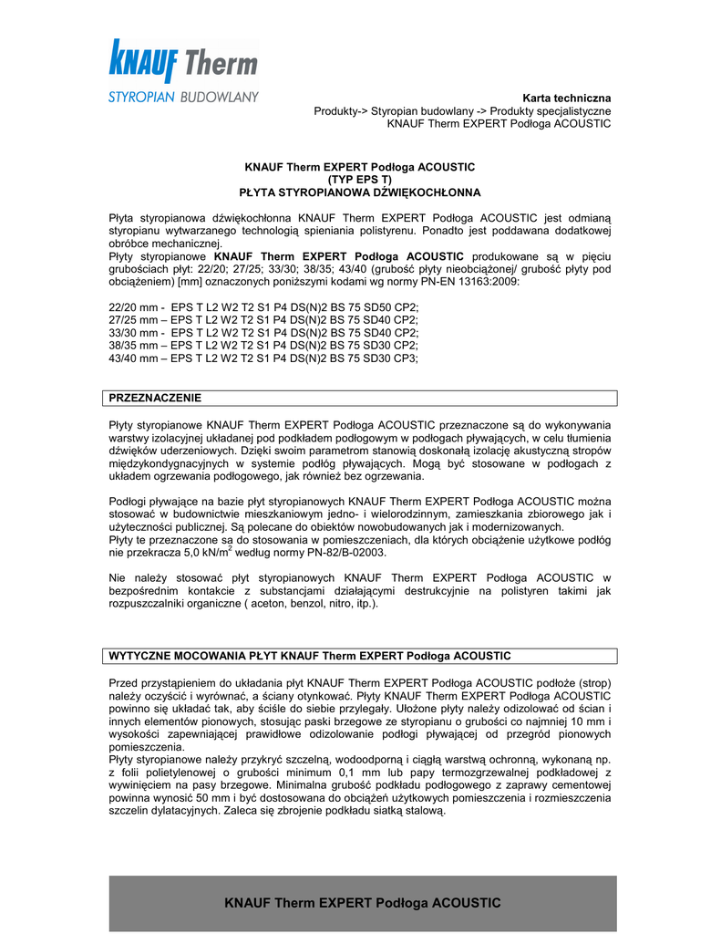 Karta techniczna Produkty-> Styropian budowlany -> Produkty specjalistyczne KNAUF Therm EXPERT Podłoga ACOUSTIC KNAUF Therm EXPERT Podłoga ACOUSTIC (TYP EPS T) PŁYTA STYROPIANOWA DŹWIĘKOCHŁONNA Płyta styropianowa dźwiękochłonna KNAUF Therm EXPERT Podłoga ACOUSTIC jest odmianą styropianu wytwarzanego technologią spieniania polistyrenu. Ponadto jest poddawana dodatkowej obróbce mechanicznej. Płyty styropianowe KNAUF Therm EXPERT Podłoga ACOUSTIC produkowane są w pięciu grubościach płyt: 22/20; 27/25; 33/30; 38/35; 43/40 (grubość płyty nieobciąŜonej/ grubość płyty pod obciąŜeniem) [mm] oznaczonych poniŜszymi kodami wg normy PN-EN 13163:2009: 22/20 mm - EPS T L2 W2 T2 S1 P4 DS(N)2 BS 75 SD50 CP2; 27/25 mm – EPS T L2 W2 T2 S1 P4 DS(N)2 BS 75 SD40 CP2; 33/30 mm - EPS T L2 W2 T2 S1 P4 DS(N)2 BS 75 SD40 CP2; 38/35 mm – EPS T L2 W2 T2 S1 P4 DS(N)2 BS 75 SD30 CP2; 43/40 mm – EPS T L2 W2 T2 S1 P4 DS(N)2 BS 75 SD30 CP3; PRZEZNACZENIE Płyty styropianowe KNAUF Therm EXPERT Podłoga ACOUSTIC przeznaczone są do wykonywania warstwy izolacyjnej układanej pod podkładem podłogowym w podłogach pływających, w celu tłumienia dźwięków uderzeniowych. Dzięki swoim parametrom stanowią doskonałą izolację akustyczną stropów międzykondygnacyjnych w systemie podłóg pływających. Mogą być stosowane w podłogach z układem ogrzewania podłogowego, jak równieŜ bez ogrzewania. Podłogi pływające na bazie płyt styropianowych KNAUF Therm EXPERT Podłoga ACOUSTIC moŜna stosować w budownictwie mieszkaniowym jedno- i wielorodzinnym, zamieszkania zbiorowego jak i uŜyteczności publicznej. Są polecane do obiektów nowobudowanych jak i modernizowanych. Płyty te przeznaczone sa do stosowania w pomieszczeniach, dla których obciąŜenie uŜytkowe podłóg 2 nie przekracza 5,0 kN/m według normy PN-82/B-02003. Nie naleŜy stosować płyt styropianowych KNAUF Therm EXPERT Podłoga ACOUSTIC w bezpośrednim kontakcie z substancjami działającymi destrukcyjnie na polistyren takimi jak rozpuszczalniki organiczne ( aceton, benzol, nitro, itp.). WYTYCZNE MOCOWANIA PŁYT KNAUF Therm EXPERT Podłoga ACOUSTIC Przed przystąpieniem do układania płyt KNAUF Therm EXPERT Podłoga ACOUSTIC podłoŜe (strop) naleŜy oczyścić i wyrównać, a ściany otynkować. Płyty KNAUF Therm EXPERT Podłoga ACOUSTIC powinno się układać tak, aby ściśle do siebie przylegały. UłoŜone płyty naleŜy odizolować od ścian i innych elementów pionowych, stosując paski brzegowe ze styropianu o grubości co najmniej 10 mm i wysokości zapewniającej prawidłowe odizolowanie podłogi pływającej od przegród pionowych pomieszczenia. Płyty styropianowe naleŜy przykryć szczelną, wodoodporną i ciągłą warstwą ochronną, wykonaną np. z folii polietylenowej o grubości minimum 0,1 mm lub papy termozgrzewalnej podkładowej z wywinięciem na pasy brzegowe. Minimalna grubość podkładu podłogowego z zaprawy cementowej powinna wynosić 50 mm i być dostosowana do obciąŜeń uŜytkowych pomieszczenia i rozmieszczenia szczelin dylatacyjnych. Zaleca się zbrojenie podkładu siatką stalową. KNAUF Therm EXPERT Podłoga ACOUSTIC Karta techniczna Produkty-> Styropian budowlany -> Produkty specjalistyczne KNAUF Therm EXPERT Podłoga ACOUSTIC Styropian akustyczny KNAUF Therm jest nietoksyczny i chemicznie obojętny, w czasie instalowania wyrobów z EPS wykonawca nie musi uŜywać ubioru ochronnego i nie musi podejmować Ŝadnych specjalnych środków ostroŜności mających na celu ochronę jego zdrowia. DANE TECHNICZNE Dostępne grubości płyt styropianowych bez obciąŜenia/pod obciąŜeniem [mm] 22/20; 27/25; 33/30; 38/35; 43/40 Kształt krawędzi Wymiary [mm] Zdolności samogaśnięcia Klasa reakcji na ogień Poziom wytrzymałości na zginanie [kPa] Prostokątny - zakładka 1000 x 500 SAMOGASNĄCY E ≤ 75 Grubość płyt [mm] (podłoga bez obciąŜenia i pod obciąŜeniem) PrzybliŜony wskaźnik zmniejszenia poziomu uderzeniowego ∆Lw [dB] ObciąŜenie uŜytkowe 2 podłogi [KN/m ] Poziom sztywności dynamicznej 3 SD [MN/m ] 22/20 27/25 33/30 38/35 43/40 24 25 26 27 27 5.0 5.0 5.0 5.0 5.0 SD 50 SD 40 SD 40 SD 30 SD 30 Właściwość Klasa Wartość Długość Szerokość Grubość Prostokątność Płaskość L2 W2 T2 S1 P4 ± 0.6 mm ± 0.6 mm ± 0.08 mm ± 2.73 mm ± 5 mm KNAUF Therm EXPERT Podłoga ACOUSTIC Karta techniczna Produkty-> Styropian budowlany -> Produkty specjalistyczne KNAUF Therm EXPERT Podłoga ACOUSTIC WYDAJNOŚĆ Typ produktu KNAUF Therm EXPERT Podłoga Acoustic Ilość płyt w paczce [szt.] 2 Powierzchnia krycia [m ] 3 Objętość paczki [m ] Grubość płyt [mm] 22 27 14 0.3 27 22 11 0.3 33 18 9 0.3 38 16 8 0.3 43 14 7 0.3 PAKOWANIE, PRZECHOWYWANIE, TRANSPORT Płyty styropianowe Knauf Therm Podłoga Acoustic, są dostarczane tylko i wyłącznie w oryginalnych opakowaniach producenta, tj. firmy KNAUF Industries. Opakowanie wyrobu zawiera informacje dotyczące: nazwy wyrobu, nazwę producenta, datę produkcji, numer polskiej Normy PN-EN 13163:2009, kod wg tej normy, deklarowane parametry techniczne. Płyty styropianowe naleŜy przechowywać w sposób zabezpieczający je przed uszkodzeniami mechanicznymi, oddziaływaniem warunków atmosferycznych. DOKUMENTY ODNIESIENIA • • • Norma zharmonizowana 13163:2009 Certyfikat zgodności ITB-0492 Atest higieniczny nr HK/B/1171/03/2009 KNAUF Therm EXPERT Podłoga ACOUSTIC
