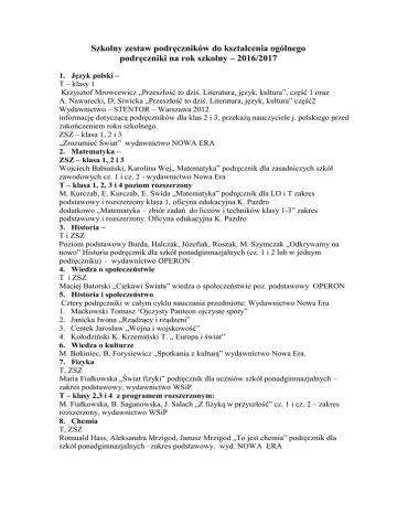 Szkolny zestaw podręczników do kształcenia ogólnego podręczniki na rok szkolny – 2016/2017 1. Język polski – T – klasy 1 Krzysztof Mrowcewicz „Przeszłość to dziś. Literatura, język, kultura”, część 1 oraz A. Nawarecki, D. Siwicka „Przeszłość to dziś. Literatura, język, kultura” część2 Wydawnictwo – STENTOR – Warszawa 2012 informację dotyczącą podręczników dla klas 2 i 3, przekażą nauczyciele j. polskiego przed zakończeniem roku szkolnego. ZSZ – klasa 1, 2 i 3 „Zrozumieć Świat” wydawnictwo NOWA ERA 2. Matematyka – ZSZ – klasa 1, 2 i 3 Wojciech Babiański, Karolina Wej„ Matematyka” podręcznik dla zasadniczych szkół zawodowych cz. 1 i cz. 2 - wydawnictwo Nowa Era T – klasa 1, 2, 3 i 4 poziom rozszerzony M. Kurczab, E. Kurczab, E. Świda „Matematyka” podręcznik dla LO i T zakres podstawowy i rozszerzony klasa 1, oficyna edukacyjna K. Pazdro dodatkowo „Matematyka – zbiór zadań do liceów i techników klasy 1-3” zakres podstawowy i rozszerzony. Oficyna edukacyjna K. Pazdro 3. Historia – T i ZSZ Poziom podstawowy Burda, Halczak, Józefiak, Roszak, M. Szymczak „Odkrywamy na nowo” Historia podręcznik dla szkół ponadgimnazjalnych (cz. 1 i 2 lub w jednym podręczniku) – wydawnictwo OPERON 4. Wiedza o społeczeństwie T i ZSZ Maciej Batorski „Ciekawi Świata” wiedza o społeczeństwie poz. podstawowy OPERON 5. Historia i społeczeństwo Cztery podręczniki w całym cyklu nauczania przedmiotu: Wydawnictwo Nowa Era 1. Maćkowski Tomasz „Ojczysty Panteon ojczyste spory” 2. Janicka Iwona „Rządzący i rządzeni” 3. Centek Jarosław „Wojna i wojskowość” 4. Kołodziński K. Krzemiński T. „ Europa i świat” 6. Wiedza o kulturze M. Bokiniec, B. Forysiewicz „Spotkania z kulturą” wydawnictwo Nowa Era. 7. Fizyka T, ZSZ Maria Fiałkowska „Świat fizyki” podręcznik dla uczniów szkół ponadgimnazjalnych – zakres podstawowy, wydawnictwo WSiP T – klasy 2,3 i 4 z programem rozszerzonym: M. Fiałkowska, B. Saganowska, J. Salach „Z fizyką w przyszłość” cz. 1 i cz. 2 – zakres rozszerzony, wydawnictwo WSiP 8. Chemia T, ZSZ Romuald Hass, Aleksandra Mrzigod, Janusz Mrzigod „To jest chemia” podręcznik dla szkół ponadgimnazjalnych –zakres podstawowy. wyd. NOWA ERA 9. Biologia T, ZSZ Emilia Bonar, Weronika Krzeszowiec Jeleń, Stanisław Czachorowski „Biologia na czasie – zakres podstawowy” podręcznik dla szkół ponadgimnazjalnych wyd. Nowa ERA 10. Geografia T, ZSZ Poziom podstawowy: Radosław Uliszak, Krzysztof Wiedermann „Oblicza geografii” zakres podstawowy wydawnictwo Nowa ERA Poziom rozszerzony: Roman Malarz, Marek Więckowski „Oblicza geografii 1” zakres rozszerzony – wydawnictwo Nowa ERA 11. Podstawy przedsiębiorczości T, ZSZ - klasy 1 Z. Makieła, T. Rachwał „Krok w przedsiębiorczość” podręcznik + zeszyt ćwiczeń, wydawnictwo: Nowa Era 12. Edukacja dla bezpieczeństwa T, ZSZ B. Breitkopf, M. Cieśla „Edukacja dla bezpieczeństwa po prostu” WSiP podręcznik dla szkół ponadgimnazjalnych 13. Informatyka T, ZSZ Poziom podstawowy G. Hermanowska,W. Hermanowski „Informatyka” seria Ciekawi Świata wydawnictwo OPERON podręcznik dla szkół ponadgimnazjalnych 14. Język angielski T – klasy 1 i 2 Poziom podstawowy Tim Falla, Paul A,Davies „Oxford solutions” poziom: intermediate wydawnictwo OXFORD klasa 2 i 3 „New Matura Solutions” poziom intermediate oraz upper-intermediate , wydawnictwo OXFORD Klasy 4 M. Rosińska, L. Edwards “Matura 2015 repetytorium” wydawnictwo: MacMillan ZSZ – klasa 1 Tim Falla, A. Davies “New Matura Solutions” poziom elementarny, wyd. OXFORD ZSZ klasa 2: New Horizons 1 (kontynuacja), New Horizons 2, wydawnictwo: OXFORD 16. język angielski zawodowy Technik informatyk i teleinformatyk: E.H. Glendining, J. McEvan „Oxford English for Information Technology” wyd. OXFORD Technik mechatronik: D. Bonamy “Technical English 3” wyd. Pearson Longman Technik elektronik: V. Evans, J.Dooley, C. Taylor „Electronics (seria Career Paths ) wyd. Express Publishing Technik elektryk i ZSZ – elektryk: V. Evans, J. Dooley, T. O‟Dell „Electrrician (seria Career Paths) wyd. Express Publishing ZSZ monter mechatronik: D. Bonamy „Technical English 1” wyd. Pearson Longman 17. Język niemiecki zawodowy Technikum - elektryk, elektronik, mechatronik: “Mit Beruf auf Deutsch” język niemiecki zawodowy dla szkół ponadgimnazjalnych - profil elektryczno-elektroniczny, Barbara Kujawa, Mariusz Stinia, wydawnictwo – Nowa Era Technikum - informatyk, teleinformatyk: zeszyt ćwiczeń „Język Niemiecki Zawodowy” w branży elektronicznej, informatycznej i elektrycznej, Joanna Długołęcka, Sebastian Chadaj, wydawnictwo – WsiP Zasadnicza Szkoła Zawodowa Podręcznik z ćwiczeniami: „Genau!” tom 1 język niemiecki dla szkół ponadgimnazjalnych, Carla Tkadkeckova, Peter Tlusty, wydawnictwo Lektor Klett 18. Język niemiecki – poziom podstawowy T – klasy 1 Georgio Motta „Exakt Fur Dich” język niemiecki dla szkół ponadgimnazjalnych, podręcznik + zeszyt ćwiczeń tomI wyd. LektorKlett T – klasy 2 Georgio Motta „Exakt Fur Dich” tom II, język niemiecki dla szkół ponadgimnazjalnych, podręcznik + zeszyt ćwiczeń wyd. LerktorKlett T- klasy 3 Beata Ćwikowska, Beata Jaroszewicz, Anna Wojdat-Niklewska „Repetytorium maturalne” język niemiecki- poziom podstawowy matura 2015 wydawnictwo LektorKlett 19. Religia T, ZSZ W. Galant, R. Strus „Świadczę o Jezusie w Kościele” podręcznik dla klasy I szkoły ponadgimnazjalnej, wydawnictwo Gaudium, Lublin-Przemyśl-Zamość 2012. 20. Wychowanie do życia w rodzinie T – klasa 1 i 2 A. Jaczewski, Z. Izdebski „Kocha, lubi, szanuje” wydawnictwo PWN UWAGA!!! Materiały do nauczania przedmiotów zawodowych zostaną wskazane lub udostępnione przez szkołę w dniu rozpoczęcia zajęć.