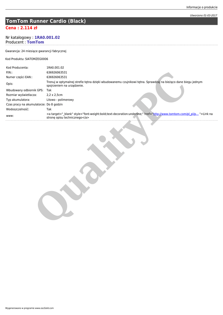 Informacje o produkcie Utworzono 01-03-2017 TomTom Runner Cardio (Black) Cena : 2.114 zł Nr katalogowy : 1RA0.001.02 Producent : TomTom Gwarancja: 24 miesiące gwarancji fabrycznej Kod Produktu: SIATOMZEG0006 1RA0.001.02 P/N:: 636926063531 Numer części EAN:: 636926063531 Opis: Trenuj w optymalnej strefie tętna dzięki wbudowanemu czujnikowi tętna. Sprawdzaj na bieżąco dane biegu jednym spojrzeniem na urządzenie. Wbudowany odbiornik GPS: Tak Rozmiar wyświetlacza: 2,2 x 2,5cm Typ akumulatora: Litowo - polimerowy Czas pracy na akumulatorze: Do 8 godzin C Kod Producenta: Tak www: <a target="_blank" style="font-weight:bold;text-decoration:underline;" href="http://www.tomtom.com/pl_pl/p... ">Link na stronę opisu technicznego</a> Q ua lit yP Wodoszczelność: Wygenerowano w programie www.oscGold.com