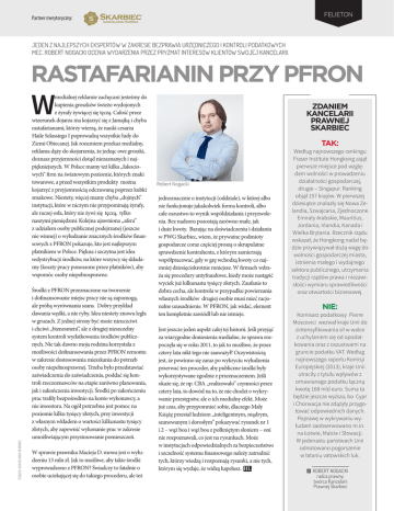 FELIETON Partner merytoryczny: JEDEN Z NAJLEPSZYCH EKSPERTÓW W ZAKRESIE BEZPRAWIA URZĘDNICZEGO I KONTROLI PODATKOWYCH MEC. ROBERT NOGACKI OCENIA WYDARZENIA PRZEZ PRYZMAT INTERESÓW KLIENTÓW SWOJEJ KANCELARII. RASTAFARIANIN PRZY PFRON W ZDJĘCIA: KANCELARIA SKARBIEC medialnej reklamie zachęcani jesteśmy do kupienia groszków świeżo wydojonych z żyrafy żywiącej się tęczą. Całość przez wizerunek dojarza ma kojarzyć się z Jamajką i chyba rastafarianami, którzy wierzą, że nauki cesarza Haile Selassiego I poprowadzą wszystkie ludy do Ziemi Obiecanej. Jak rozumiem przekaz medialny, reklama dąży do skojarzenia, że jedząc owe groszki, doznasz przyjemności dotąd niezaznanych i najpiękniejszych. W Polsce mamy też kilka „łakociowych” firm na światowym poziomie, których znaki towarowe, a przed wszystkim produkty można kojarzyć z przyjemnością odczuwaną poprzez kubki smakowe. Niestety, więcej mamy chyba „dojnych” instytucji, które w niczym nie przypominają żyrafy, ale raczej osła, który nie żywi się tęczą, tylko naszymi pieniędzmi. Kolejna ujawniona „afera” z udziałem osoby publicznej podejrzanej (jeszcze nie winnej) o wyłudzanie znacznych środków finansowych z PFRON pokazuje, kto jest najlepszym płatnikiem w Polsce. Piękna i szczytna jest idea redystrybucji środków, na które wszyscy się składamy (koszty pracy ponoszone przez płatników), aby wspomóc osoby niepełnosprawne. Środki z PFRON przeznaczone na tworzenie i dofinansowanie miejsc pracy nie są zapomogą, ale próbą wyrównania szans. Dobry przykład dawania wędki, a nie ryby. Idea niestety znowu legła w gruzach. Z jednej strony być może nieuczciwi i chciwi „biznesmeni”, ale z drugiej nieszczelny system kontroli wydatkowania środków publicznych. Nie tak dawno moja rodzina korzystała z możliwości dofinansowania przez PFRON remontu w zakresie dostosowania mieszkania do potrzeb osoby niepełnosprawnej. Trzeba było przedstawiać zaświadczenia do zaświadczenia, poddać się kontroli rzeczoznawców na etapie zarówno planowania, jak i zakończenia inwestycji. Środki po zakończeniu prac trafiły bezpośrednio na konto wykonawcy, a nie inwestora. Na ogół potrzebna jest pomoc na poziomie kilku tysięcy złotych, przy inwestycji z własnym wkładem o wartości kilkunastu tysięcy złotych, aby zapewnić wykonanie prac w zakresie umożliwiającym przystosowanie pomieszczeń. W sprawie prawnika Macieja D. mowa jest o wyłudzeniu 13 mln zł. Jak to możliwe, aby takie środki wyprowadzono z PFRON? Świadczy to fatalnie o osobie uciekającej się do takiego procederu, ale też ZDANIEM KANCELARII PRAWNEJ SKARBIEC TAK: Robert Nogacki jednoznacznie o instytucji (oddziale), w której albo nie funkcjonuje jakakolwiek forma kontroli, albo całe oszustwo to wynik współdziałania i przyzwolenia. Bez nadzoru pozostają zarówno małe, jak i duże kwoty. Bazując na doświadczeniu i działaniu w PWG Skarbiec, wiem, że prywatne podmioty gospodarcze coraz częściej proszą o skrupulatne sprawdzenie kontrahenta, z którym zamierzają współpracować, gdy w grę wchodzą kwoty co najmniej dziesięciokrotnie mniejsze. W firmach wdraża się procedury antyfraudowe, kiedy może nastąpić wyciek już kilkunastu tysięcy złotych. Zaufanie to dobra cecha, ale kontrola w przypadku powierzania własnych środków drugiej osobie musi mieć racjonalne uzasadnienie. W PFRON, jak widać, element ten kompletnie zawiódł lub nie istnieje. Jest jeszcze jeden aspekt całej tej historii. Jeśli przyjąć za wiarygodne doniesienia medialne, że sprawa rozpoczęła się w roku 2011, to jak to możliwe, że przez cztery lata nikt tego nie zauważył? Oczywistością jest, że powinno się zaraz po wykryciu wyłudzenia przerwać ten proceder, aby publiczne środki były wykorzystywane zgodnie z przeznaczeniem. Jeśli okaże się, że np. CBA „realizowało” czynności przez cztery lata, to dowód na to, że nie chodzi o wykrywanie przestępstw, ale o ich medialny efekt. Może już czas, aby przypomnieć sobie, dlaczego Mały Książę przestał ludziom „inteligentnym, mądrym, szanowanym i dorosłym” pokazywać rysunek nr 1 i 2 – wąż boa i wąż boa z połkniętym słoniem – oni nie rozpoznawali, co jest na rysunkach. Może w instytucjach odpowiedzialnych za bezpieczeństwo i szczelność systemu finansowego należy zatrudnić tych, którzy wiedzą i rozpoznają rysunki, a nie tych, którym się wydaje, że widzą kapelusz. HL Według najnowszego rankingu Fraser Institute Hongkong zajął pierwsze miejsce pod względem wolności w prowadzeniu działalności gospodarczej, drugie – Singapur. Ranking objął 157 krajów. W pierwszej dziesiątce znalazły się Nowa Zelandia, Szwajcaria, Zjednoczone Emiraty Arabskie, Mauritius, Jordania, Irlandia, Kanada i Wielka Brytania. Rzecznik rządu wskazał, że Hongkong nadal będzie przywiązywał dużą wagę do wolności gospodarczej miasta, istnienia małego i wydajnego sektora publicznego, utrzymania tradycji rządów prawa i niezawisłości wymiaru sprawiedliwości oraz otwartości biznesowej. NIE: Komisarz podatkowy Pierre Moscovici wezwał kraje Unii do zintensyfikowania sił w walce z uchylaniem się od opodatkowania oraz z oszustwami na gruncie podatku VAT. Według najnowszego raportu Komisji Europejskiej (2013), kraje Unii utraciły z tytułu wpływów z omawianego podatku łączną kwotę 168 mld euro. Suma ta będzie jeszcze wyższa, bo Cypr i Chorwacja nie zdążyły przygotować odpowiednich danych. Poprawę w wykrywaniu wyłudzeń zaobserwowano m.in. na Łotwie, Malcie i Słowacji. W jedenastu państwach Unii odnotowano pogorszenie w łataniu vatowskich luk. ROBERT NOGACKI radca prawny, twórca Kancelarii Prawnej Skarbiec