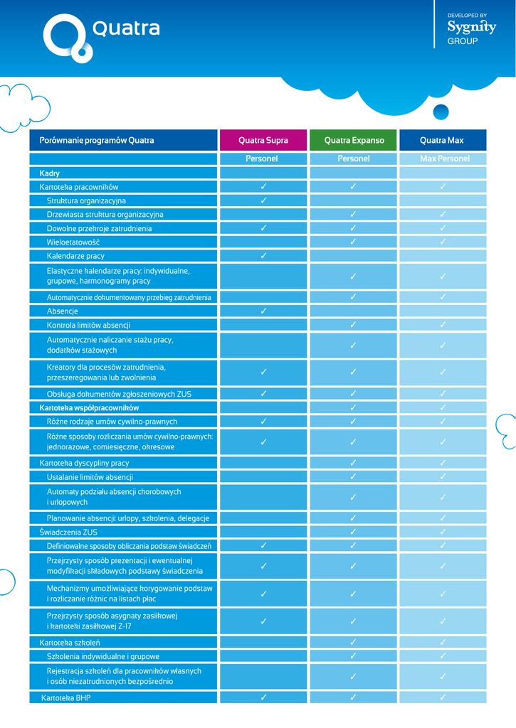 Quatra Supra Quatra Expanso Personel Personel Max Personel ✓ ✓ ✓ ✓ ✓ ✓ ✓ ✓ ✓ Elastyczne kalendarze pracy: indywidualne, grupowe, harmonogramy pracy ✓ ✓ Automatycznie dokumentowany przebieg zatrudnienia ✓ ✓ Kontrola limitów absencji ✓ ✓ Automatycznie naliczanie stażu pracy, dodatków stażowych ✓ ✓ Porównanie programów Quatra Quatra Max Kadry Kartoteka pracowników Struktura organizacyjna ✓ Drzewiasta struktura organizacyjna Dowolne przekroje zatrudnienia ✓ Wieloetatowość Kalendarze pracy Absencje ✓ ✓ Kreatory dla procesów zatrudnienia, przeszeregowania lub zwolnienia ✓ ✓ ✓ Obsługa dokumentów zgłoszeniowych ZUS ✓ ✓ ✓ ✓ ✓ Kartoteka współpracowników Różne rodzaje umów cywilno-prawnych ✓ ✓ ✓ Różne sposoby rozliczania umów cywilno-prawnych: jednorazowe, comiesięczne, okresowe ✓ ✓ ✓ ✓ ✓ Ustalanie limitów absencji ✓ ✓ Automaty podziału absencji chorobowych i urlopowych ✓ ✓ Planowanie absencji: urlopy, szkolenia, delegacje ✓ ✓ ✓ ✓ Kartoteka dyscypliny pracy Świadczenia ZUS Definiowalne sposoby obliczania podstaw świadczeń ✓ ✓ ✓ Przejrzysty sposób prezentacji i ewentualnej modyfikacji składowych podstawy świadczenia ✓ ✓ ✓ Mechanizmy umożliwiające korygowanie podstaw i rozliczanie różnic na listach płac ✓ ✓ ✓ Przejrzysty sposób asygnaty zasiłkowej i kartoteki zasiłkowej Z-17 ✓ ✓ ✓ ✓ ✓ Szkolenia indywidualne i grupowe ✓ ✓ Rejestracja szkoleń dla pracowników własnych i osób niezatrudnionych bezpośrednio ✓ ✓ ✓ ✓ Kartoteka szkoleń Kartoteka BHP ✓ Quatra Expanso Quatra Max Kartoteka wojskowa ✓ ✓ Kartoteka medyczna ✓ ✓ ✓ ✓ Porównanie programów Quatra Elastyczny mechanizm raportowania Quatra Supra ✓ Zarządzanie personelem Opis stanowiska pracy ✓ Etatyzacja ✓ Rekrutacja pracowników ✓ Zarządzanie szkoleniami pracowników ✓ Oceny pracownicze ✓ Nadzór nad ścieżką rozwoju pracowników ✓ Fundusze pracownicze ZFRON, ZFM, ZFŚS, PKZP ✓ ✓ Obsługa dowolnych innych funduszy ✓ ✓ Harmonogramowanie spłat i ich rozliczanie ✓ ✓ Obsługa odsetek wg różnych algorytmów naliczania ✓ ✓ Współpraca z większością urządzeń RCP ✓ ✓ Wykorzystanie zastanych rozwiązań rejestrujących ✓ ✓ Dedykowany panel kontroli zdarzeń ✓ ✓ Możliwość interpretacji zarejestrowanych zdarzeń np. obsługa nocnej zmiany ✓ ✓ System uprawnień - akceptacja zapisów ✓ ✓ Wykorzystanie mechanizmu Kalendarzy pracy ✓ ✓ Różne rodzaje formatek wprowadzenia danych: jednoczynnościowe, wieloczynnościowe, dzienne, miesięczne ✓ ✓ Definiowanie dowolnych jednostek pracy ✓ ✓ Ewidencja pracy pracowników na rzecz projektów, zleceń, produktów itd. ✓ ✓ Rozliczanie akordu ✓ ✓ Wykorzystanie kart pracy w procesie naliczania płac ✓ ✓ Rozliczanie i analiza kosztów pracy ✓ ✓ ✓ ✓ ✓ ✓ Współpraca z urządzeniami RCP Karty pracy Płace Listy płac Definiowane szablony list płac ✓ ✓ Definiowane szablony list płac dla Jednostek Organizacyjnych i/lub struktur zatrudnienia Różne scenariusze realizacji list płac ✓ ✓ ✓ Definiowane składniki wynagrodzeń ✓ ✓ ✓ Quatra Supra Quatra Expanso Quatra Max Definiowanie algorytmów wyliczania składek ✓ ✓ ✓ Algorytmy wyliczania składek ✓ Algorytmy wyliczania składek dla Jednostek Organizacyjnych i/lub struktur zatrudnienia ✓ ✓ Mechanizmy szybkiego wprowadzania składników płacowych dla grup pracowników np. premie uznaniowe ✓ ✓ ✓ ✓ ✓ Przegląd wg okresów kosztów, dat wypłat, dat ZUS ✓ ✓ ✓ Dowolne raporty i zestawienia ✓ ✓ ✓ Deklaracje PIT i ZUS ✓ ✓ ✓ Porównanie programów Quatra Kartoteka zarobkowa Pełna integracja z modułem Kadry Współpraca z modułem Finansowym - reguły księgowania ✓ ✓ ✓ ✓ Współpraca z modułem Rejestracji Czasu Pracy ✓ ✓ Współpraca z modułem Karty pracy ✓ ✓ Współpraca z modułem Fundusze Pracownicze ✓ ✓ Automatyczne generowanie przelewów zbiorczych do banków ✓ ✓ ✓ Elastyczny mechanizm raportowania ✓ ✓ ✓ Definiowane dokumenty kadrowe i płacowe – - szablony XML ✓ ✓ ✓ Kreator raportów ✓ ✓ ✓ Możliwość wysyłania raportów e-mailem z systemu ✓ ✓ ✓ Różne formaty zapisu (CSV, XLS, RTF, HTML, PDF) ✓ ✓ ✓ Generacja dokumentów na potrzeby różnych organizacji: US, GUS, ZUS, banki ✓ ✓ ✓ Ewidencja danych i kontrola limitów zgodnie z wymogami ZUS ✓ ✓ ✓ Automatyczna generacja deklaracji zgłoszeniowych i rozliczeniowych ZUS ✓ ✓ ✓ Generowanie wymaganych raportów GUS, US ✓ ✓ ✓ Obowiązkowe dokumenty kadrowe i płacowe, formularze PIT ✓ ✓ ✓ Interfejs do programu Płatnik ✓ ✓ ✓ Komunikacja z systemami bankowości elektronicznej ✓ ✓ Dokumenty i raporty US, GUS, ZUS, Płatnik, Banki Komunikacja z systemami urzędów drogą elektroniczną ✓ Porównanie programów Quatra Quatra Supra Quatra Expanso Quatra Max Kalendarze pracy i harmonogramy ✓ Różne rodzaje kalendarzy pracy: grupowe, indywidualne, w podziale na kalendarze godzinowe i zmianowe ✓ ✓ Możliwość definiowania wielu typów zmian w obrębie 1., 2., 3. zmiany ✓ ✓ Pełna informacja na temat rozpoczęcia i zakończenia pracy oraz ewentualnych przerw ✓ ✓ Automatyczne określanie liczby godzin do przepracowania w zależności od indywidualnych danych pracowników (wymiar etatu, stopień niepełnosprawności) ✓ ✓ Elastyczność i przyjazność harmonogramów oraz formuł sprawdzających poprawność stworzonego harmonogramu, z uwzględnieniem przepisów o czasie pracy ✓ ✓ Możliwość przenoszenia danych domyślnych na karty pracy, z możliwością ich edycji ✓ ✓ Funkcje e-biznesowe Prezentacja wybranych informacji uprawnionym pracownikom ✓ Powiadamianie o zdarzeniach w systemie przez e-mail ✓ Wykorzystanie w systemie możliwości Internetu ✓ Komunikacja elektronicz