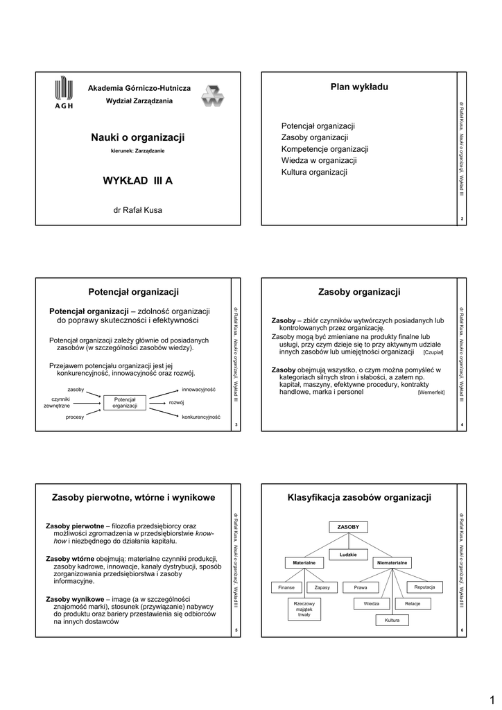 Plan wykładu Akademia Górniczo-Hutnicza dr Rafał Kusa, Nauki o organizacji, Wykład III Wydział Zarządzania Potencjał organizacji Zasoby organizacji Kompetencje organizacji Wiedza w organizacji Kultura organizacji Nauki o organizacji kierunek: Zarządzanie WYKŁAD III A dr Rafał Kusa 2 Potencjał organizacji Zasoby organizacji Przejawem potencjału organizacji jest jej konkurencyjność, innowacyjność oraz rozwój. zasoby czynniki zewnętrzne procesy innowacyjność Potencjał organizacji rozwój Zasoby – zbiór czynników wytwórczych posiadanych lub kontrolowanych przez organizację. Zasoby mogą być zmieniane na produkty finalne lub usługi, przy czym dzieje się to przy aktywnym udziale innych zasobów lub umiejętności organizacji [Czupiał] Zasoby obejmują wszystko, o czym moŜna pomyśleć w kategoriach silnych stron i słabości, a zatem np. kapitał, maszyny, efektywne procedury, kontrakty handlowe, marka i personel [Wernerfeit] dr Rafał Kusa, Nauki o organizacji, Wykład III Potencjał organizacji zaleŜy głównie od posiadanych zasobów (w szczególności zasobów wiedzy). dr Rafał Kusa, Nauki o organizacji, Wykład III Potencjał organizacji – zdolność organizacji do poprawy skuteczności i efektywności konkurencyjność 3 Zasoby pierwotne, wtórne i wynikowe Zasoby wynikowe – image (a w szczególności znajomość marki), stosunek (przywiązanie) nabywcy do produktu oraz bariery przestawienia się odbiorców na innych dostawców ZASOBY Ludzkie Materialne Finanse Rzeczowy majątek trwały Zapasy Niematerialne Reputacja Prawa Wiedza Relacje dr Rafał Kusa, Nauki o organizacji, Wykład III Zasoby wtórne obejmują: materialne czynniki produkcji, zasoby kadrowe, innowacje, kanały dystrybucji, sposób zorganizowania przedsiębiorstwa i zasoby informacyjne. Klasyfikacja zasobów organizacji dr Rafał Kusa, Nauki o organizacji, Wykład III Zasoby pierwotne – filozofia przedsiębiorcy oraz moŜliwości zgromadzenia w przedsiębiorstwie knowhow i niezbędnego do działania kapitału. 4 Kultura 5 6 1 Zasoby materialne i niematerialne Cechy zasobów niematerialnych: • mogą być wykorzystywane równocześnie w wielu miejscach. • nie deprecjonują się w trakcie wykorzystywania, lecz przeciwnie – najczęściej następuje ich wzbogacenie. • zasoby niematerialne i umiejętności trzeba w firmie i jej otoczeniu bardzo długo wypracowywać. Zwykle jedynymi sposobami zdobycia w krótkim czasie danego zasobu niematerialnego jest „podkupienie” menedŜerów lub zakup całej firmy, która go posiada (ale nawet wtedy nie mamy gwarancji, Ŝe w nowej strukturze tak pozyskany zasób będzie równie efektywny, jak w starej). 7 Umiejętności Zasoby jako źródło trwałej przewagi konkurencyjnej A. A k t y w a t r w a ł e I. Wartości niematerialne i prawne II. Rzeczowe aktywa trwałe 1. Środki trwałe a) grunty b) budynki, lokale i obiekty inŜynierii lądowej i wodnej c) urządzenia techniczne i maszyny d) środki transportu e) inne środki trwałe 2. Środki trwałe w budowie 3. Zaliczki na środki trwałe w budowie III. NaleŜności długoterminowe IV. Inwestycje długoterminowe V. Długoterminowe rozliczenia międzyokresowe 1. Aktywa z tytułu odroczonego podatku dochodowego 2. Inne rozliczenia międzyokresowe B. A k t y w a o b r o t o w e I. Zapasy 1. Materiały 2. Półprodukty i produkty w toku 3. Produkty gotowe 4. Towary 5. Zaliczki na dostawy II. NaleŜności krótkoterminowe 1. NaleŜności od jednostek powiązanych 2. NaleŜności od pozostałych jednostek a) z tytułu dostaw i usług b) z tytułu podatków, dotacji, ceł, ubezpieczeń społecznych i zdrowotnych oraz innych świadczeń c) inne d) dochodzone na drodze sądowej III. Inwestycje krótkoterminowe IV. Krótkoterminowe rozliczenia międzyokresowe dr Rafał Kusa, Nauki o organizacji, Wykład III 9 10 Zasoby zewnętrzne 11 Zasoby zewnętrzne – zasoby którymi moŜna się posłuŜyć poprzez: kopiowanie i naśladowanie (wzorów, technologii produkcji, sprzedaŜy), współdziałanie z konkurentami, fuzje lub przejęcie konkurenta. Poprzez wspólny marketing i dystrybucję przejąć moŜna nawet prestiŜ i reputację. WaŜniejsze od posiadania zasobów stają się zatem umiejętności umoŜliwiające zapewnienie sobie dostępu do potrzebnych zasobów. Wobec tego faktu coraz częściej spotkać moŜna opinie, Ŝe skutecznym sposobem poprawy konkurencyjności przedsiębiorstwa jest nawiązywanie uprzywilejowanych relacji z wybranymi partnerami ze swojego otoczenia. W długim okresie posiadanie moŜliwości zmiany aktywów bez ponoszenia kosztów inwestycji oraz kosztów stałych z tytułu posiadania daje tzw. szybkość strategiczną. UmoŜliwia ona szybki i tani dostęp do nowych zasobów poprzez zmianę partnerów. Występować tu jednak moŜe dylemat lojalność – elastyczność. Oznacza to, Ŝe dąŜenie do ograniczania kosztów transakcyjnych zakłada wzajemną lojalność. Jej ograniczenie poprzez dowolne lub częste zmienianie partnerów wpływać moŜe ujemnie na moŜliwość ograniczenia kosztów transakcyjnych dr Rafał Kusa, Nauki o organizacji, Wykład III dr Rafał Kusa, Nauki o organizacji, Wykład III Badania polegające na ocenie wybranych zasobów i umiejętności przedsiębiorstw i odniesieniu tych ocen do wyników firmy wykazały, Ŝe firmy, które budują swoje strategie na bazie wzajemnie powiązanych, skomplikowanych, złoŜonych społecznie, niematerialnych aktywów pokonują firmy, które budują strategię w oparciu o majątek rzeczowy. Według J.B. Barneya źródłem trwałej przewagi konkurencyjnej mogą być te zasoby, które są wartościowe, rzadkie, trudne do naśladowania i nie posiadają substytutów. Mogą być one postrzegane jako części majątku rzeczowego i nierzeczowego, włącznie z umiejętnościami kadry kierowniczej, procesami organizacyjnymi i procedurami postępowania oraz informacjami i wiedzą, jaką dysponuje firma. Współcześnie uwaŜa si