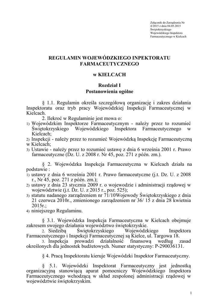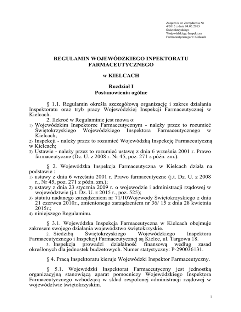Załącznik do Zarządzenia Nr 4/2015 z dnia 04.05.2015 Świętokrzyskiego Wojewódzkiego Inspektora Farmaceutycznego w Kielcach REGULAMIN WOJEWÓDZKIEGO INPEKTORATU FARMACEUTYCZNEGO w KIELCACH Rozdział I Postanowienia ogólne § 1.1. Regulamin określa szczegółową organizację i zakres działania Inspektoratu oraz tryb pracy Wojewódzkiej Inspekcji Farmaceutycznej w Kielcach. 2. Ilekroć w Regulaminie jest mowa o: 1) Wojewódzkim Inspektorze Farmaceutycznym - należy przez to rozumieć Świętokrzyskiego Wojewódzkiego Inspektora Farmaceutycznego w Kielcach; 2) Inspekcji - należy przez to rozumieć Wojewódzką Inspekcję Farmaceutyczną w Kielcach; 3) Ustawie - należy przez to rozumieć ustawę z dnia 6 września 2001 r. Prawo farmaceutyczne (Dz. U. z 2008 r. Nr 45, poz. 271 z późn. zm.). § 2. Wojewódzka Inspekcja Farmaceutyczna w Kielcach działa na podstawie : 1) ustawy z dnia 6 września 2001 r. Prawo farmaceutyczne (j.t. Dz. U. z 2008 r., Nr 45, poz. 271 z późn. zm.); 2) ustawy z dnia 23 stycznia 2009 r. o wojewodzie i administracji rządowej w województwie (j.t. Dz. U. z 2015 r., poz. 525); 3) statutu nadanego zarządzeniem nr 71/10Wojewody Świętokrzyskiego z dnia 21 czerwca 2010r., zmienionego zarządzeniem nr 36/ 15 z dnia 28 kwietnia 2015r.; 4) niniejszego Regulaminu. § 3.1. Wojewódzka Inspekcja Farmaceutyczna w Kielcach obejmuje zakresem swojego działania województwo świętokrzyskie. 2. Siedzibą Świętokrzyskiego Wojewódzkiego Inspektora Farmaceutycznego i Inspekcji Farmaceutycznej są Kielce, ul. Targowa 18. 3. Inspekcja prowadzi działalność finansową według zasad określonych dla jednostek budżetowych. Numer statystyczny: P-290036131. § 4. Pracą Inspektoratu kieruje Wojewódzki Inspektor Farmaceutyczny. § 5.1. Wojewódzki Inspektorat Farmaceutyczny jest jednostką organizacyjną stanowiącą aparat pomocniczy Wojewódzkiego Inspektora Farmaceutycznego wchodzącą w skład zespolonej administracji rządowej w województwie świętokrzyskim. 1 2. Schemat organizacyjny Wojewódzkiego Inspektoratu Farmaceutycznego w Kielcach przedstawia załącznik do Regulaminu. § 6.1. Wojewódzki Inspektor Farmaceutyczny wykonuje w imieniu Wojewody Świętokrzyskiego zadania i kompetencje Inspekcji Farmaceutycznej. 2. W sprawach związanych z wykonywaniem zadań i kompetencji Inspekcji Farmaceutycznej organem pierwszej instancji jest Wojewódzki Inspektor Farmaceutyczny, a jako organ odwoławczy Główny Inspektor Farmaceutyczny. 3. Wojewódzki Inspektor Farmaceutyczny w zakresie ustalonym w ustawie i przepisach odrębnych: 1) wydaje decyzje dotyczące udzielenia, zmiany, cofnięcia, odmowy udzielenia lub stwierdzenia wygaśnięcia zezwolenia na prowadzenie apteki i punktu aptecznego, wyraża zgodę na uruchomienie apteki szpitalnej; 2) wydaje decyzje w zakresie wstrzymania lub wycofania z obrotu lub stosowania w zakładach opieki zdrowotnej produktów leczniczych w przypadku podejrzenia lub stwierdzenia że dany produkt nie jest dopuszczony do obrotu w Polsce; 3) wydaje decyzje o wstrzymaniu lub wycofaniu z obrotu lub stosowania w zakładach opieki zdrowotnej na terenie województwa produktów leczniczych w przypadku podejrzenia lub stwierdzenia, że dany produkt lub wyrób nie odpowiada ustalonym dla niego wymaganiom jakościowym; 4) wydaje decyzje o wstrzymaniu lub wycofaniu z aptek ogólnodostępnych i hurtowni farmaceutycznych na terenie województwa towarów którymi obrót jest niedozwolony; 5) w razie stwierdzenia naruszenia wymagań dotyczących warunków przechowywania i obrotu produktami leczniczymi i wyrobami medycznymi nakazuje w drodze decyzji usunięcie w ustalonym terminie stwierdzonych uchybień; 6) opiniuje sposób zabezpieczenia, wyraża zgodę i wydaje zezwolenia w zakresie wynikającym z przepisów o przeciwdziałaniu narkomanii; 7) wydaje decyzje zaprzestania prowadzenia działalności reklamowej aptek i punktów aptecznych niezgodnej z przepisami ustawy. 4. W czasie nieobecności Wojewódzkiego Inspektora Farmaceutycznego jego zadania i kompetencje przejmuje wyznaczony inspektor farmaceutyczny. Rozdział II Zadania Wojewódzkiej Inspekcji Farmaceutycznej § 7.1. Do zadań Wojewódzkiej Inspekcji Farmaceutycznej w Kielcach należy sprawowanie nadzoru nad jakością i obrotem produktami leczniczymi oraz wyrobami medycznymi w celu zabezpieczenia interesu społecznego w zakresie bezpieczeństwa zdrowia i życia ludzi przy stosowaniu produktów leczniczych i wyrobów medycznych, znajdujących się w aptekach, działach farmacji szpitalnej, punktach aptecznych i placówkach obrotu pozaaptecznego, a w szczególności: 1) kontrolowanie warunków transportu, przeładunku i przechowywania 2 produktów leczniczych i wyrobów medycznych; sprawowanie nadzoru nad jakością produktów leczniczych będących przedmiotem obrotu; 3) kontrolowanie aptek i innych jednostek prowadzących obrót detaliczny produktami leczniczymi i wyrobami medycznymi; 4) kontrolowanie stacji sanitarno-epidemiologicznych, o których mowa w art. 18 ust. 6 ustawy z dnia 5 grudnia 2008 r. o zapobieganiu oraz zwalczaniu zakażeń i chorób zakaźnych u ludzi – w zakresie wymagań jakościowych oraz przechowywania i przekazywania szczepionek zgodnie z procedurami Dobrej Praktyki Dystrybucyjnej; 5) kontrolowanie jakości leków recepturowych i aptecznych sporządzanych w aptekach; 6) kontrolowanie właściwego oznakowania i reklamy produktów leczniczych oraz właściwego oznakowania wyrobów medycznych; 7) kontrolowanie obrotu środkami odurzającymi, substancjami psychotropowymi i prekursorami grupy I-R; 8) współpraca ze specjalistycznym zespołem konsultantów do spraw farmacji; 9) opiniowanie przydatności lokalu przeznaczonego na aptekę, punkt apteczny lub placówkę obrotu pozaaptecznego; 10) współpraca z samorządem aptekarskim i innymi samorządami; 11) prowadzenie rejestru aptek ogólnodostępnych, punktów aptecznych, rejestru udzielanych zgód na prowadzenie aptek 