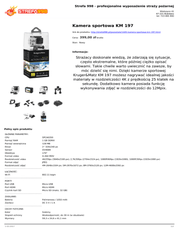 Strefa 998 - profesjonalne wyposażenie straży pożarnej Wietszyce 41 67-221 Białołęka tel: 723 895 900 Kamera sportowa KM 197 link do produktu: http://strefa998.pl/pozostale/1445-kamera-sportowa-km-197.html Cena: 399,00 zł brutto Stan: Nowy Informacje: Strażacy doskonale wiedzą, że zdarzają się sytuacje, często ekstremalne, które później ciężko opisać słowami. Takie chwile warto uwiecznić na zawsze, by móc dzielić się nimi. Dzięki kamerze sportowej Kruger&Matz KM 197 możesz nagrywać idealnej jakości materiały w rozdzielczości 4K z prędkością 25 klatek na sekundę. Dodatkowo kamera posiada funkcję wykonywania zdjęć w rozdzielczości do 12Mpix. Pełny opis produktu GŁÓWNE PARAMETRY: CPU SPCA6350 Pamięć RAM 1 GB DDRIII Pamięć wewnętrzna 128 MB Ekran 2'' 320x240 px Sensor OV4689 Obiektyw 170° Format video H.264 MOV Rozdzielczość video 4K/25fps (3840x2160 px); 2,7K/30fps (2704x1524 px), 1080P/60fps (1920x1080), 1080P/30fps (1920x1080 px) Format zdjęć JPEG Rozdzielczość zdjęć 4M-2648x1504 px; 5M-2976x1672 px; 8M-3760x2120 px; 12M-4608x2592 px -------------------------ŁĄCZNOŚĆ: Wi-Fi 802.11 b/g/n -------------------------PORTY Port USB Micro USB Port HDMI Micro HDMI Czytnik kart SD Micro SD (maks. 32 GB) -------------------------ZASILANIE: Bateria Polimerowa / 1050 mAh Zasilacz DC 5 V / 1 A -------------------------CECHY FIZYCZNE: Kolor Srebrny Stopień ochrony Wodoodporność, do 30 m (w obudowie) Wymiary 59,3 x 24,6 x 41,1 mm 1-03-2017 1/2 Waga 1-03-2017 65 g (z baterią) 2/2
