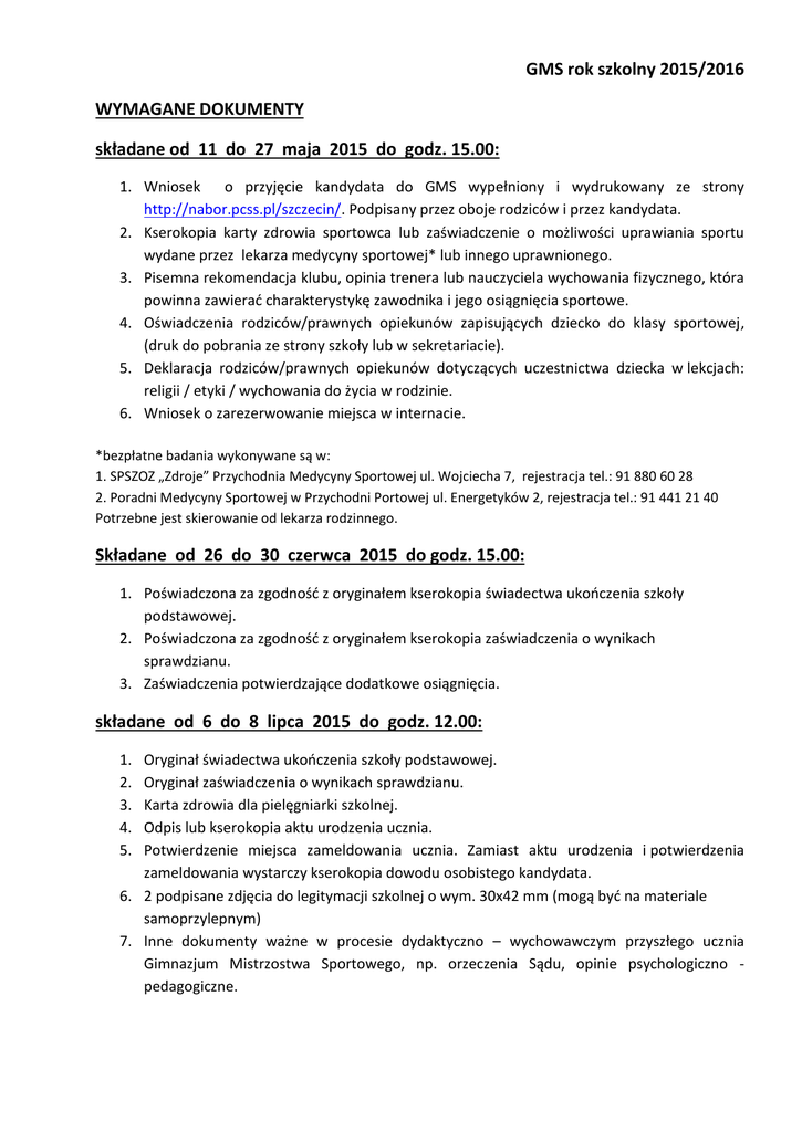 GMS rok szkolny 2015/2016 WYMAGANE DOKUMENTY składane