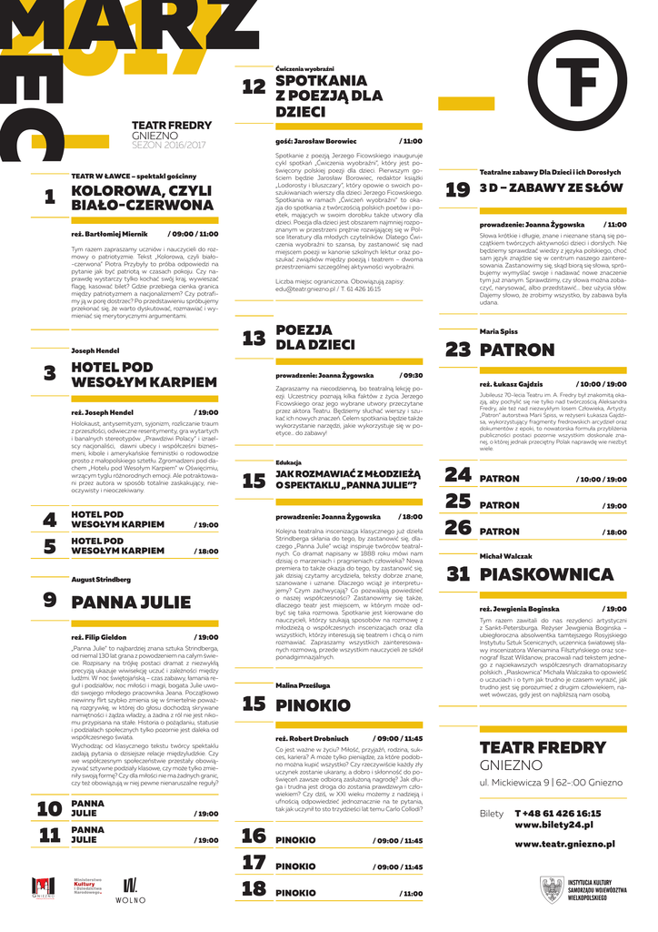 EC MARZ 2017 12 / 09:00 / 11:00 Tym razem zapraszamy uczniów i nauczycieli do rozmowy o patriotyzmie. Tekst „Kolorowa, czyli biało-czerwona” Piotra Przybyły to próba odpowiedzi na pytanie jak być patriotą w czasach pokoju. Czy naprawdę wystarczy tylko kochać swój kraj, wywieszać flagę, kasować bilet? Gdzie przebiega cienka granica między patriotyzmem a nacjonalizmem? Czy potrafimy ją w porę dostrzec? Po przedstawieniu spróbujemy przekonać się, że warto dyskutować, rozmawiać i wymieniać się merytorycznymi argumentami. 3 HOTEL POD WESOŁYM KARPIEM reż. Joseph Hendel 4 5 HOTEL POD WESOŁYM KARPIEM / 19:00 HOTEL POD WESOŁYM KARPIEM / 18:00 „Panna Julie” to najbardziej znana sztuka Strindberga, od niemal 130 lat grana z powodzeniem na całym świecie. Rozpisany na trójkę postaci dramat z niezwykłą precyzją ukazuje wiwisekcję uczuć i zależności między ludźmi. W noc świętojańską – czas zabawy, łamania reguł i podziałów; noc miłości i magii, bogata Julie uwodzi swojego młodego pracownika Jeana. Początkowo niewinny flirt szybko zmienia się w śmiertelnie poważną rozgrywkę, w której do głosu dochodzą skrywane namiętności i żądza władzy, a żadna z ról nie jest nikomu przypisana na stałe. Historia o pożądaniu, statusie i podziałach społecznych tylko pozornie jest daleka od współczesnego świata. Wychodząc od klasycznego tekstu twórcy spektaklu zadają pytania o dzisiejsze relacje międzyludzkie. Czy we współczesnym społeczeństwie przestały obowiązywać sztywne podziały klasowe, czy może tylko zmieniły swoją formę? Czy dla miłości nie ma żadnych granic, czy też obowiązują w niej pewne nienaruszalne reguły? 10 11 PANNA JULIE PANNA JULIE 15 JAK ROZMAWIAĆ Z MŁODZIEŻĄ O SPEKTAKLU „PANNA JULIE”? / 18:00 Malina Prześluga PINOKIO reż. Robert Drobniuch / 09:00 / 11:45 Co jest ważne w życiu? Miłość, przyjaźń, rodzina, sukces, kariera? A może tylko pieniądze, za które podobno można kupić wszystko? Czy rzeczywiście każdy zły uczynek zostanie ukarany, a dobro i skłonność do poświęceń zawsze odbiorą zasłużoną nagrodę? Jak długa i trudna jest droga do zostania prawdziwym człowiekiem? Czy dziś, w XXI wieku możemy z nadzieją i ufnością odpowiedzieć jednoznacznie na te pytania, tak jak uczynił to sto trzydzieści lat temu Carlo Collodi? / 19:00 / 19:00 Słowa krótkie i długie, znane i nieznane staną się początkiem twórczych aktywności dzieci i dorsłych. Nie będziemy sprawdzać wiedzy z języka polskiego, choć sam język znajdzie się w centrum naszego zainteresowania. Zastanowimy się, skąd biorą się słowa, spróbujemy wymyślać swoje i nadawać nowe znaczenie tym już znanym. Sprawdzimy, czy słowa można zobaczyć, narysować, albo przedstawić... bez użycia słów. Dajemy słowo, że zrobimy wszystko, by zabawa była udana. / 09:30 Kolejna teatralna inscenizacja klasycznego już dzieła Strindberga skłania do tego, by zastanowić się, dlaczego „Panna Julie” wciąż inspiruje twórców teatralnych. Co dramat napisany w 1888 roku mówi nam dzisiaj o marzeniach i pragnieniach człowieka? Nowa premiera to także okazja do tego, by zastanowić się, jak dzisiaj czytamy arcydzieła, teksty dobrze znane, szanowane i uznane. Dlaczego wciąż je interpretujemy? Czym zachwycają? Co pozwalają powiedzieć o naszej współczesności? Zastanowimy się także, dlaczego teatr jest miejscem, w którym może odbyć się taka rozmowa. Spotkanie jest kierowane do nauczycieli, którzy szukają sposobów na rozmowę z młodzieżą o współczesnych inscenizacjach oraz dla wszystkich, którzy interesują się teatrem i chcą o nim rozmawiać. Zapraszamy wszystkich zainteresowanych rozmową, przede wszystkim nauczycieli ze szkół ponadgimnazjalnych. / 19:00 16 17 18 / 11:00 23 PATRON prowadzenie: Joanna Żygowska 9 PANNA JULIE 3 D – ZABAWY ZE SŁÓW Maria Spiss Edukacja 15 Teatralne zabawy Dla Dzieci i ich Dorosłych prowadzenie: Joanna Żygowska reż. Łukasz Gajdzis Zapraszamy na niecodzienną, bo teatralną lekcję poezji. Uczestnicy poznają kilka faktów z życia Jerzego Ficowskiego oraz jego wybrane utwory przeczytane przez aktora Teatru. Będziemy słuchać wierszy i szukać ich nowych znaczeń. Celem spotkania będzie także wykorzystanie narzędzi, jakie wykorzystuje się w poetyce… do zabawy! August Strindberg reż. Filip Gieldon POEZJA DLA DZIECI prowadzenie: Joanna Żygowska / 19:00 Holokaust, antysemityzm, syjonizm, rozliczanie traum z przeszłości, odwieczne resentymenty, gra wytartych i banalnych stereotypów. „Prawdziwi Polacy” i izraelscy nacjonaliści, dawni ubecy i współcześni biznesmeni, kibole i amerykańskie feministki o rodowodzie prosto z małopolskiego sztetłu. Zgromadzeni pod dachem „Hotelu pod Wesołym Karpiem” w Oświęcimiu, wrzącym tyglu różnorodnych emocji. Ale potraktowani przez autora w sposób totalnie zaskakujący, nieoczywisty i nieoczekiwany. 19 Liczba miejsc ograniczona. Obowiązują zapisy: [email protected] / T. 61 426 16:15 13 Joseph Hendel / 11:00 Spotkanie z poezją Jerzego Ficowskiego inauguruje cykl spotkań „Ćwiczenia wyobraźni”, który jest poświęcony polskiej poezji dla dzieci. Pierwszym gościem będzie Jarosław Borowiec, redaktor książki „Lodorosty i bluszczary”, który opowie o swoich poszukiwaniach wierszy dla dzieci Jerzego Ficowskiego. Spotkania w ramach „Ćwiczeń wyobraźni” to okazja do spotkania z twórczością polskich poetów i poetek, mających w swoim dorobku także utwory dla dzieci. Poezja dla dzieci jest obszarem najmniej rozpoznanym w przestrzeni prężnie rozwijającej się w Polsce literatury dla młodych czytelników. Dlatego Ćwiczenia wyobraźni to szansa, by zastanowić się nad miejscem poezji w kanonie szkolnych lektur oraz poszukać związków między poezją i teatrem – dwoma przestrzeniami szczególnej aktywności wyobraźni. KOLOROWA, CZYLI BIAŁO-CZERWO